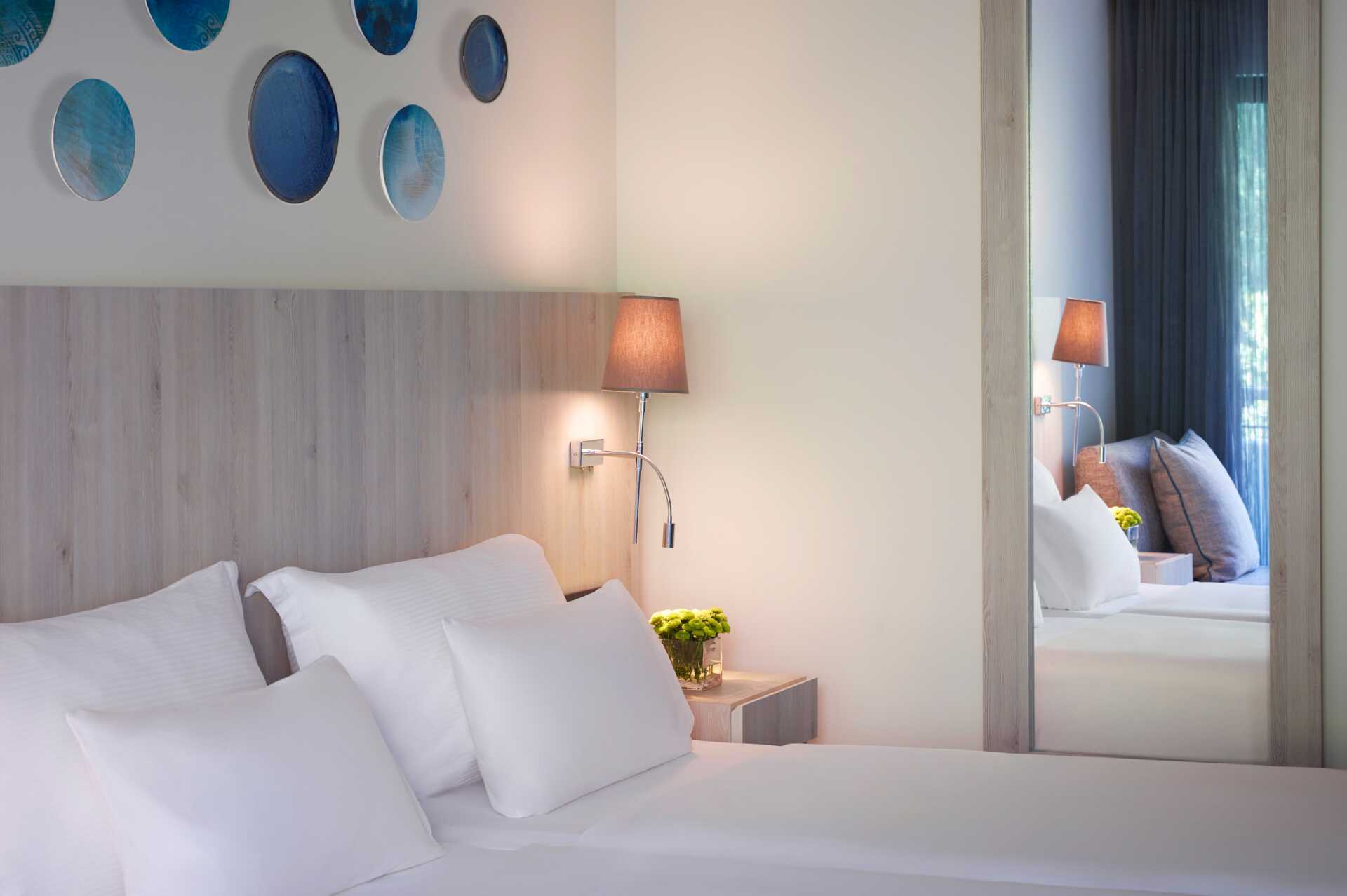 Dobbeltrom med balkong. En dobbeltseng eller to enkeltsenger. Mulig med ekstraseng i sovesofa. Wifi, luftkondisjonering og safe inkludert. Kjøleskap. Vannkoker samt kaffe og te. TV. Badekåper og tøfler. Hårføner, bad med badekar og wc. Rengjøring 7 ggr/uke.