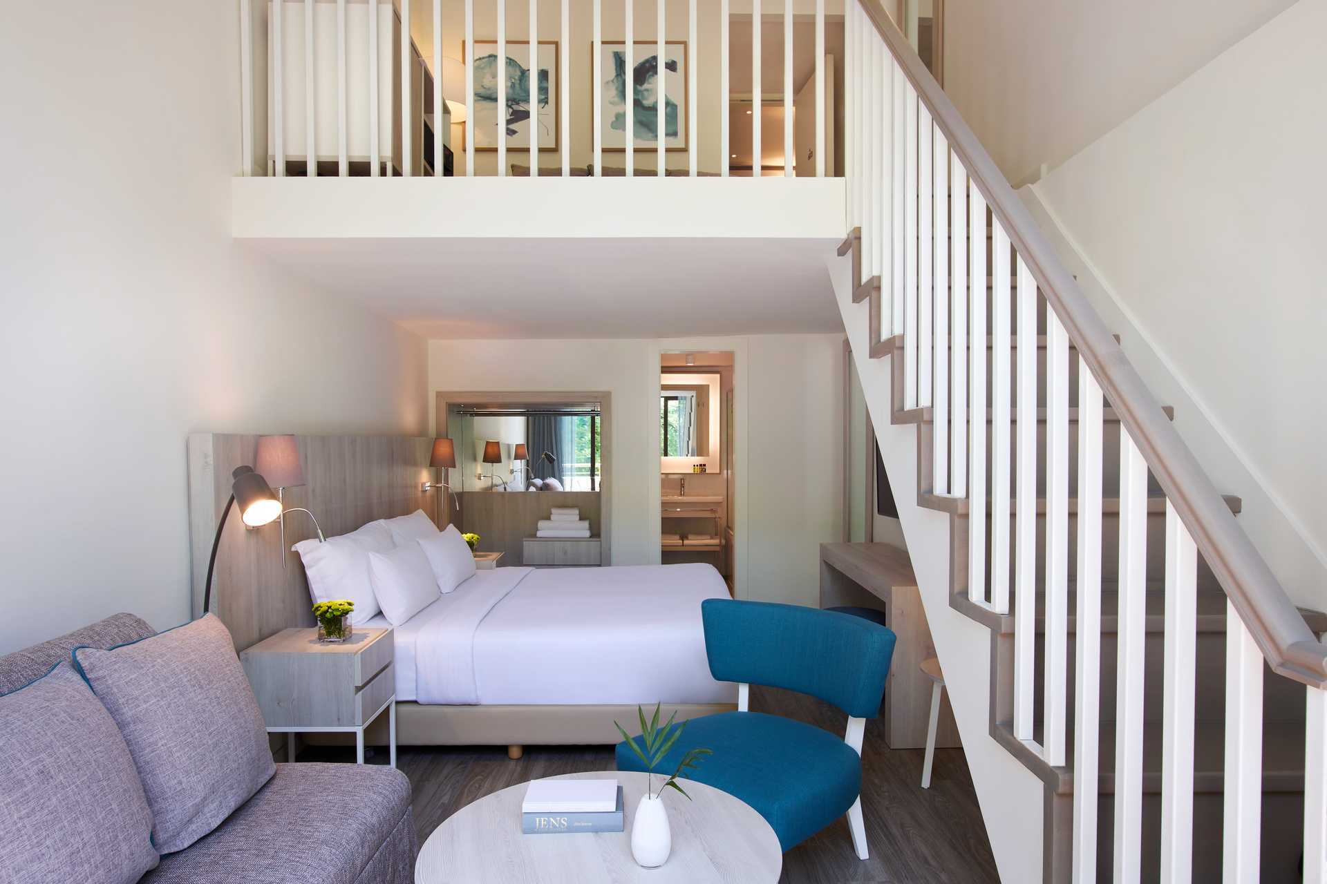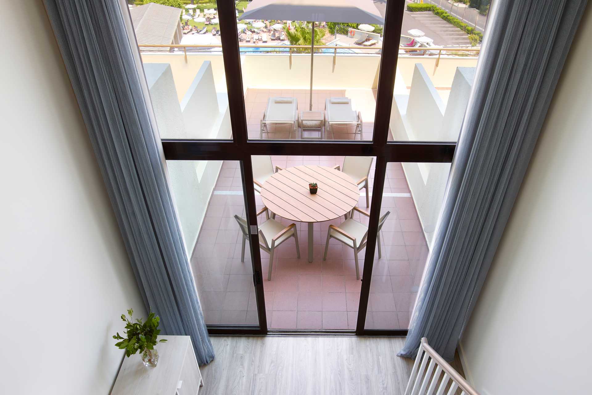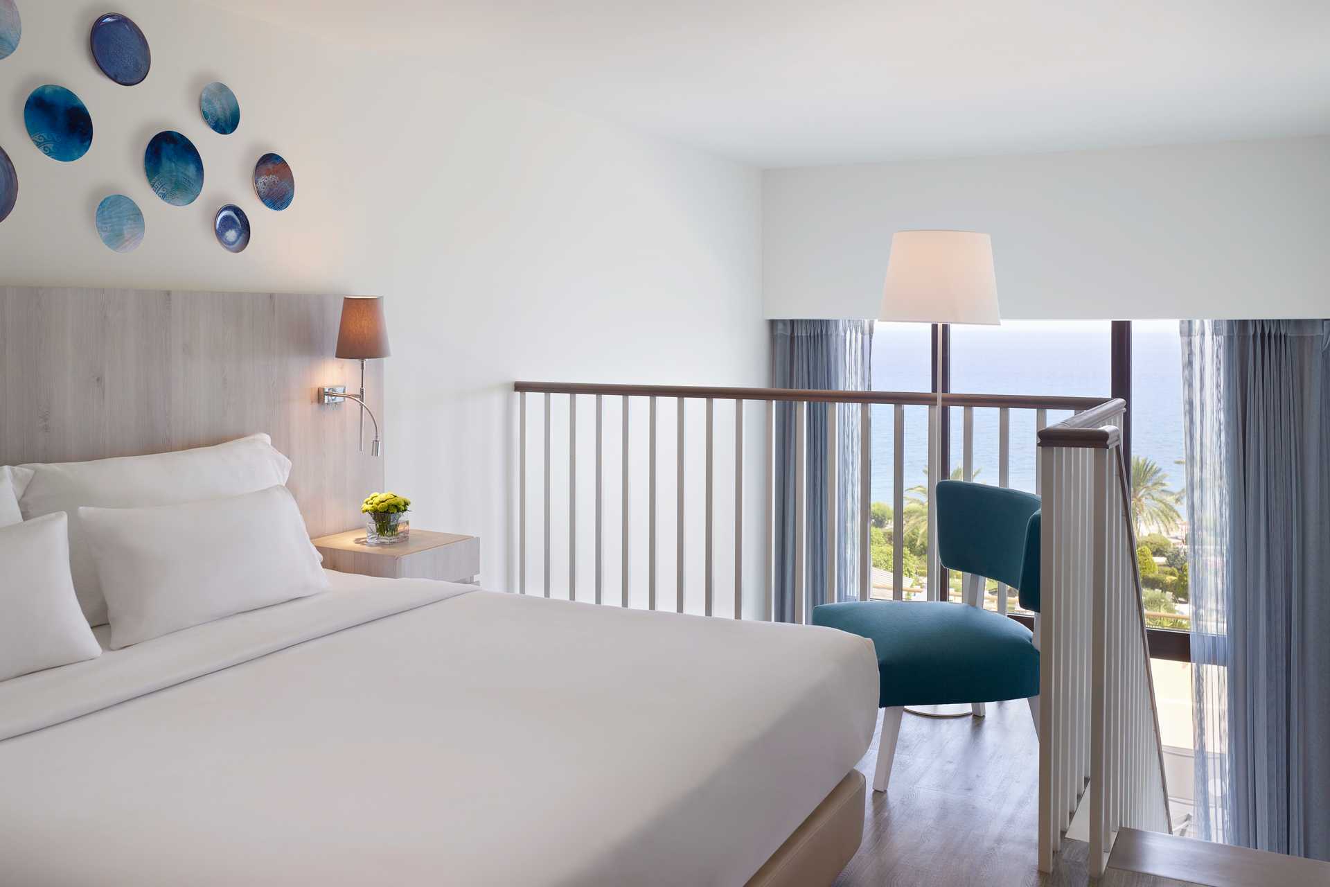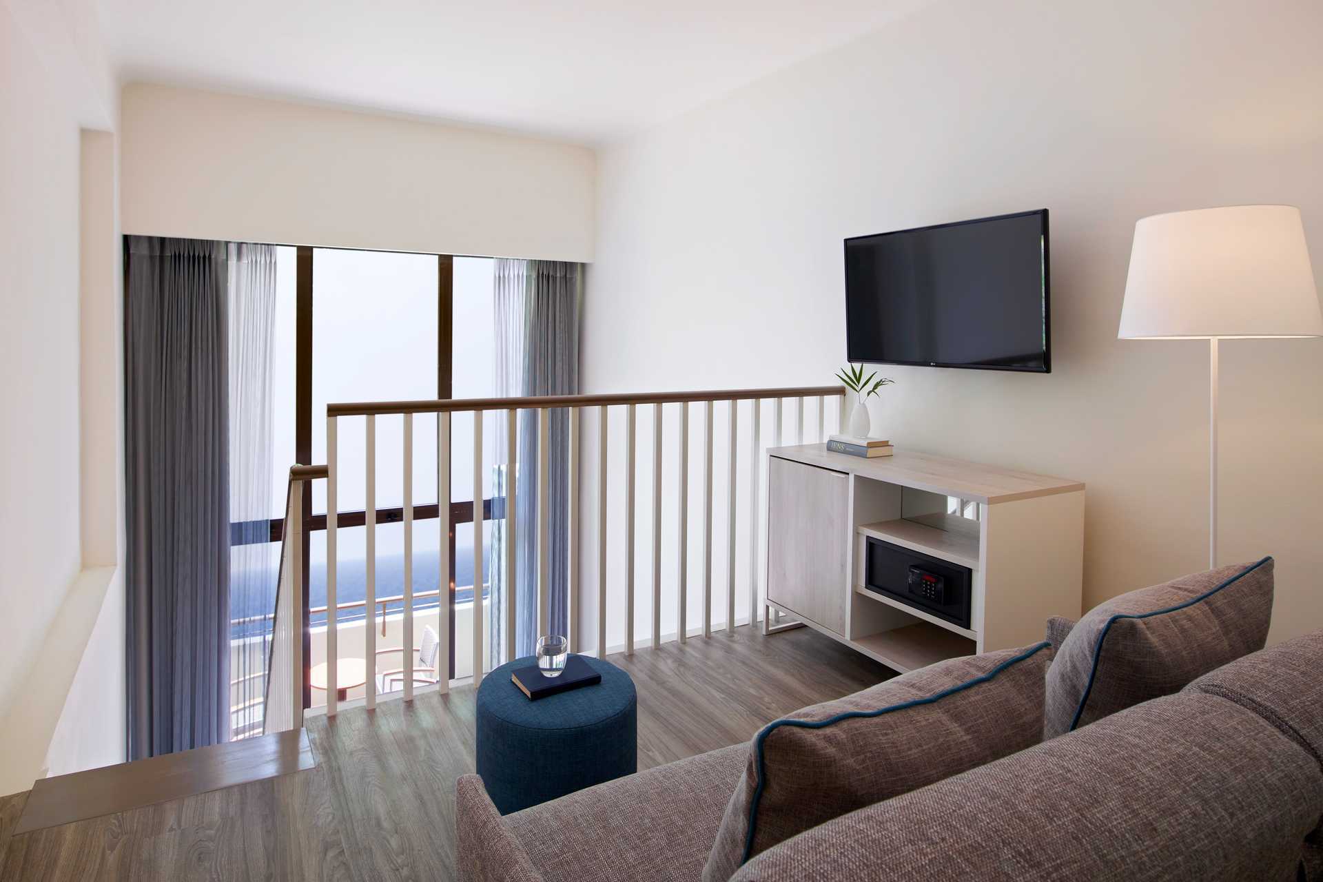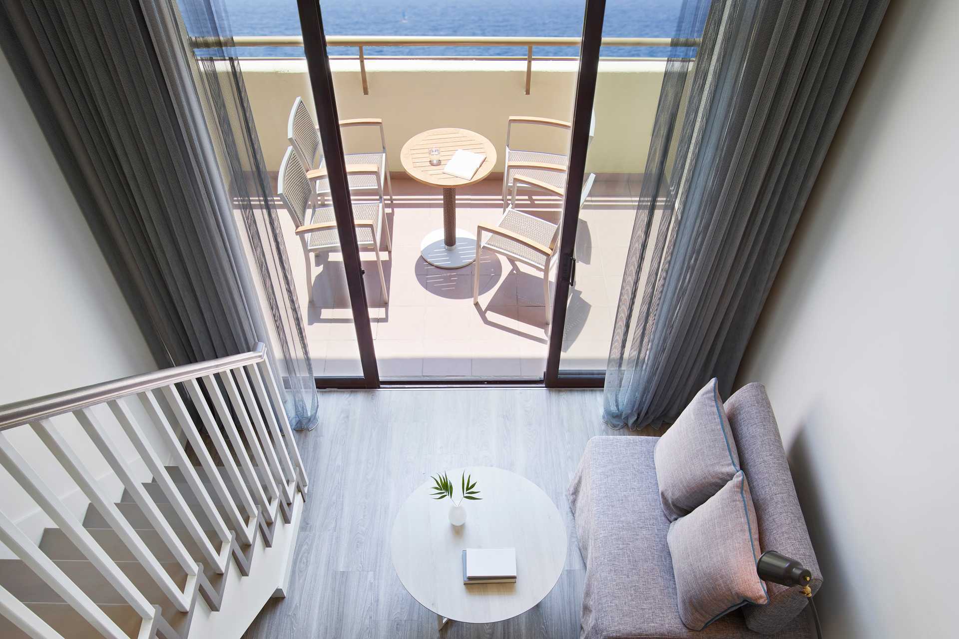 Familierom i etasje med balkong, store panoramavinduer og havutsikt. Det er oppholdsrom i inngangsetasjen med sovesofa og et bad med dusj og wc. En trapp opp er det en soveromsdel med dobbeltseng eller to enkeltsenger samt et bad med badekar og wc. Det er åpent mellom etasjene. En TV i hver etasje. Wifi, luftkondisjonering og safe inkludert. Kjøleskap. Vannkoker samt kaffe og te. Nespresso kaffemaskin. Badekåper og tøfler. Hårføner. Rengjøring 7 ggr/uke. Barn under 2 år regnes inn i maksantallet i rommet.