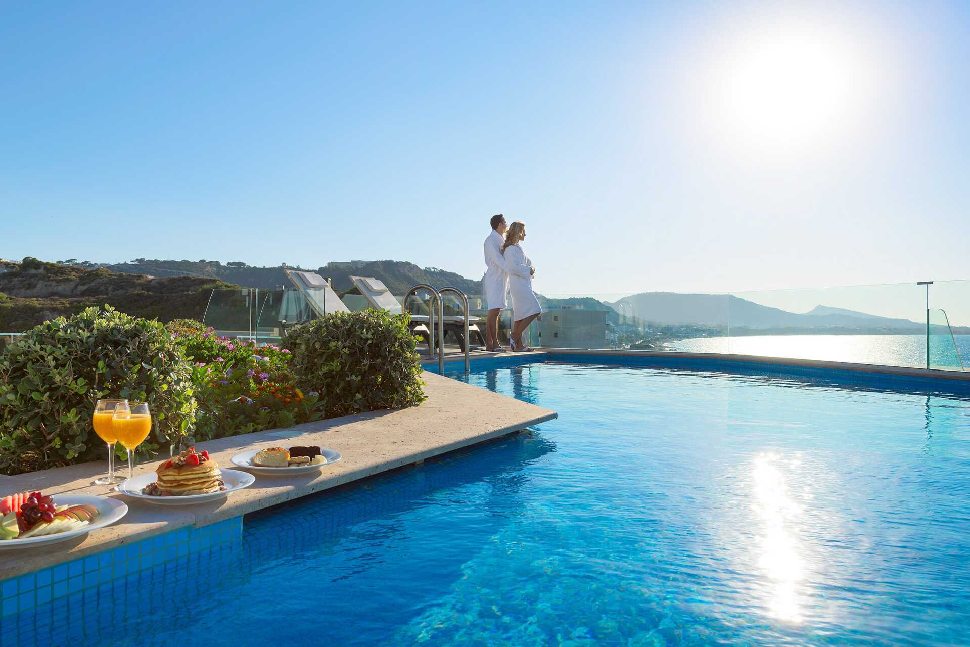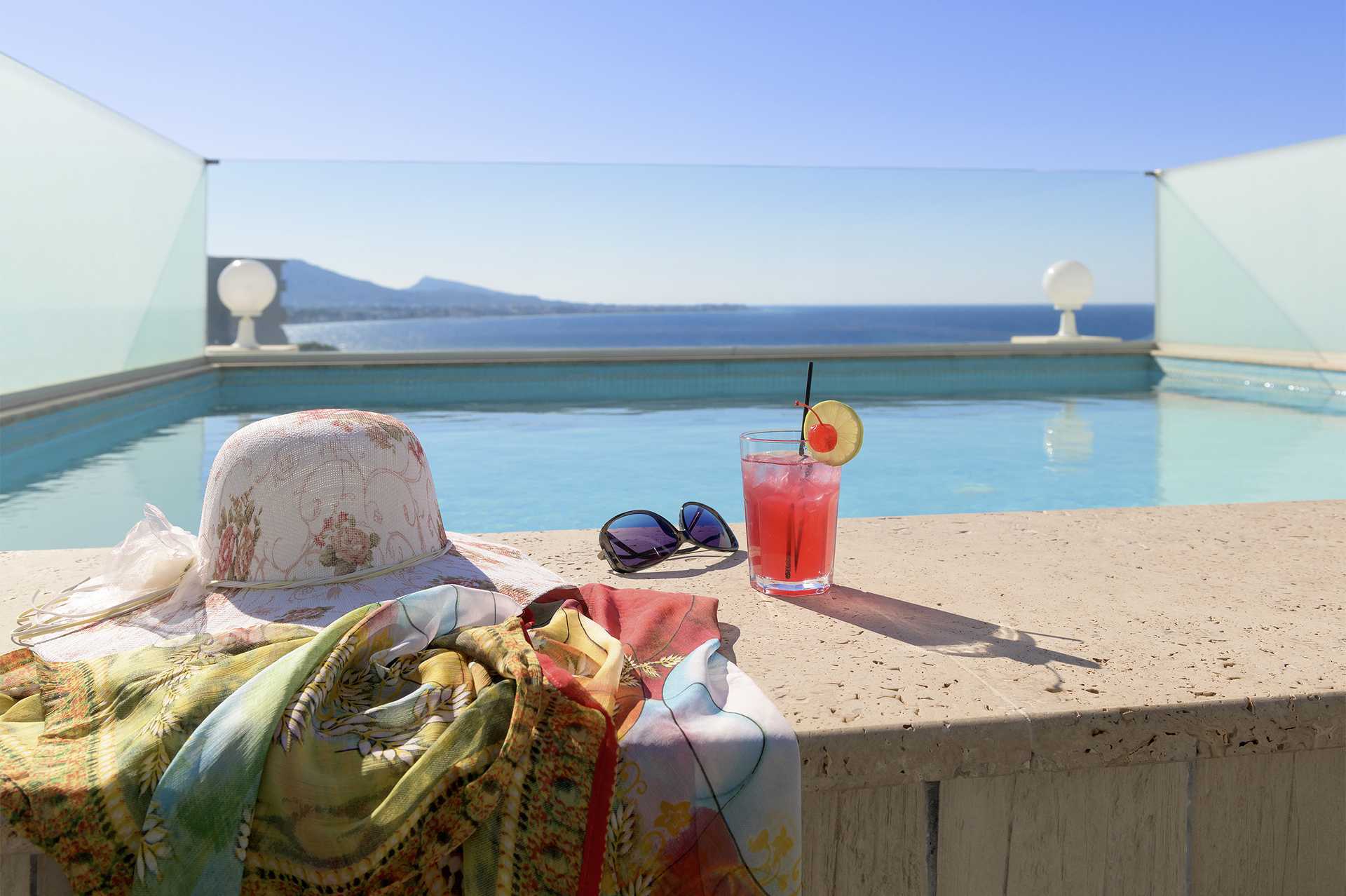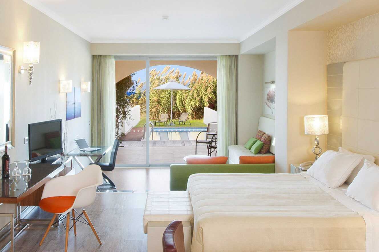 Deluxerom med uteplass med utgang til eget basseng med solsenger og havutsikt. Liten trapp fra terrassen opp til bassenget. En dobbeltseng eller to enkeltsenger. Mulig med en ekstraseng i sovesofa. Wifi, luftkondisjonering og safe inkludert. Minibar mot avgift. Nespresso kaffemaskin, fire kapsler inkludert per dag. TV. Badekåper og tøfler. Hårføner. Bad med to servanter, jacuzzibadekar, dusj og wc. Rengjøring 7 ggr/uke.