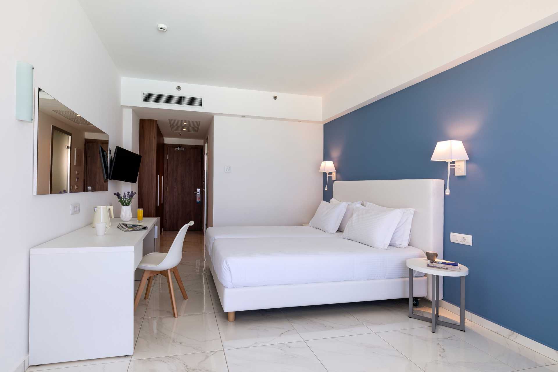 Deluxerom med balkong eller terrasse, noen med havutsikt. En dobbeltseng eller to enkeltsenger. Mulig med en ekstraseng i sovesofa. Wifi og luftkondisjonering er inkludert. Luftkondisjonering i juni-september. Safe mot avgift. Kjøleskap. Vannkoker samt kaffe og te. TV. Strykejern og strykebrett. Hårføner. Baderom med dusj og wc. Rengjøring 6 ggr/uke.