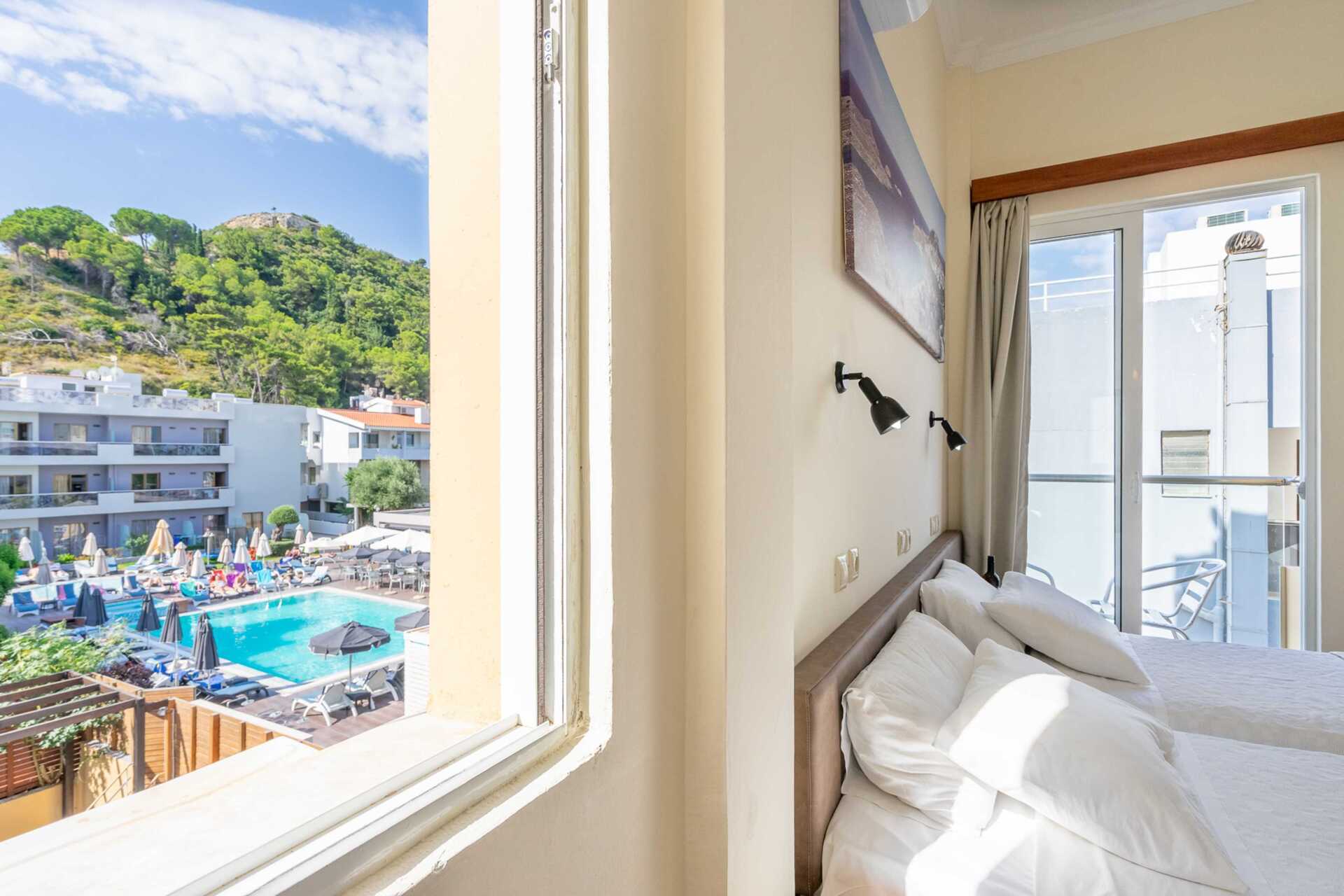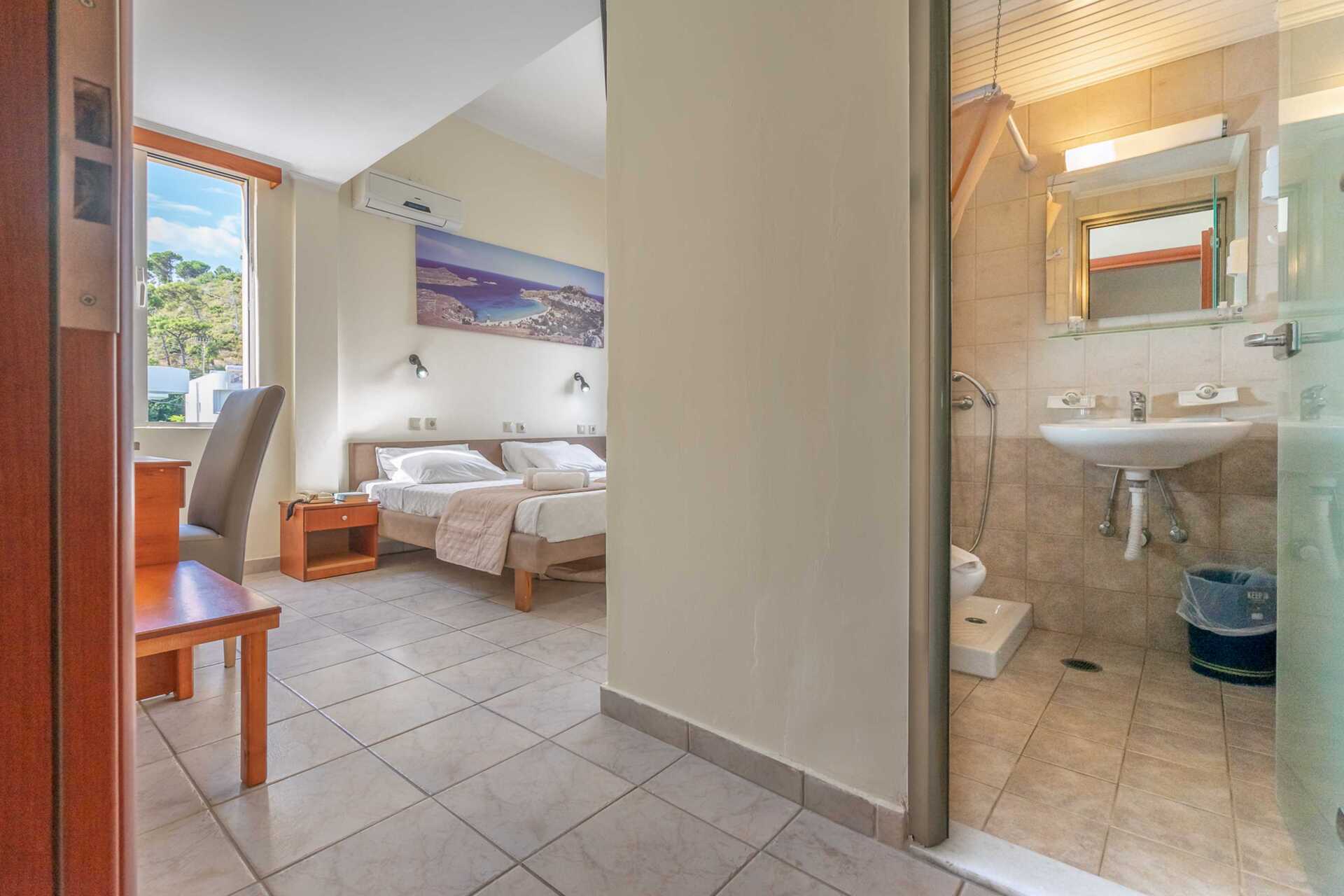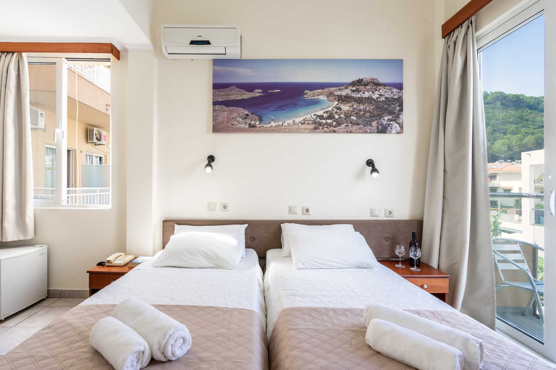 Dobbeltrom med balkong. En dobbeltseng eller to enkeltsenger. Wifi, luftkondisjonering og safe inkludert. Safe mot avgift. Kjøleskap. TV. Hårføner. Dusj og wc. Rengjøring 6 ggr/uke.