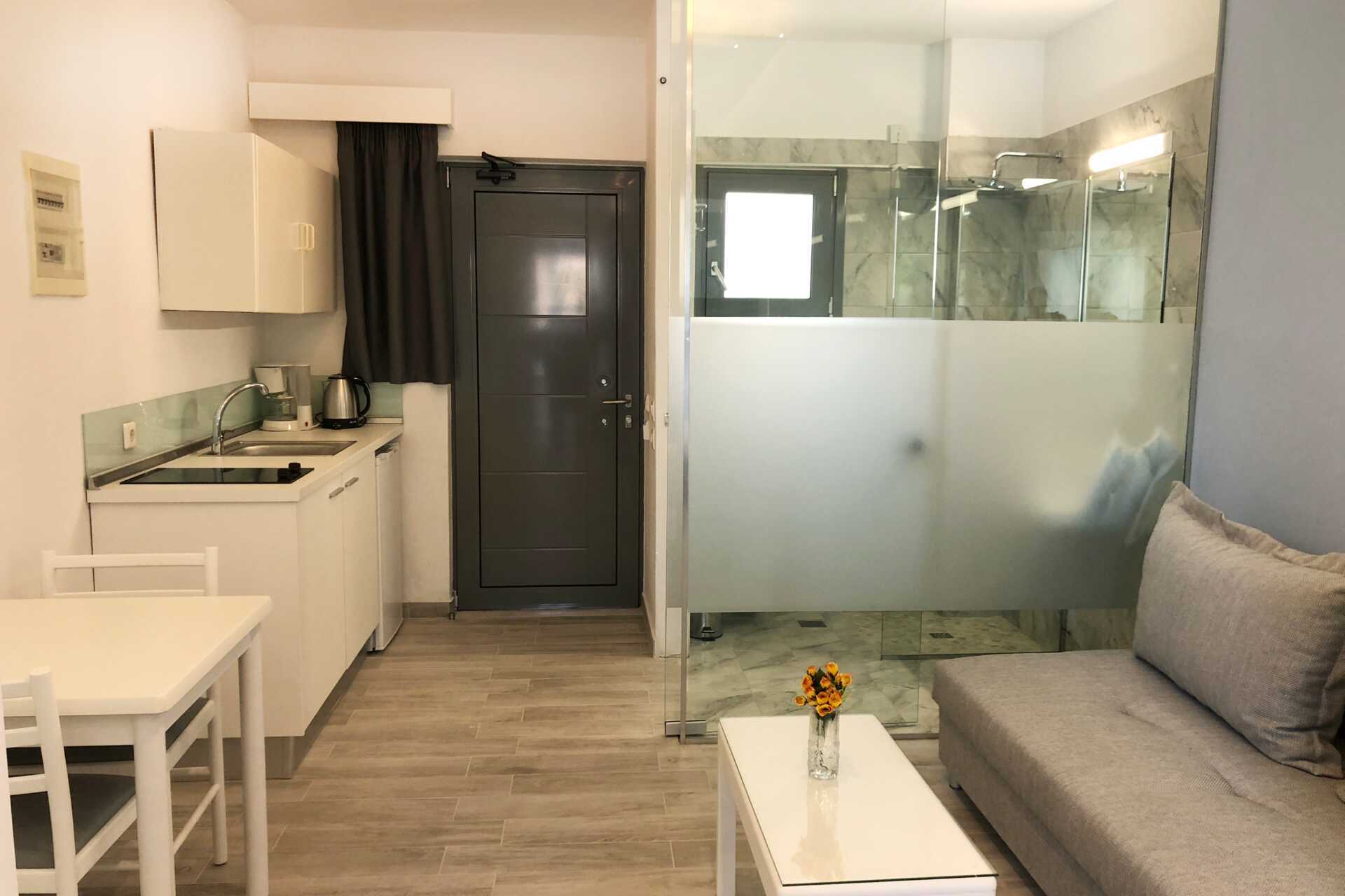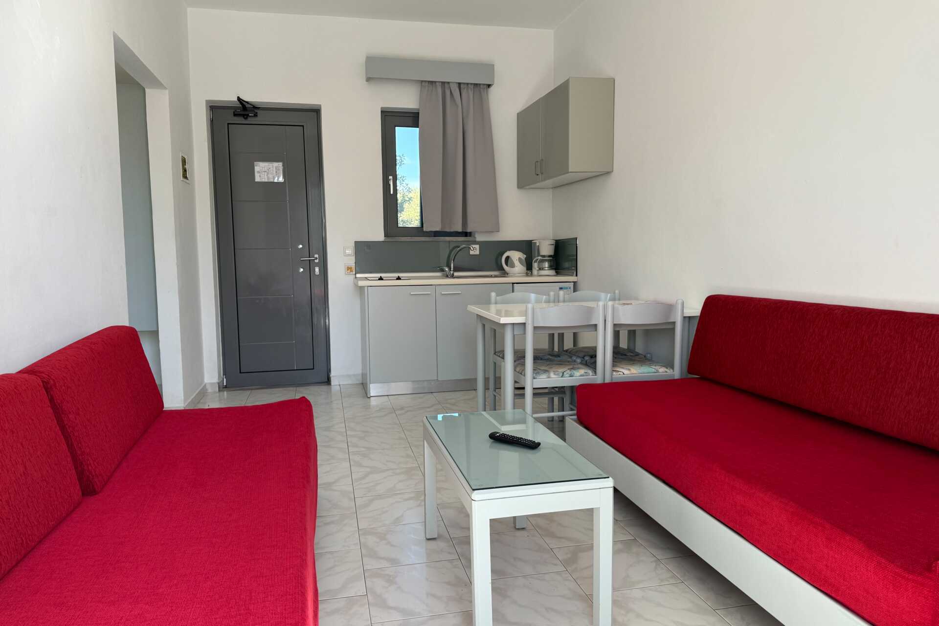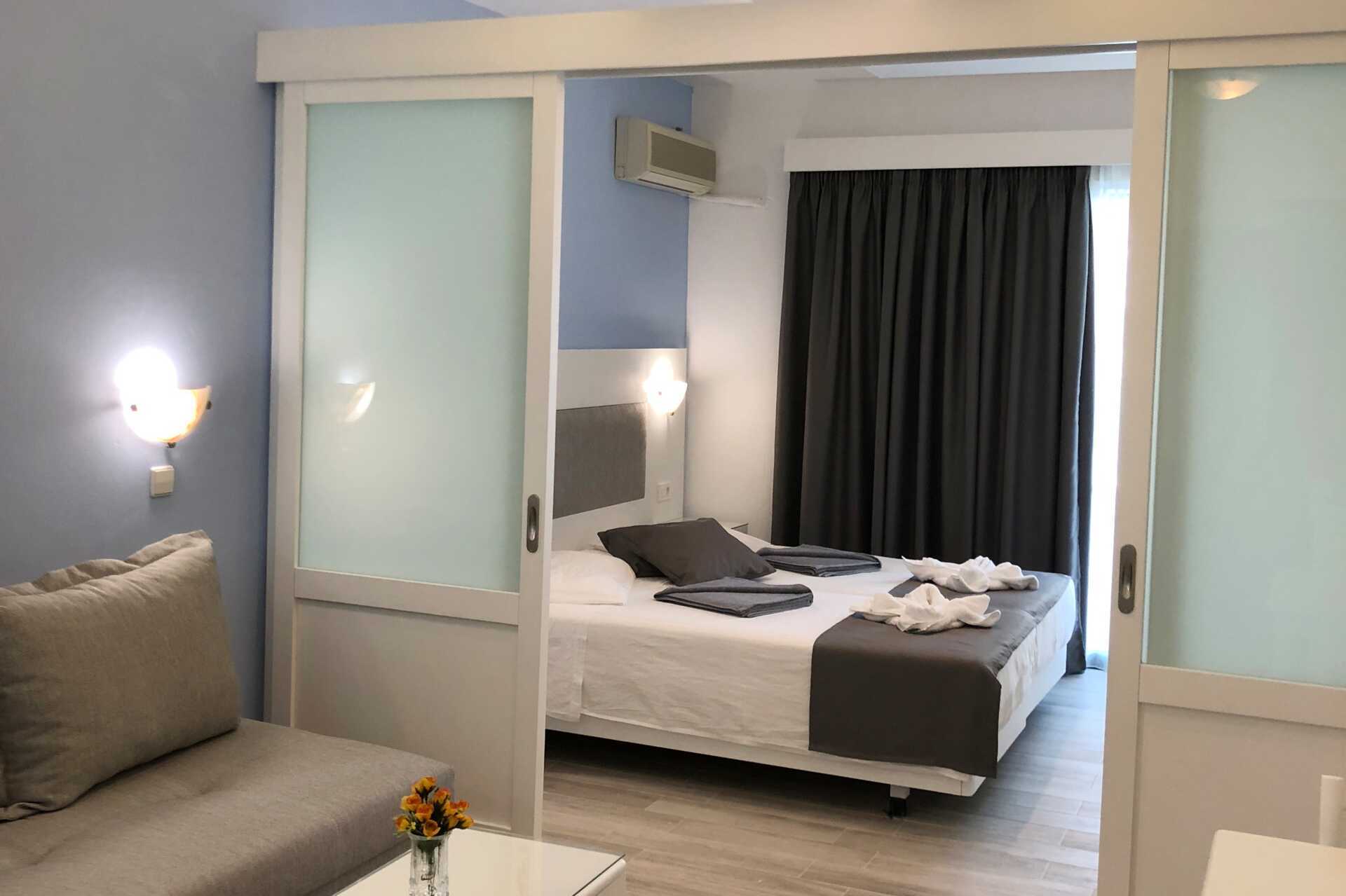 Toromsleilighet med balkong og bassengutsikt. Et soverom og stue med minikjøkken. Noen av leilighetene har frostet glassvegg som skille mellom rommene, veggen går ikke helt i tak. To enkeltsenger eller en dobbeltseng. Mulig med ekstrasenger i to sovesofaer. Minikjøkken med kokeplater, kjøleskap, vannkoker, kaffetrakter og enkelt kjøkkenutstyr. Wifi, luftkondisjonering og safe inkludert. TV. Hårføner. Badekar eller dusj samt wc. Rengjøring 5 ggr/uke.
