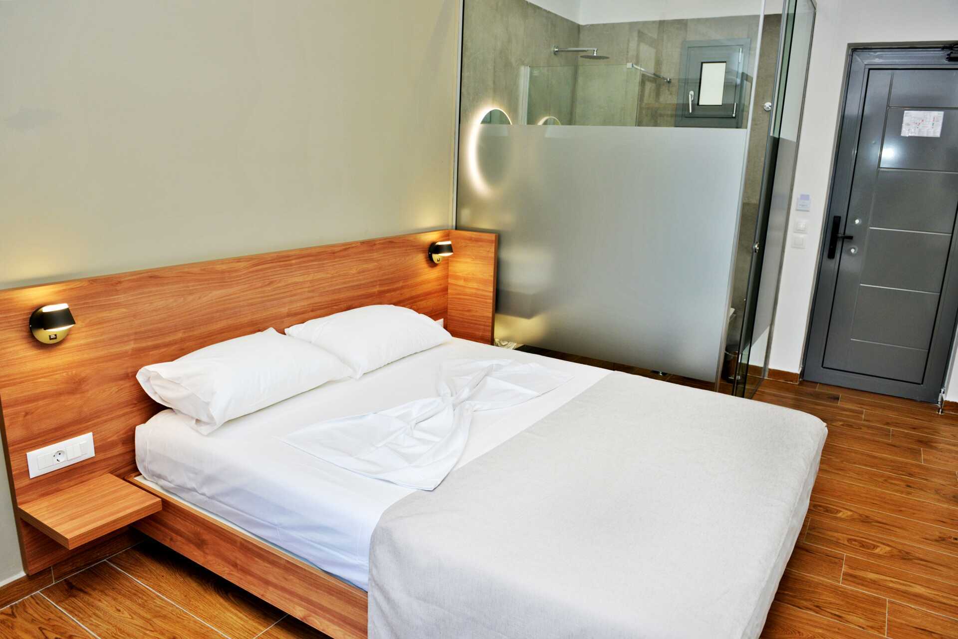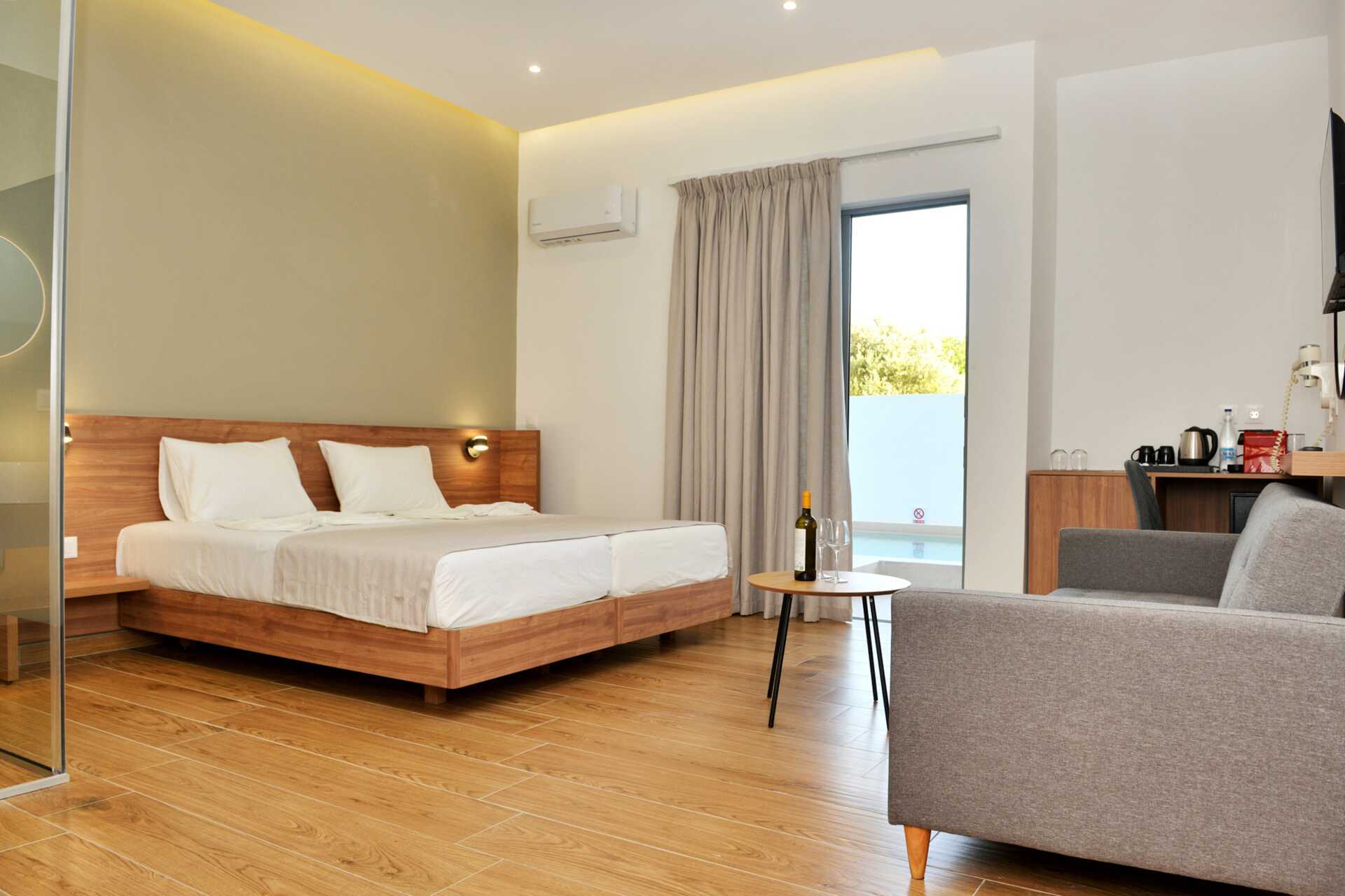 Dobbeltrom med terrasse og utgang til delt basseng. Rommet vender mot bassengområdet på baksiden av hotellet. To enkeltsenger eller en dobbeltseng. Wifi, luftkondisjonering og safe inkludert. TV. Hårføner. Glassvegg til bad med badekar eller dusj og wc. Rengjøring 5 ggr/uke.