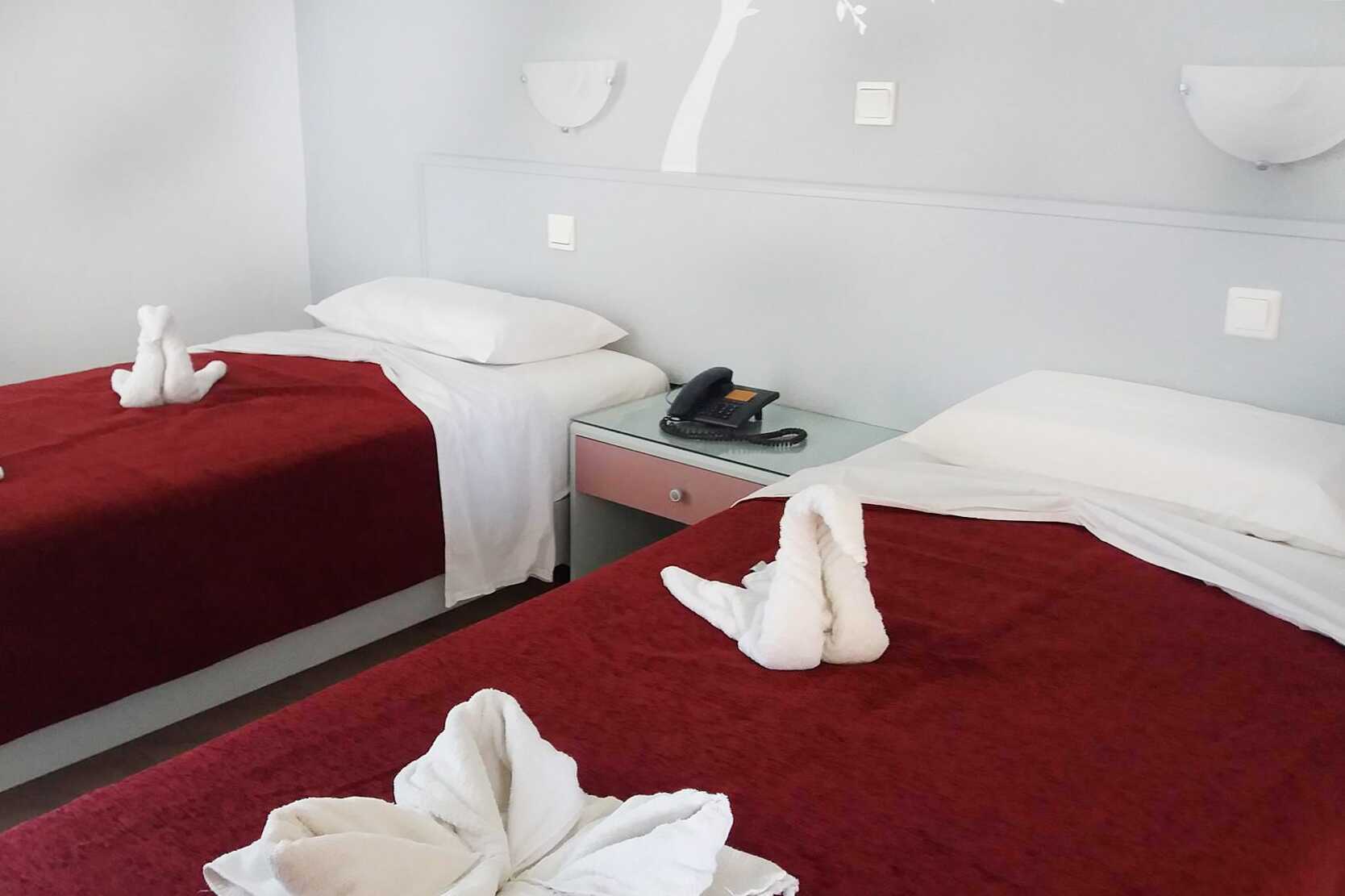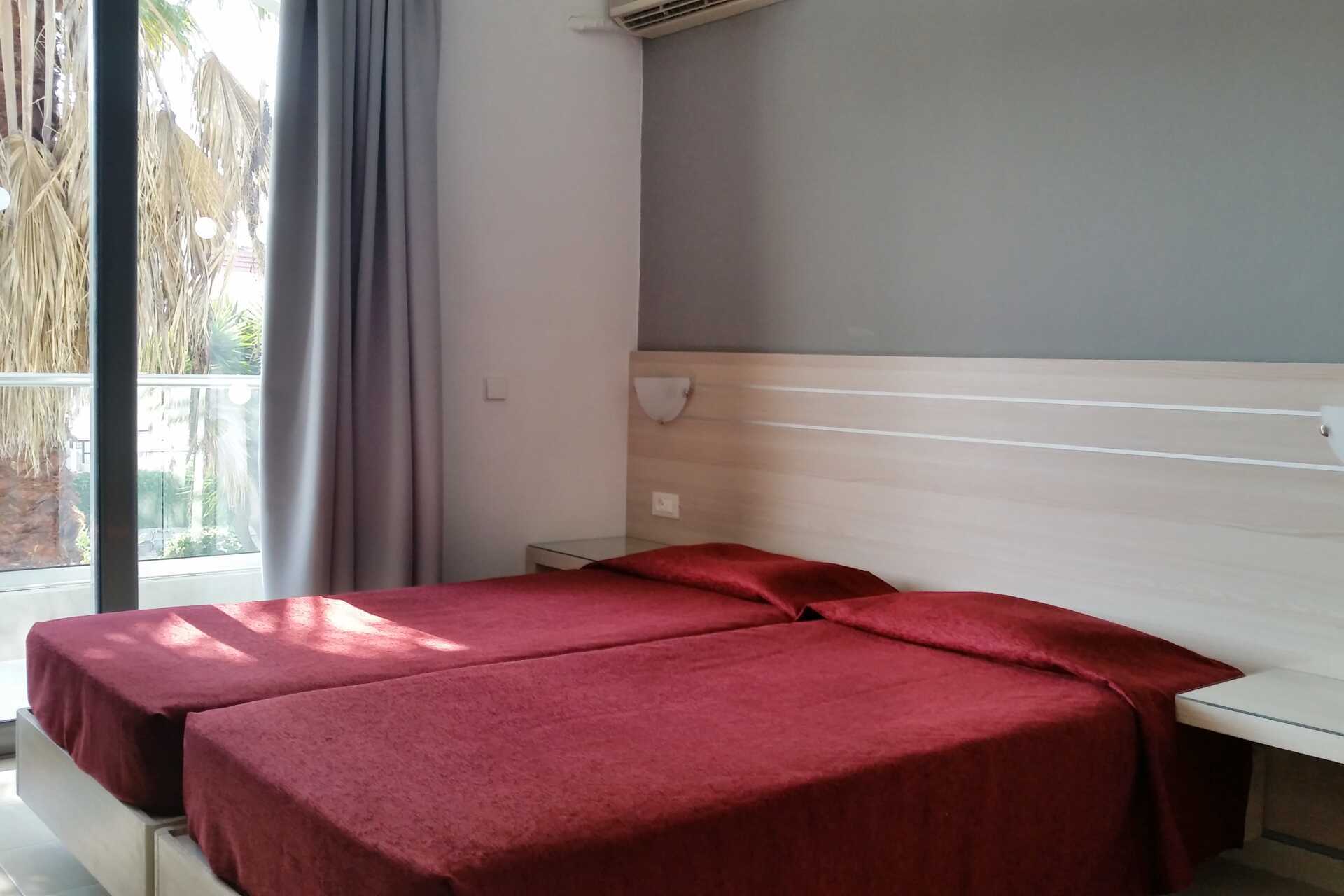 Familierom med terrasse og utgang til delt basseng. Familierommet vender mot bassengområdet på baksiden av hotellet. To enkeltsenger eller en dobbeltseng. Mulig med en ekstraseng i sovesofa. Wifi, luftkondisjonering og safe inkludert. TV. Hårføner. Glassvegg til bad med badekar eller dusj og wc. Rengjøring 5 ggr/uke.