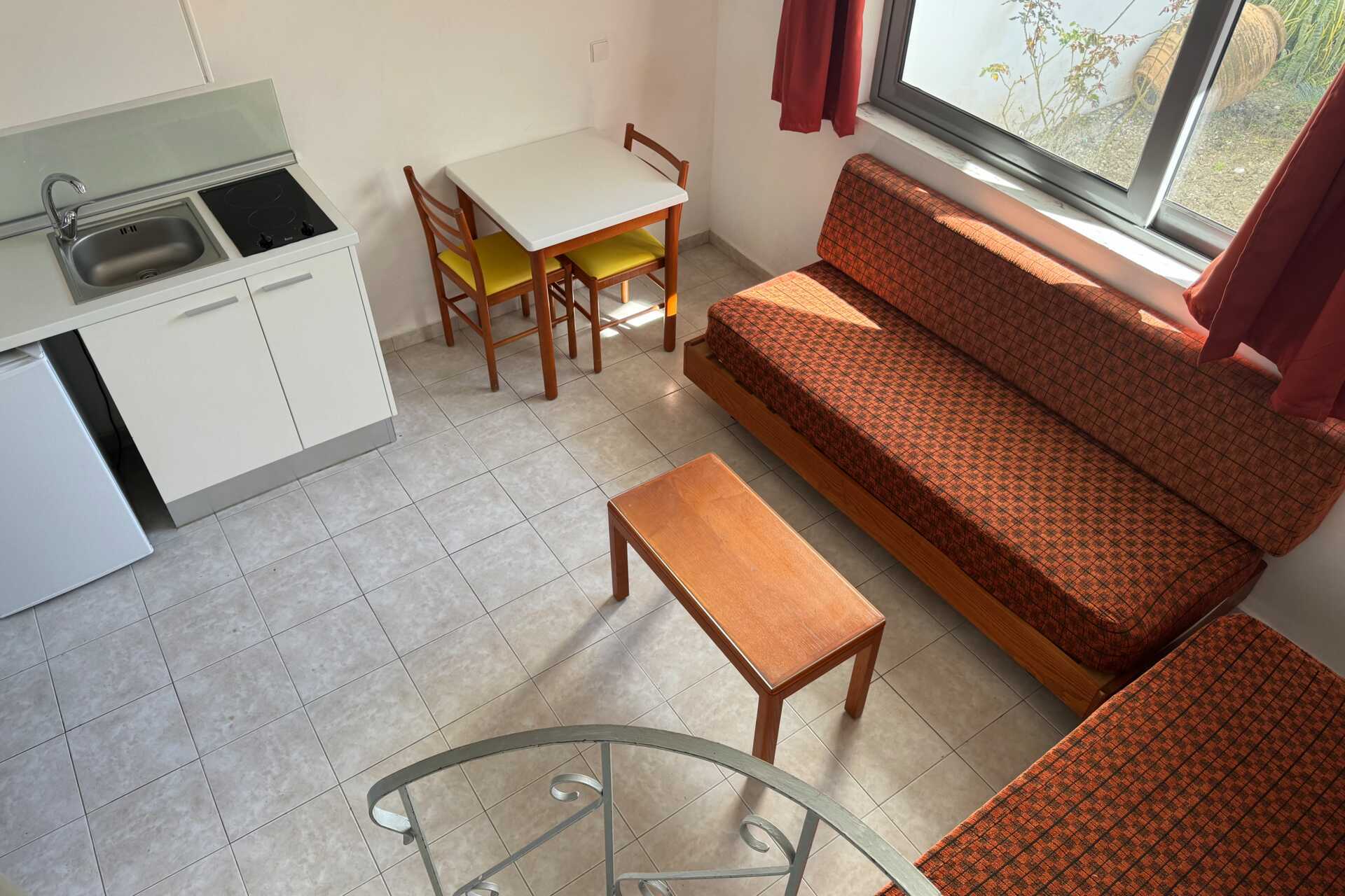 Toromsleilighet delvis under bakkeplan med markbalkong bassengutsikt. Leiligheten vender mot det store bassengområdet. Et soverom og stue med minikjøkken. Noen av leilighetene har frostet glassvegg som skille mellom rommene, veggen går ikke helt i tak. To enkeltsenger eller en dobbeltseng. Mulig med ekstrasenger i to sovesofaer. Minikjøkken med kokeplater, kjøleskap, vannkoker, kaffetrakter og enkelt kjøkkenutstyr. Wifi, luftkondisjonering og safe inkludert. TV. Hårføner. Badekar eller dusj samt wc. Rengjøring 5 ggr/uke.