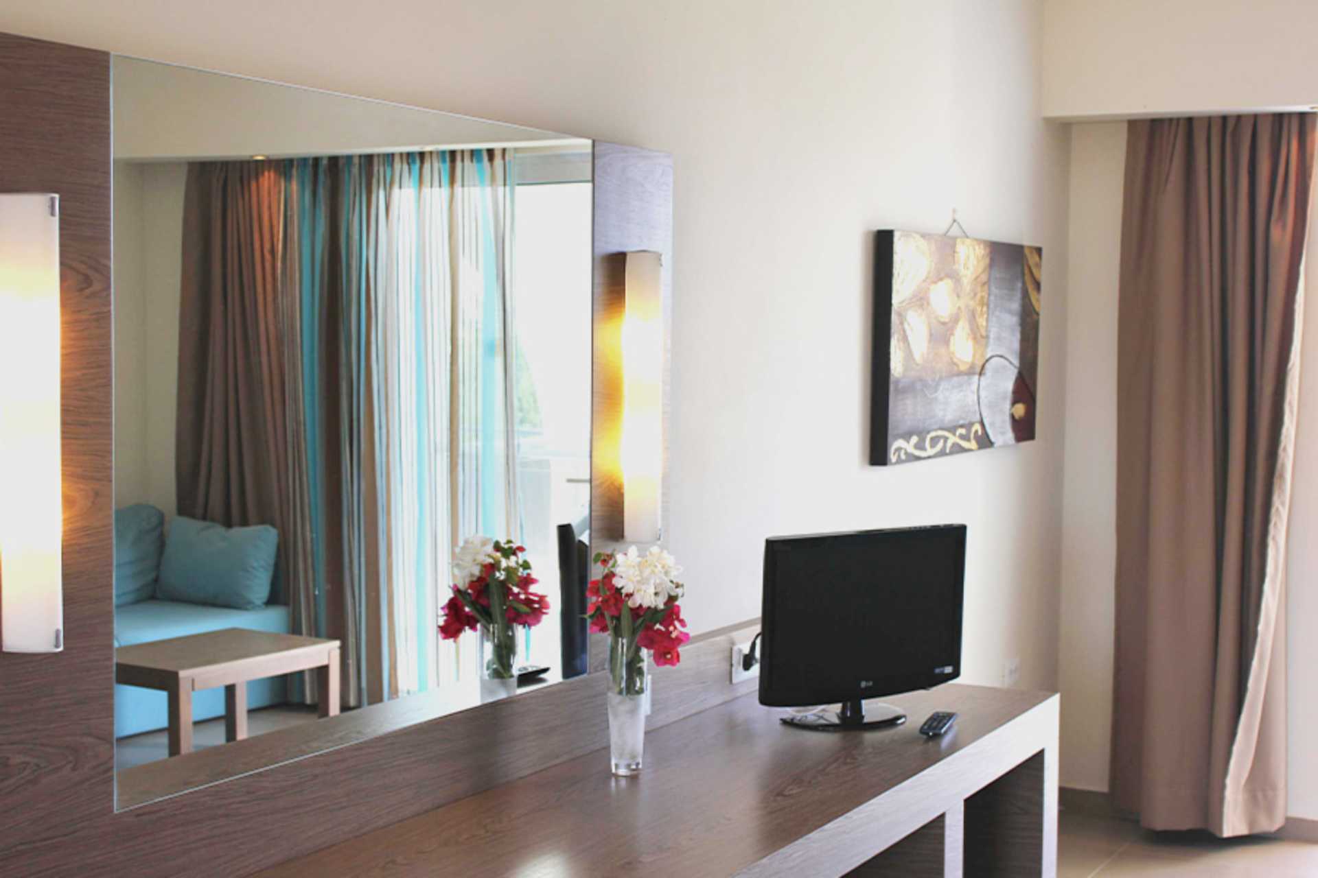 Dobbeltrom med balkong eller terrasse. To enkeltsenger. Mulig med ekstrasenger i en sovesofa. Wifi, luftkondisjonering og safe inkludert. Kjøleskap. TV. Badekar eller dusj samt wc, hårføner. Rengjøring 6 ggr/uke.