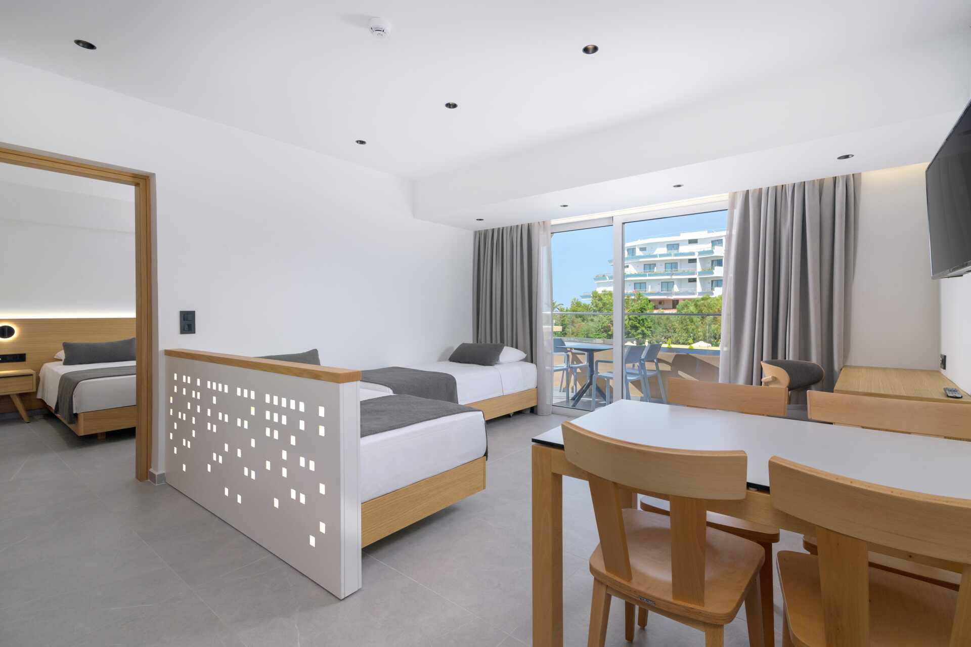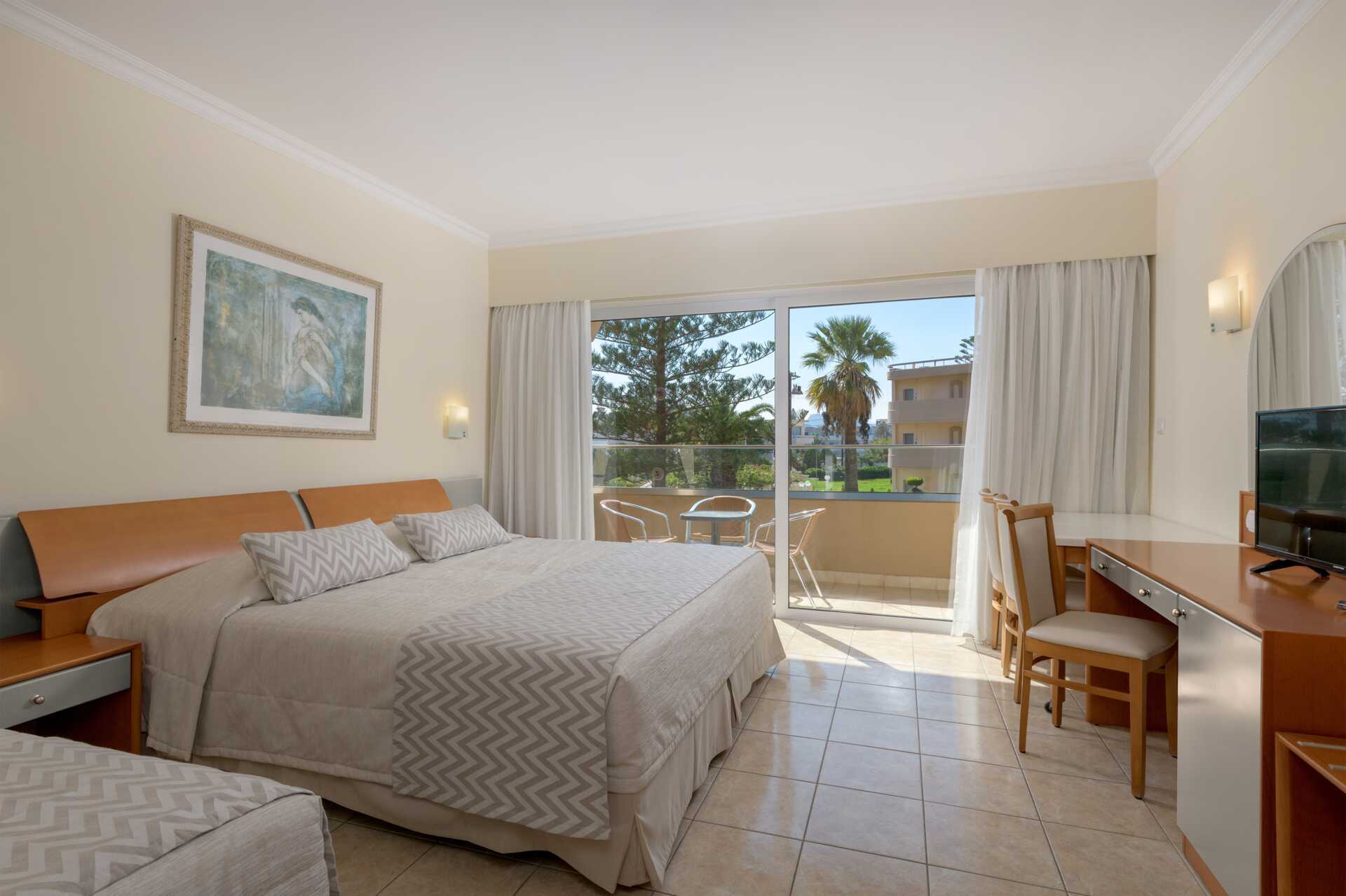 Familierom med balkong. Rommene ligger i hotelldelene Garden Ving, Zeus og Hera. To enkeltsenger. Mulig med ekstraseng i enkeltseng eller feltseng. Wifi og luftkondisjonering inkludert. Luftkondisjoneringen er sentralstyrt døgnet rundt av hotellet fra juni til september. Safe mot avgift. Kjøleskap. Vannkoker samt kaffe og te. TV. Hårføner. Badekar og wc. Rengjøring 7 ggr/uke. Barn under 2 år regnes inn i maksantallet i rommet.
