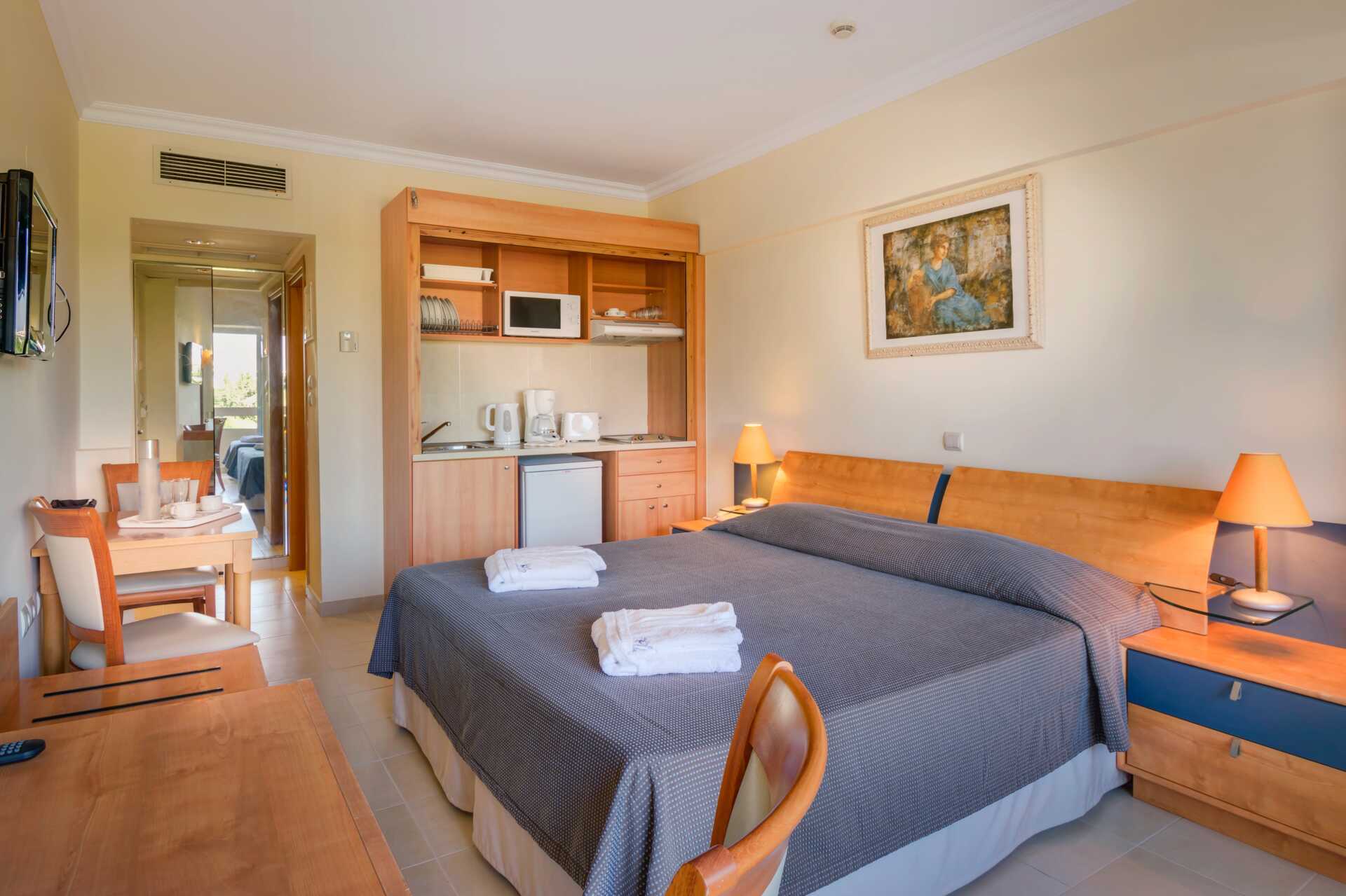Ettromsleiligheter med balkong, noen med havutsikt. Leilighetene ligger i hotelldelene Garden wing, Zeus og Hera. Minikjøkken. To enkeltsenger. Mulig med en ekstraseng i enkeltseng. Minikjøkken med kjøleskap, kokeplater, mikrobølgeovn, kaffetrakter, brødrister, vannkoker og enkelt kjøkkenutstyr. Wifi og luftkondisjonering inkludert. Luftkondisjoneringen er sentralstyrt døgnet rundt av hotellet fra juni til september. Safe mot avgift. TV. Hårføner. Dusj og wc. Rengjøring 7 ggr/uke. Barn under 2 år regnes inn i maksantallet i leiligheten.