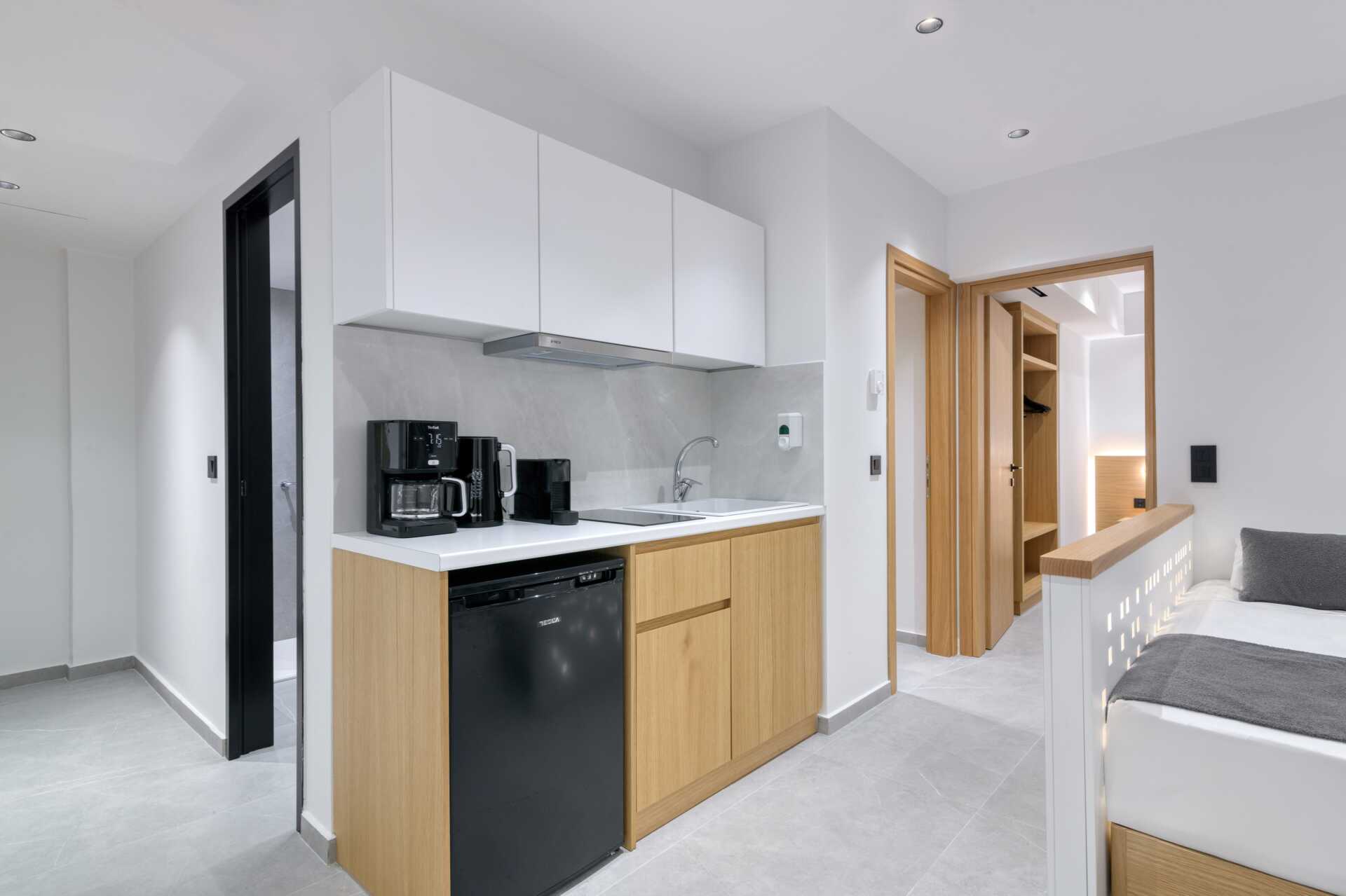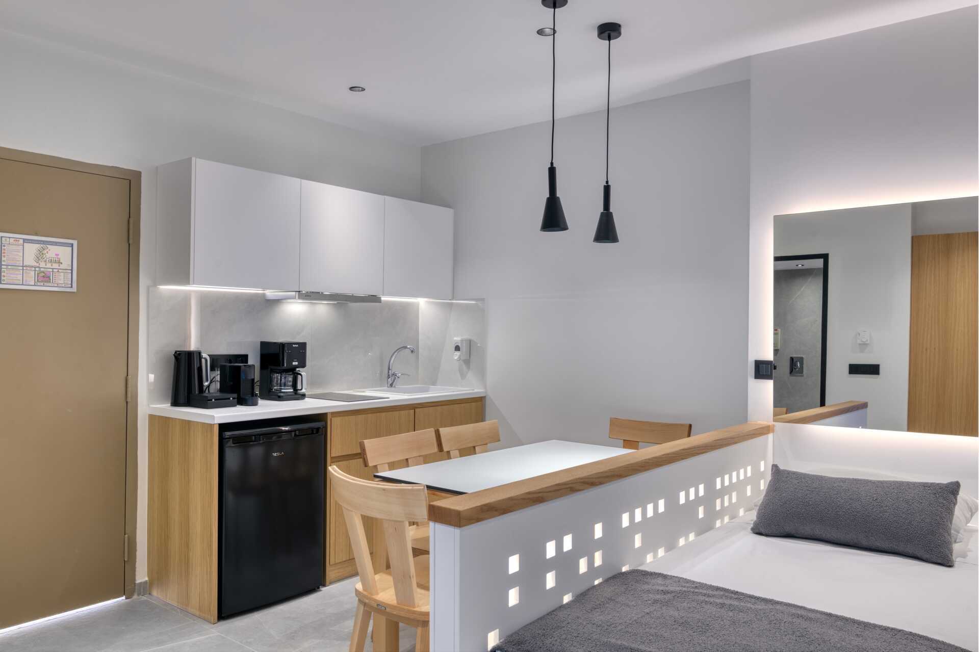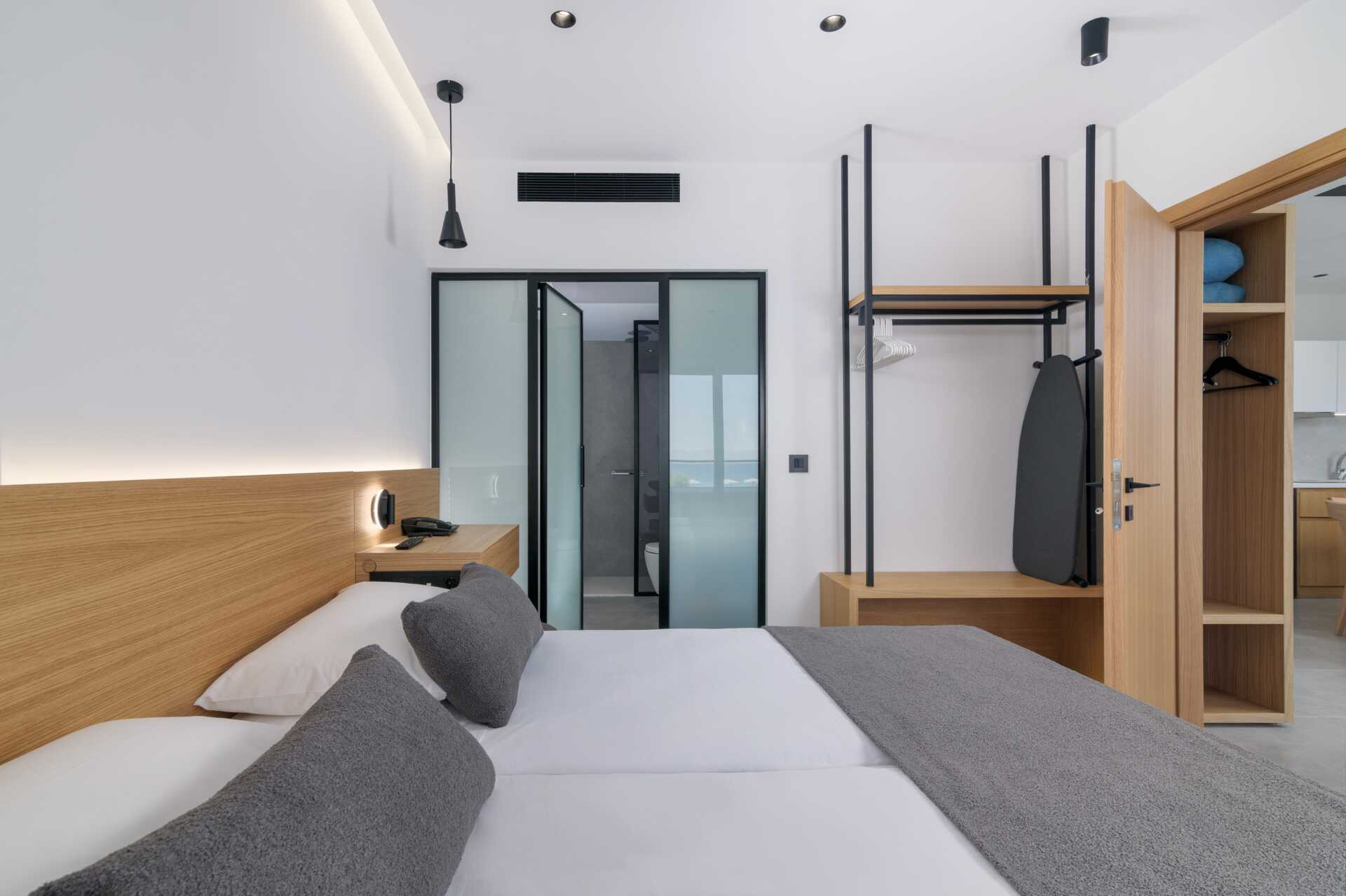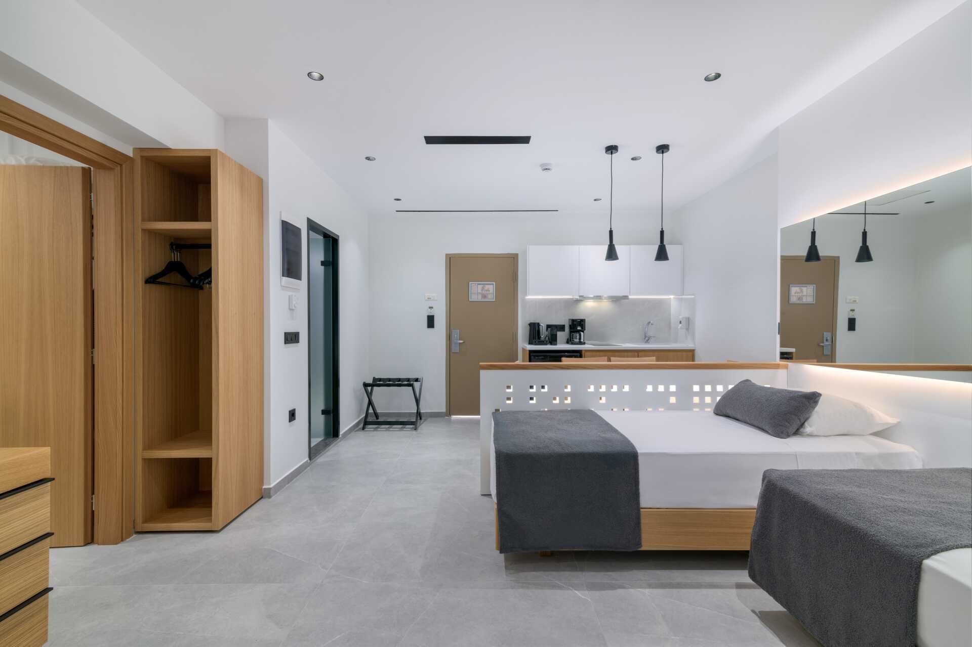 Toromsleilighet med balkong, noen med havutsikt. Leilighetene ligger i hotelldelene Beachfront Wing, Garden Wing, Zeus og Hera. Et soverom og en stue med minikjøkken. To enkeltsenger. Mulig med en ekstrasenger i to sovesofaer eller to enkeltsenger. Minikjøkken med kjøleskap, kokeplater, mikrobølgeovn, kaffetrakter, brødrister, vannkoker og enkelt kjøkkenutstyr. Wifi og luftkondisjonering inkludert. Luftkondisjoneringen er sentralstyrt døgnet rundt av hotellet fra juni til september. Safe mot avgift. TV. Badekåper. Hårføner. Badekar og wc. Rengjøring 7 ggr/uke. Barn under 2 år regnes inn i maksantallet i rommet.