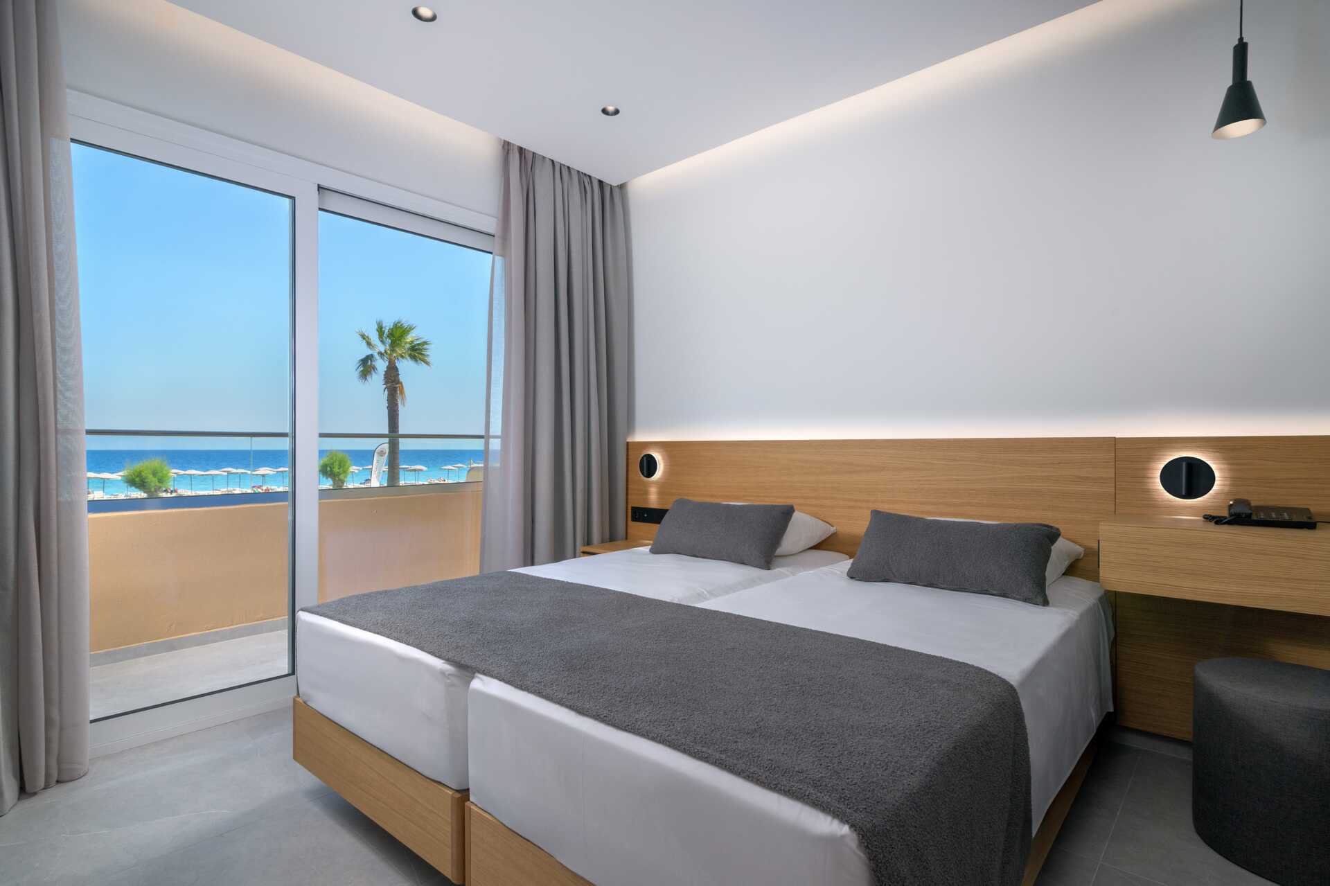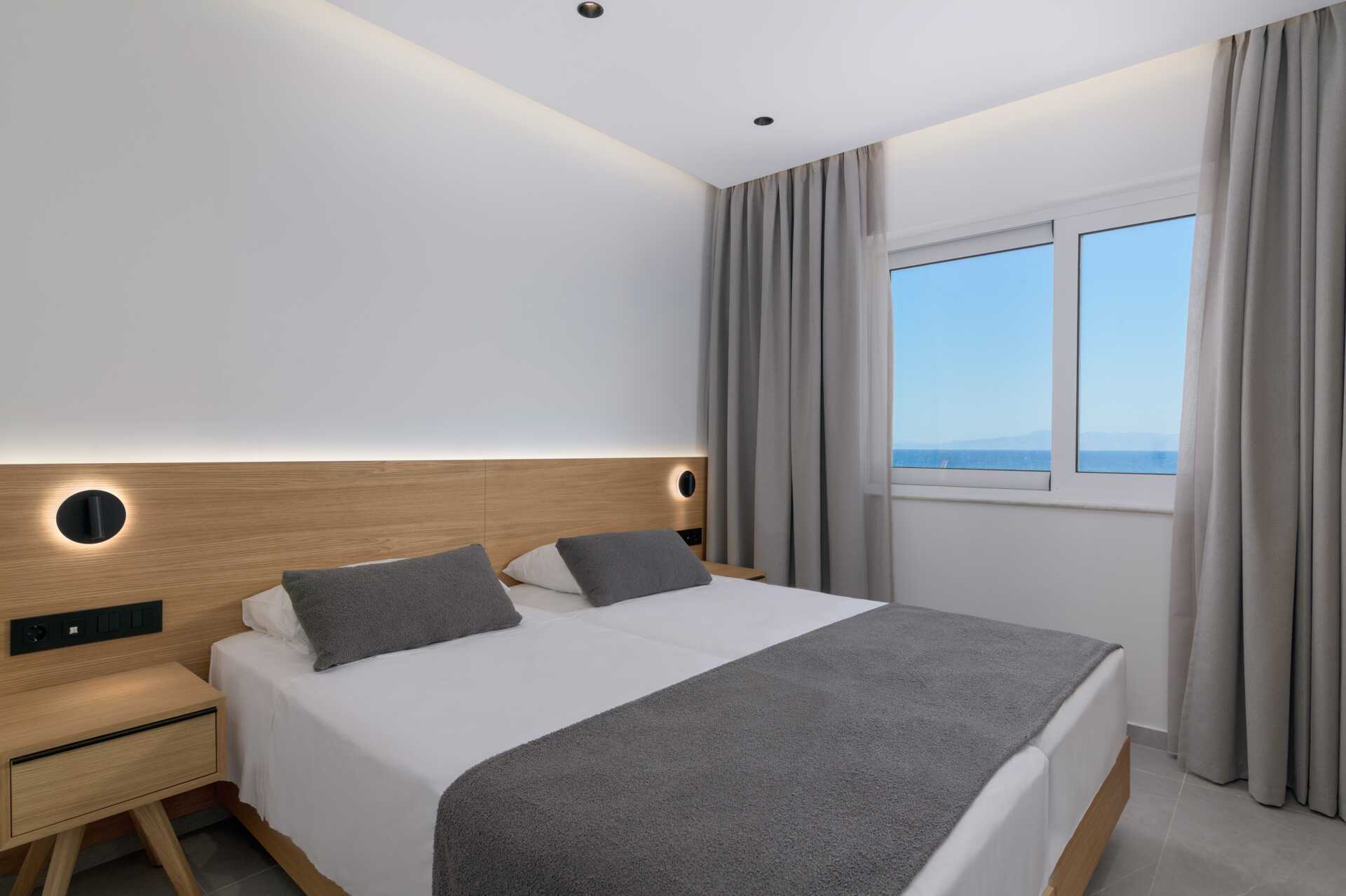 Treromsleilighet med balkong og havutsikt. Leilighetene ligger i hotelldelen Beachfront Wing. To soverom og en stue med minikjøkken. To enkeltsenger på hvert soverom. Mulig med en ekstraseng i sovesofa eller enkeltseng. Minikjøkken med kjøleskap, kokeplater, mikrobølgeovn, kaffetrakter, brødrister, vannkoker og enkelt kjøkkenutstyr. Wifi og luftkondisjonering inkludert. Luftkondisjoneringen er sentralstyrt døgnet rundt av hotellet fra juni til september. Safe mot avgift. TV. Badekåper og tøfler Hårføner. Badekar og wc. Rengjøring 7 ggr/uke. Barn under 2 år regnes inn i maksantallet i rommet.