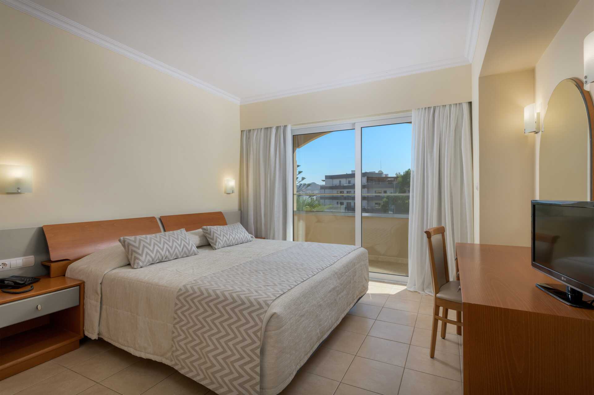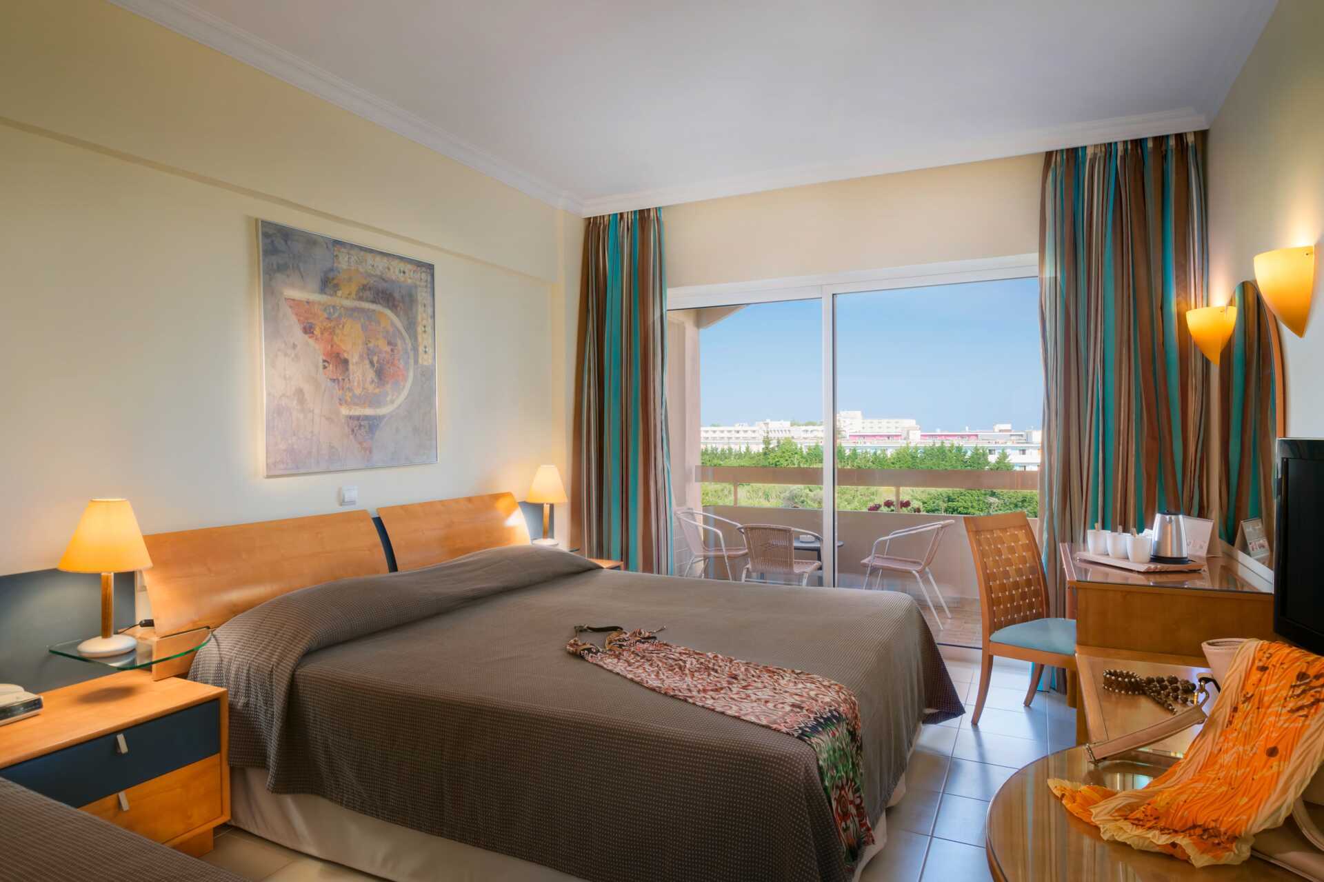 Dobbeltrom med balkong. Rommene ligger i hotelldelene Garden Wing, Zeus og Hera. To enkeltsenger. Mulig med ekstra oppredning i enkeltseng. Wifi og luftkondisjonering inkludert. Luftkondisjoneringen er sentralstyrt hele døgnet av hotellet fra juni til september. Safe mot avgift. Kjøleskap. Vannkoker samt kaffe og te. TV. Hårføner. Badekar og wc. Rengjøring 7 ggr/uke. Barn under 2 år regnes inn i maksantallet i rommet.