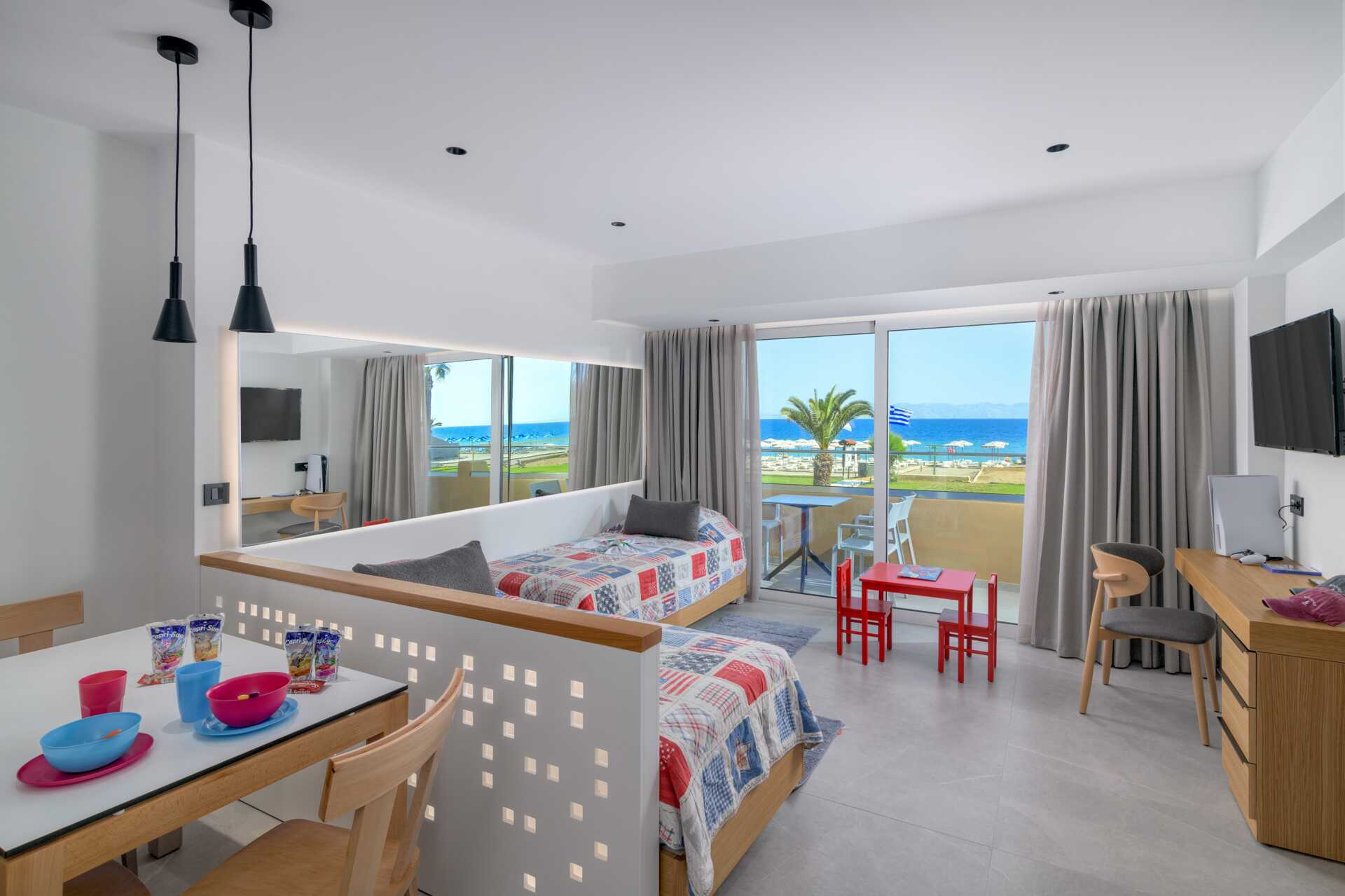 Toromsleilighet Superior med balkong, noen med havutsikt. Leilighetene med havutsikt ligger i hotelldelen Beachfront Wing, og de uten spesifisert utsikt ligger i Beachfront Wing eller i Garden. Perfekt for barnefamilien. Et soverom og kombinert stue med minikjøkken. To enkeltsenger. Mulig med en ekstraseng i to sovesofaer eller enkeltsenger. Minikjøkken med kjøleskap, kokeplater, mikrobølgeovn, kaffetrakter, brødrister, vannkoker og enkelt kjøkkenutstyr. Wifi og luftkondisjonering inkludert. Luftkondisjoneringen er sentralstyrt døgnet rundt av hotellet fra juni til september. Safe mot avgift. TV, kanaler med tegnefilm og en spillkonsoll. Hårføner. Badekåper. Dusj og wc. Rengjøring 7 ggr/uke. Barn under 2 år regnes inn i maksantallet i leiligheten.
