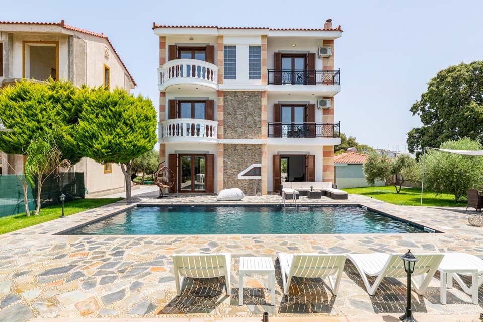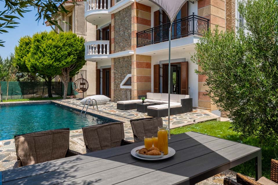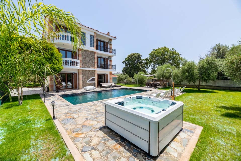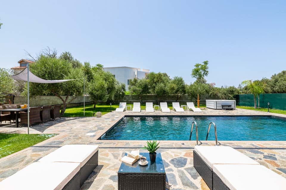 Et oppvarmet boblebad følger med det private svømmebassenget og komfortable solsenger hvor du kan tilbringe dagen med å steke under den greske solen. Med imponerende utendørs spisemuligheter kan du samle venner og familie for å nyte et måltid under åpen himmel tilberedt på grillen under stjernehimmelen.