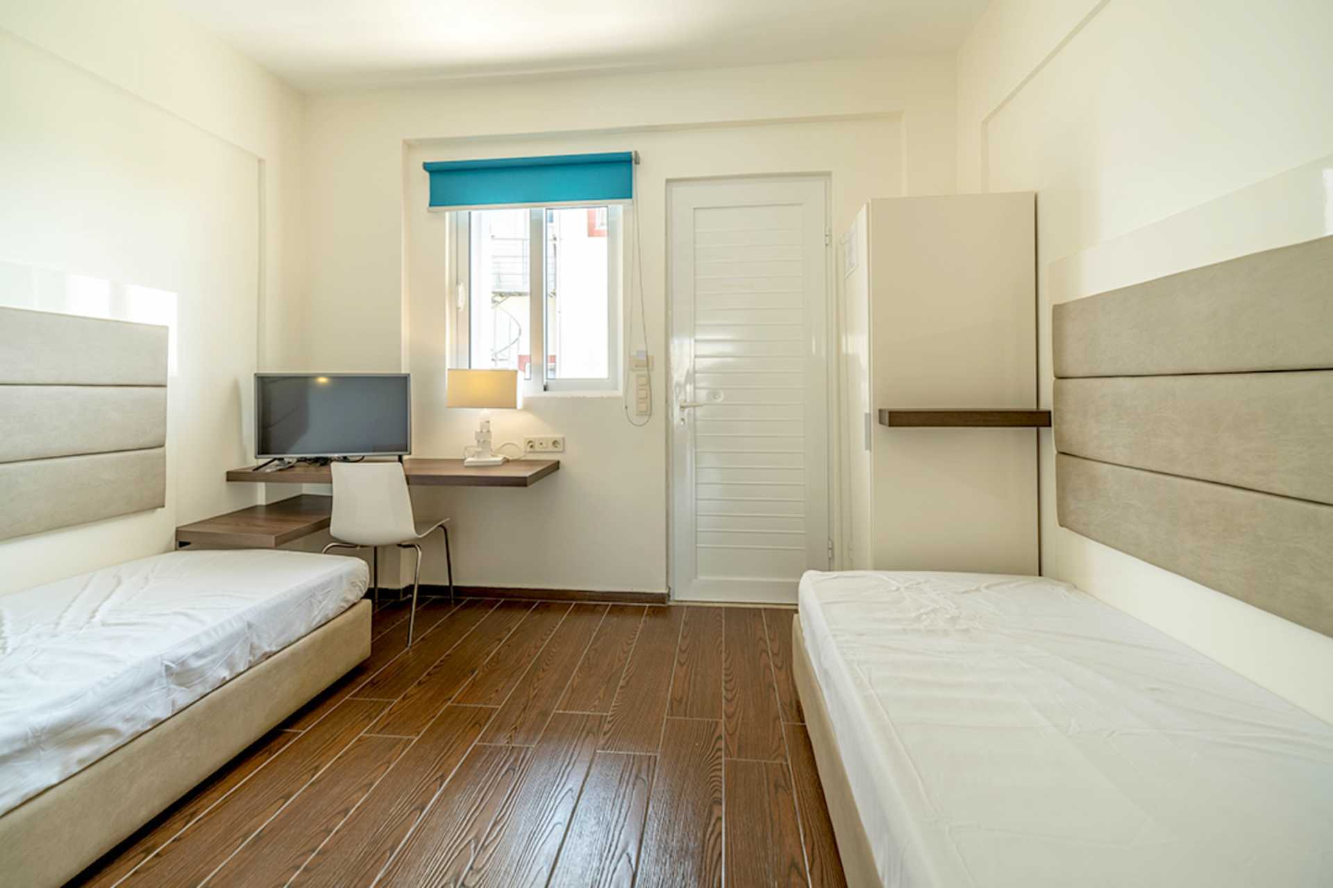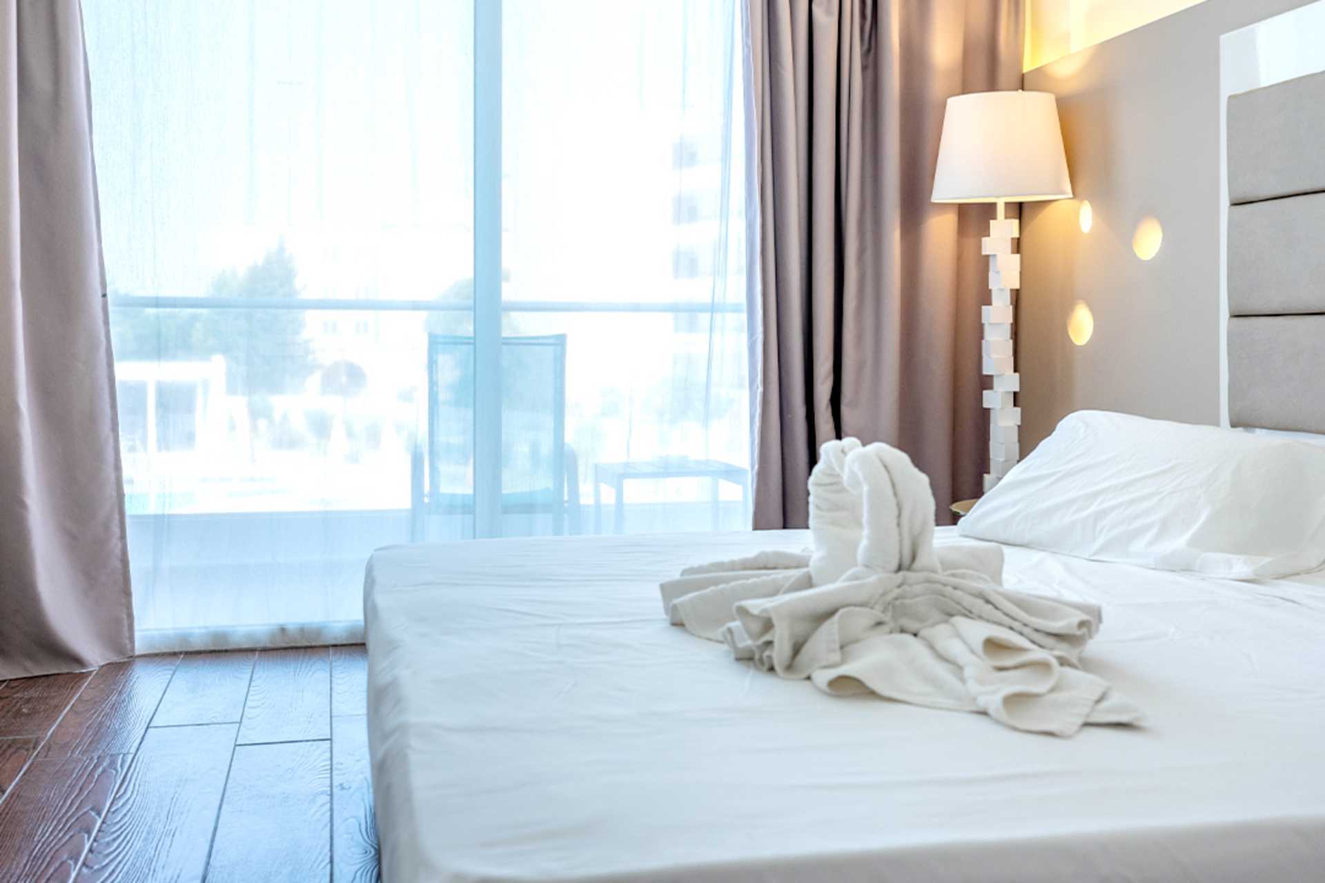 Dobbeltrom med balkong, noen med havutsikt. En dobbeltseng eller to enkeltsenger. Mulig med en ekstraseng i sovesofa. Wifi, luftkondisjonering og safe inkludert. Luftkondisjonering tilgjengelig fra 1. juni til 30. september. Kjøleskap. TV. Hårføner. Badekar eller dusj samt wc. Rengjøring 7 ggr/uke.