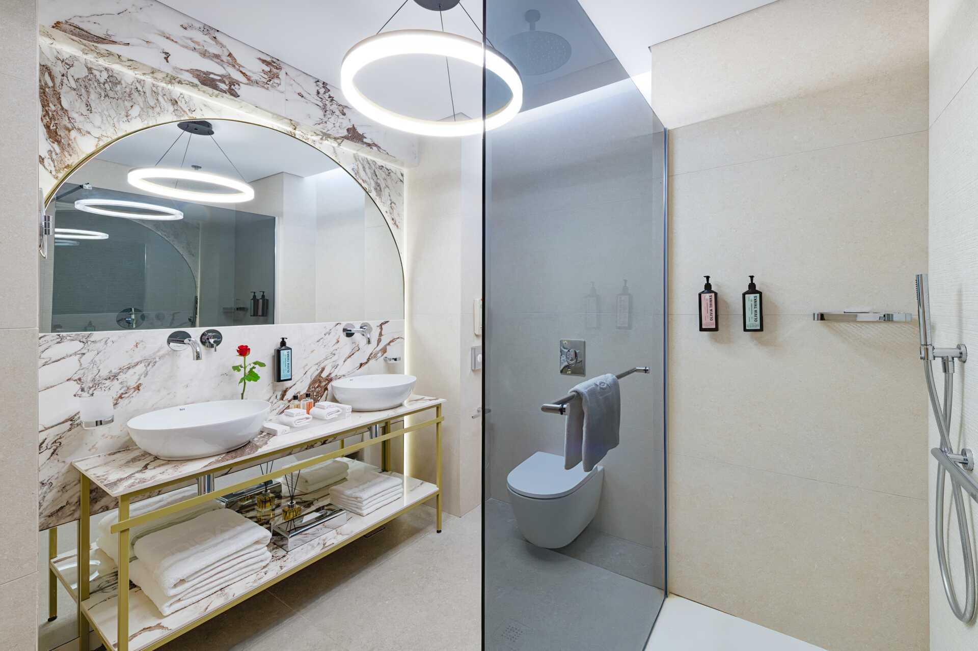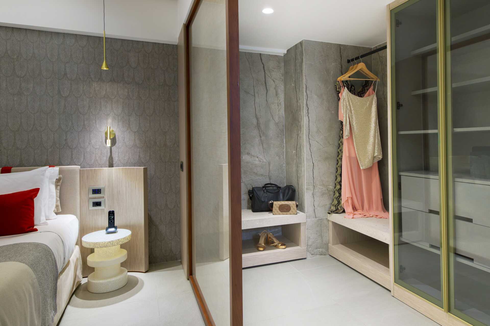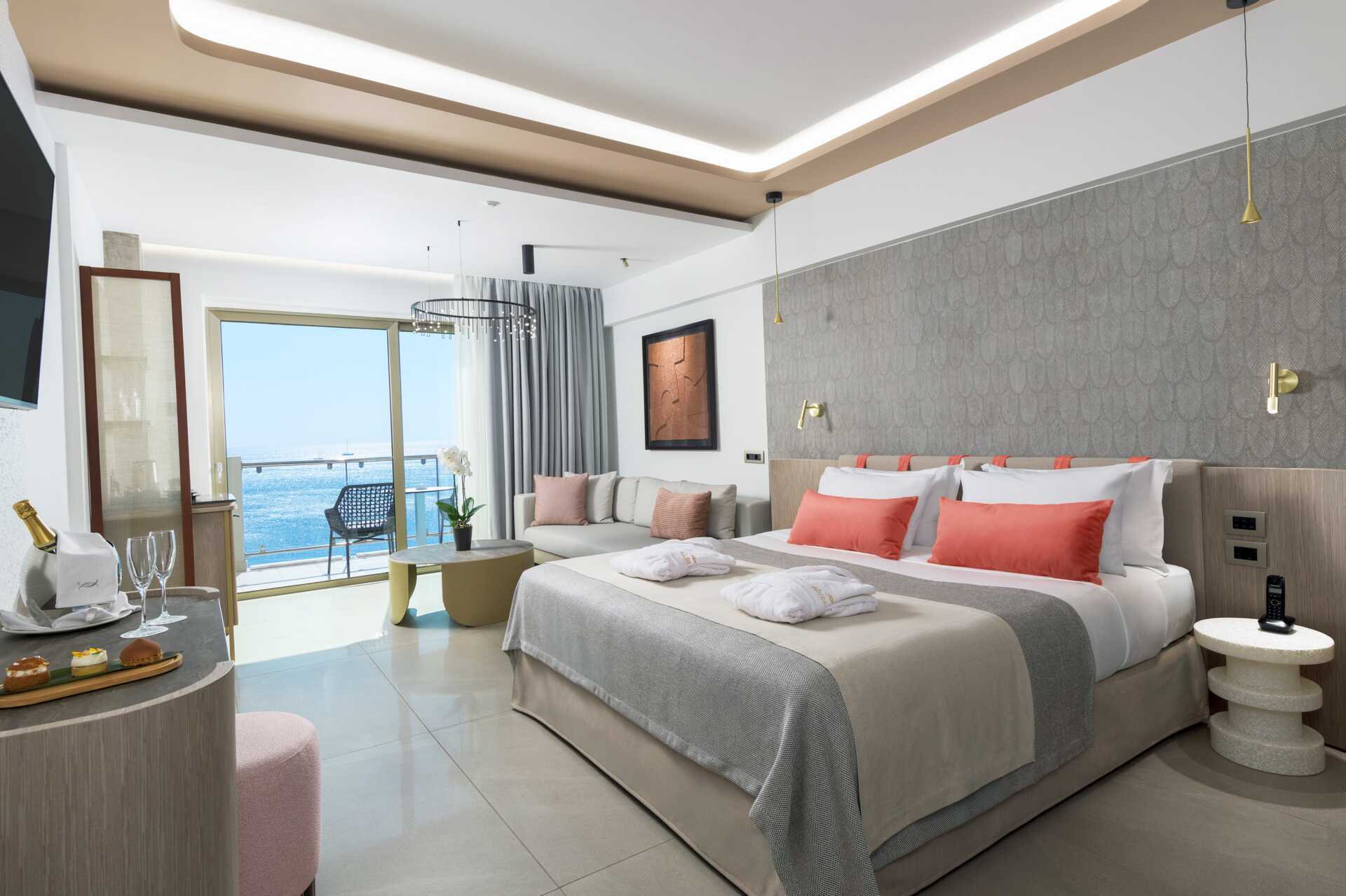 Juniorsuite med balkong og havutsikt. Juniorsuiten består av en stue og et soverom atskilt med skyvedører. En dobbeltseng eller to enkeltsenger. Mulig med ekstrasenger i sovesofa. Wifi, luftkondisjonering (i høysesong) og safe inkludert. Nespresso kaffemaskin, kapsler inkludert. Kjøleskap – en flaske vin og en flaske vann er inkludert ved ankomst. Vannkoker samt kaffe og te. TV. Hårføner. To bad, hvorav det ene har boblebad og det andre har dusj. Rengjøring 7 ggr/uke. Barn under 2 år regnes inn i maksantallet i rommet.