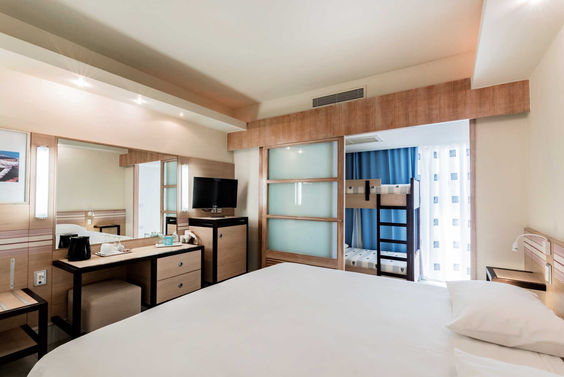Familierom med balkong eller terrasse. Familierommene ligger i hotellets sidebygning. En dobbeltseng eller to enkeltsenger og en sovealkove med en køyeseng. Alkoven kan deles fra soverommet med skyvedører. Sentralstyrt luftkondisjonering (mulig i perioden 1.6-30.9), safe og wifi inkludert. Kjøleskap. Ved ankomst er kjøleskapet fylt med flasker med vann, brus og øl som er inkludert. TV. Noen av rommene har vegg-til-vegg-teppe. Badekar eller dusj samt wc. Rengjøring 7 ggr/uke. Barn under 2 år regnes inn i maksantallet i rommet.