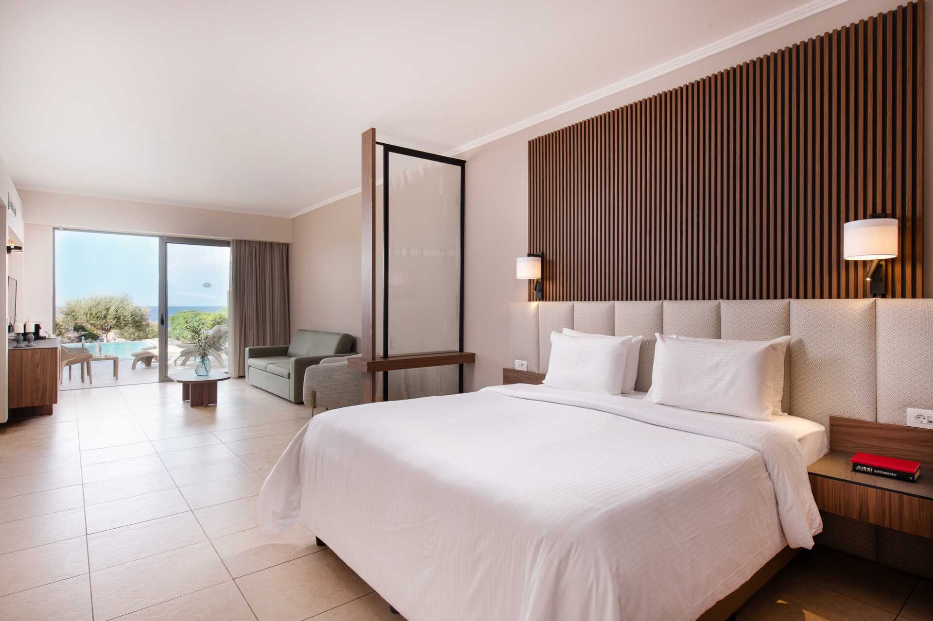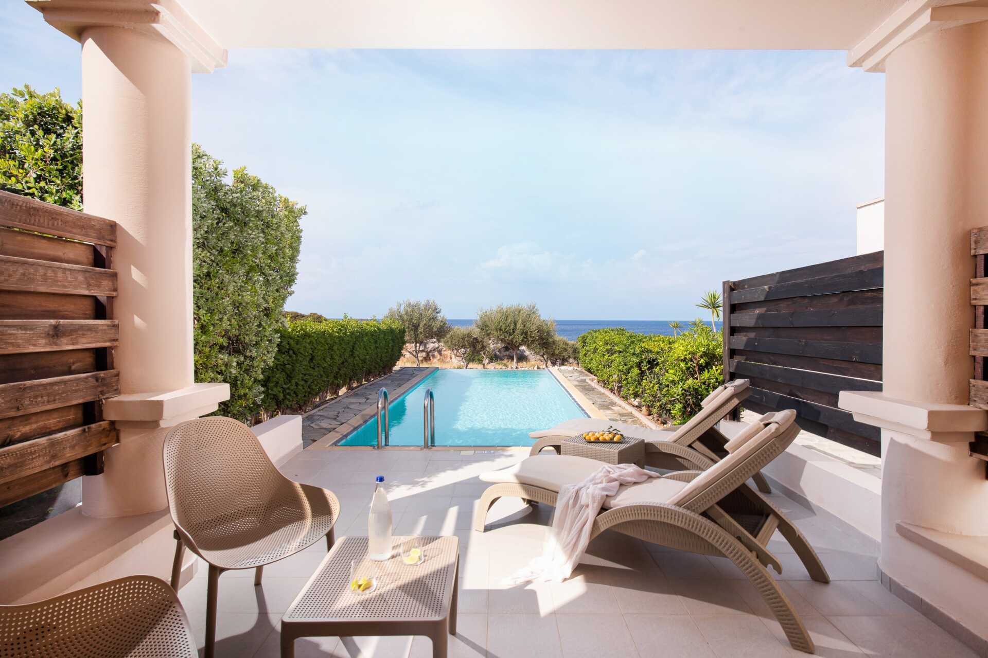 Juniorsuite med eget basseng og havutsikt fra terrassen, som også har to solsenger og to lenestoler. To enkeltsenger. Mulig med ekstrasenger i sovesofa. Wifi, luftkondisjonering og safe inkludert. Kjøleskap. Vannkoker samt kaffe og te. Nespresso kaffemaskin. TV. Hårføner. Jacuzzibadekar og wc. Rengjøring 7 ggr/uke.