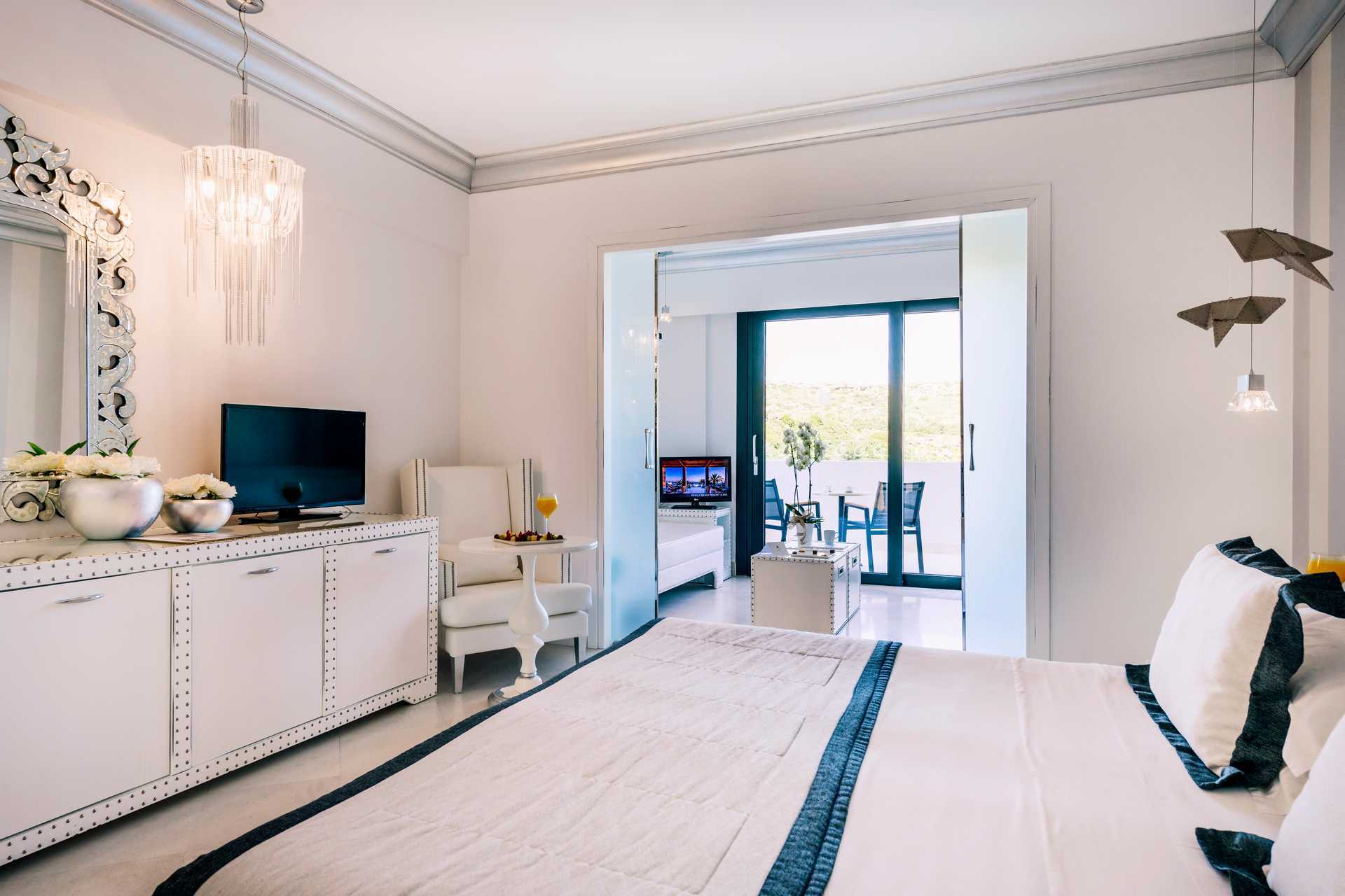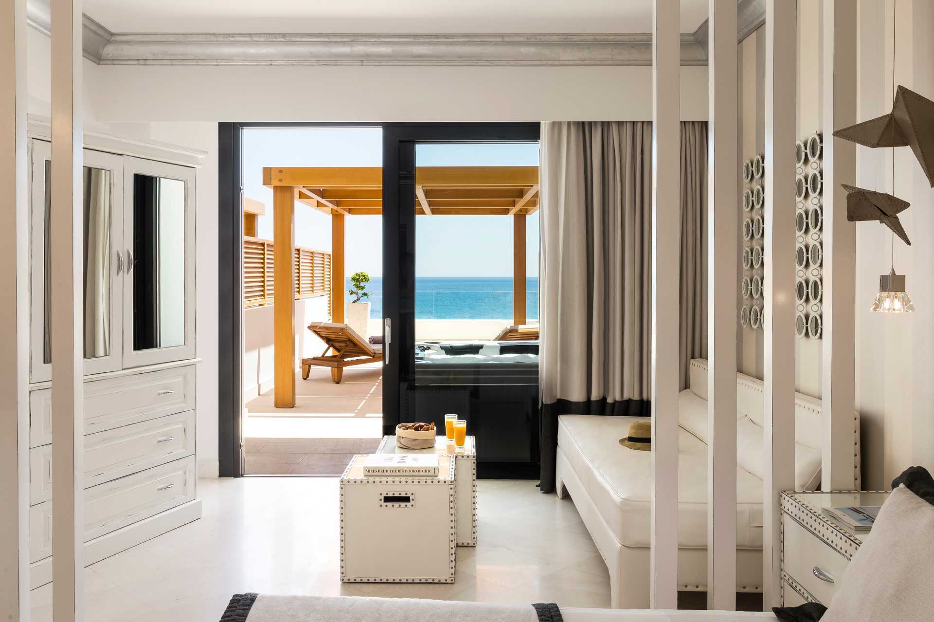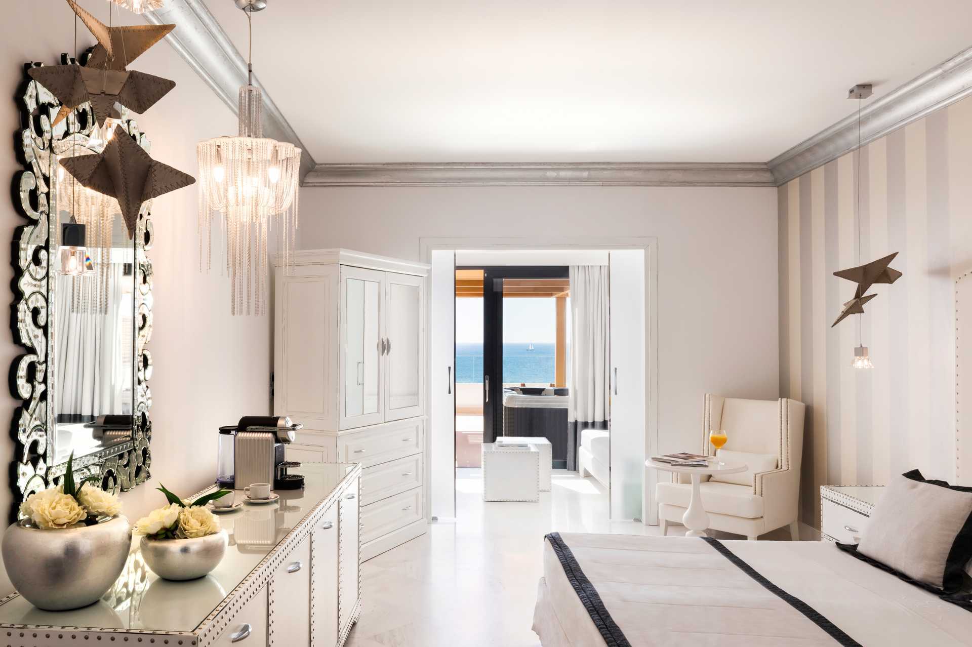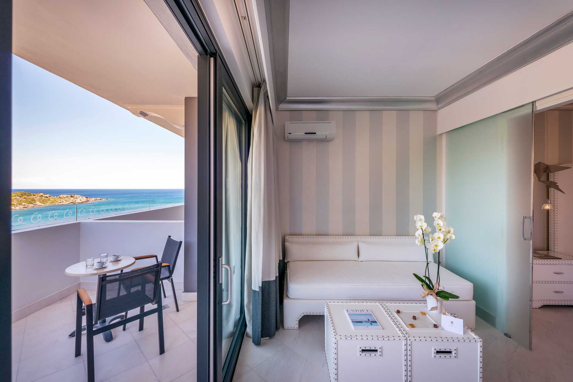 Juniorsuite med balkong og havutsikt. Juniorsuitene ligger i første etasje i hovedbygningen. På balkongen er det jacuzzi og solsenger. Juniorsuitene består av soverom og stue i åpen planløsning. En dobbeltseng eller to enkeltsenger. Wifi, luftkondisjonering og safe inkludert. Minibar inkludert, etterfylles daglig. Vannkoker samt kaffe og te. Nespresso kaffemaskin, kapsler inkludert og etterfylles hver dag. TV. Badekåper og tøfler Hårføner. Badekar og wc. Rengjøring 7 ggr/uke. Barn under 2 år regnes inn i maksantallet i rommet.