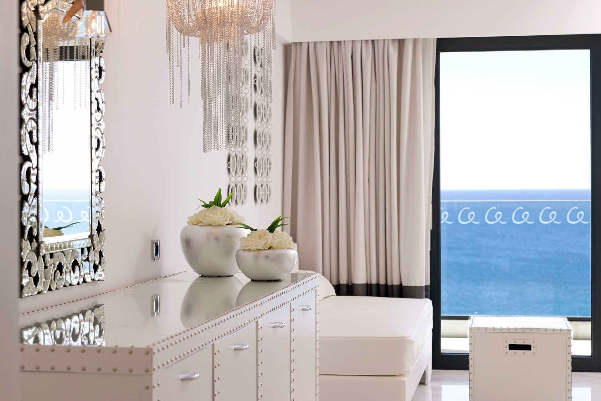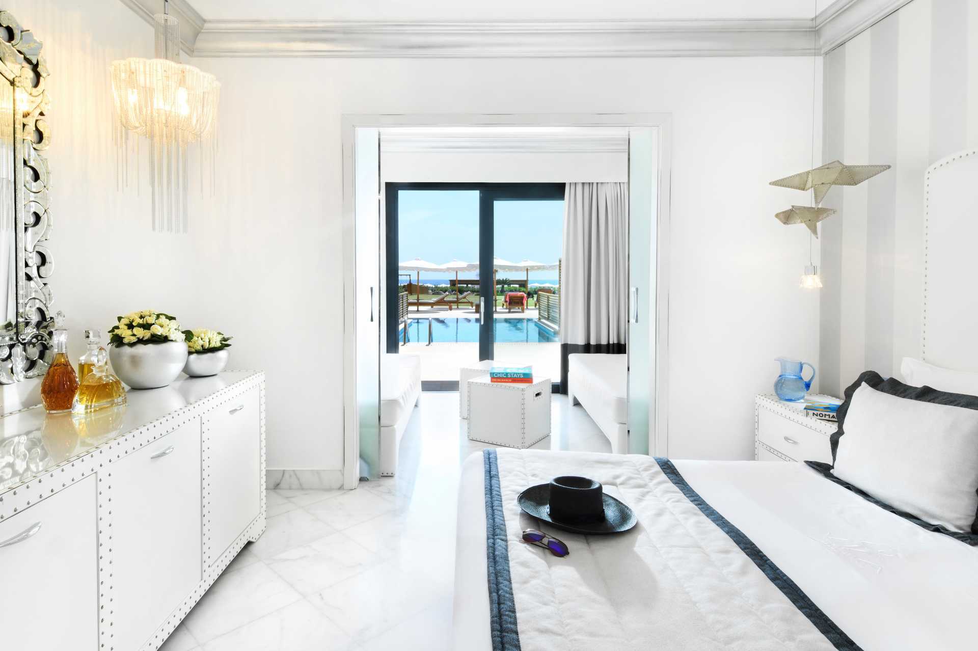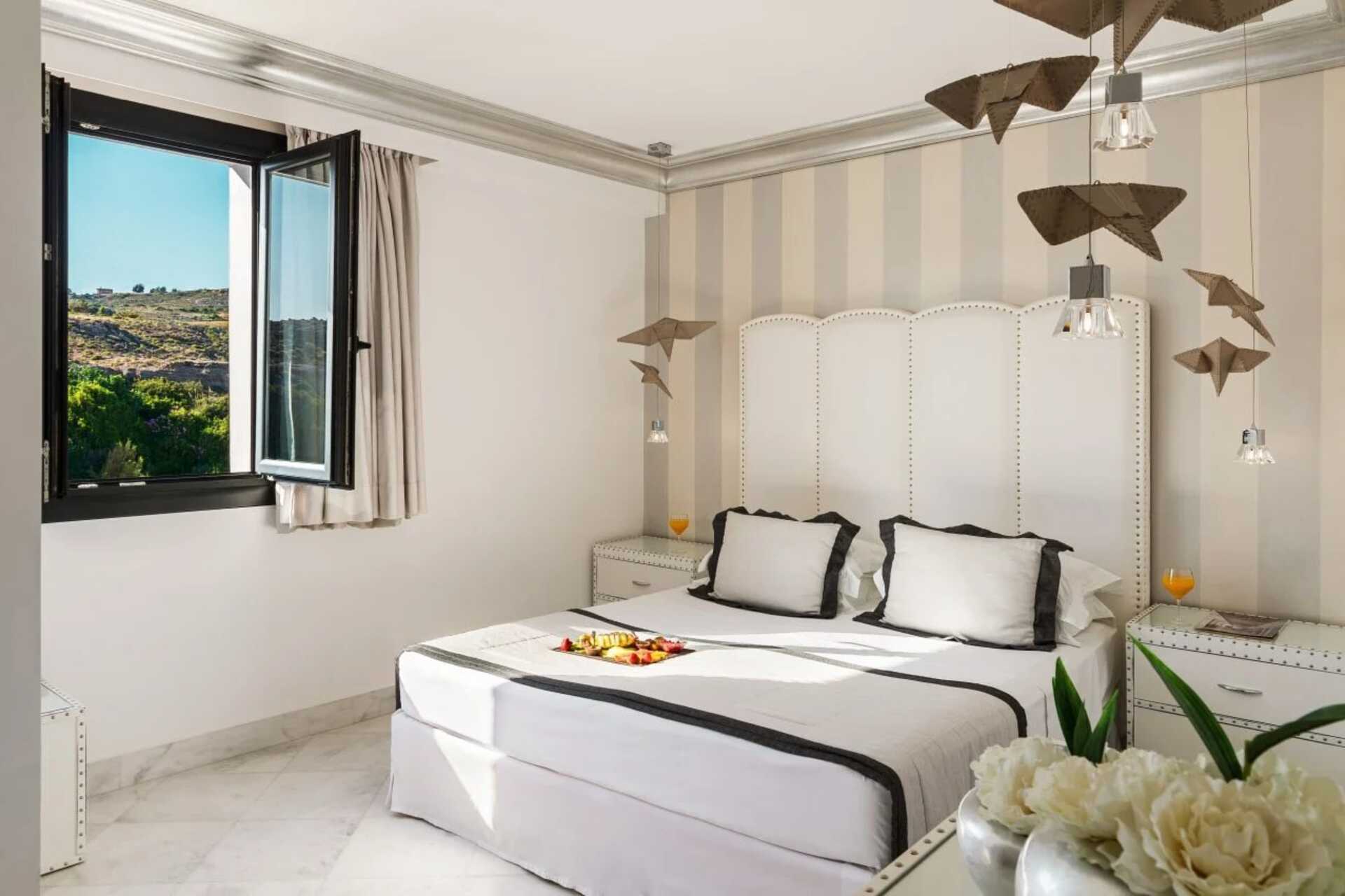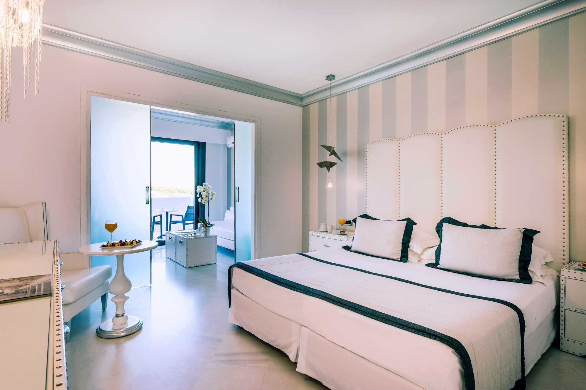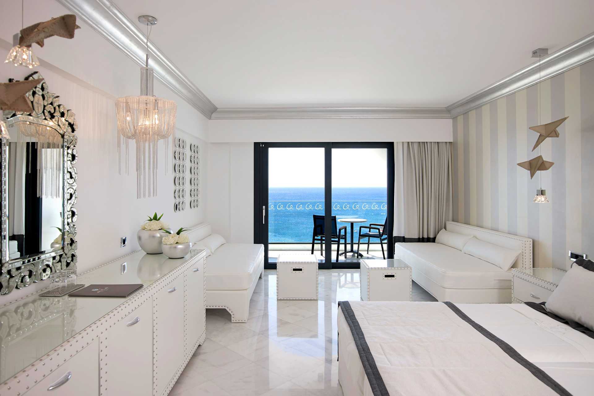 Juniorsuite med balkong og havutsikt. Juniorsuitene ligger i første etasje i hovedbygningen. På balkongen er det jacuzzi og solsenger. Juniorsuitene består av soverom og stue i åpen planløsning. En dobbeltseng eller to enkeltsenger. Wifi, luftkondisjonering og safe inkludert. Minibar inkludert, etterfylles daglig. Vannkoker samt kaffe og te. Nespresso kaffemaskin, kapsler inkludert og etterfylles hver dag. TV. Badekåper og tøfler Hårføner. Badekar og wc. Rengjøring 7 ggr/uke. Barn under 2 år regnes inn i maksantallet i rommet.