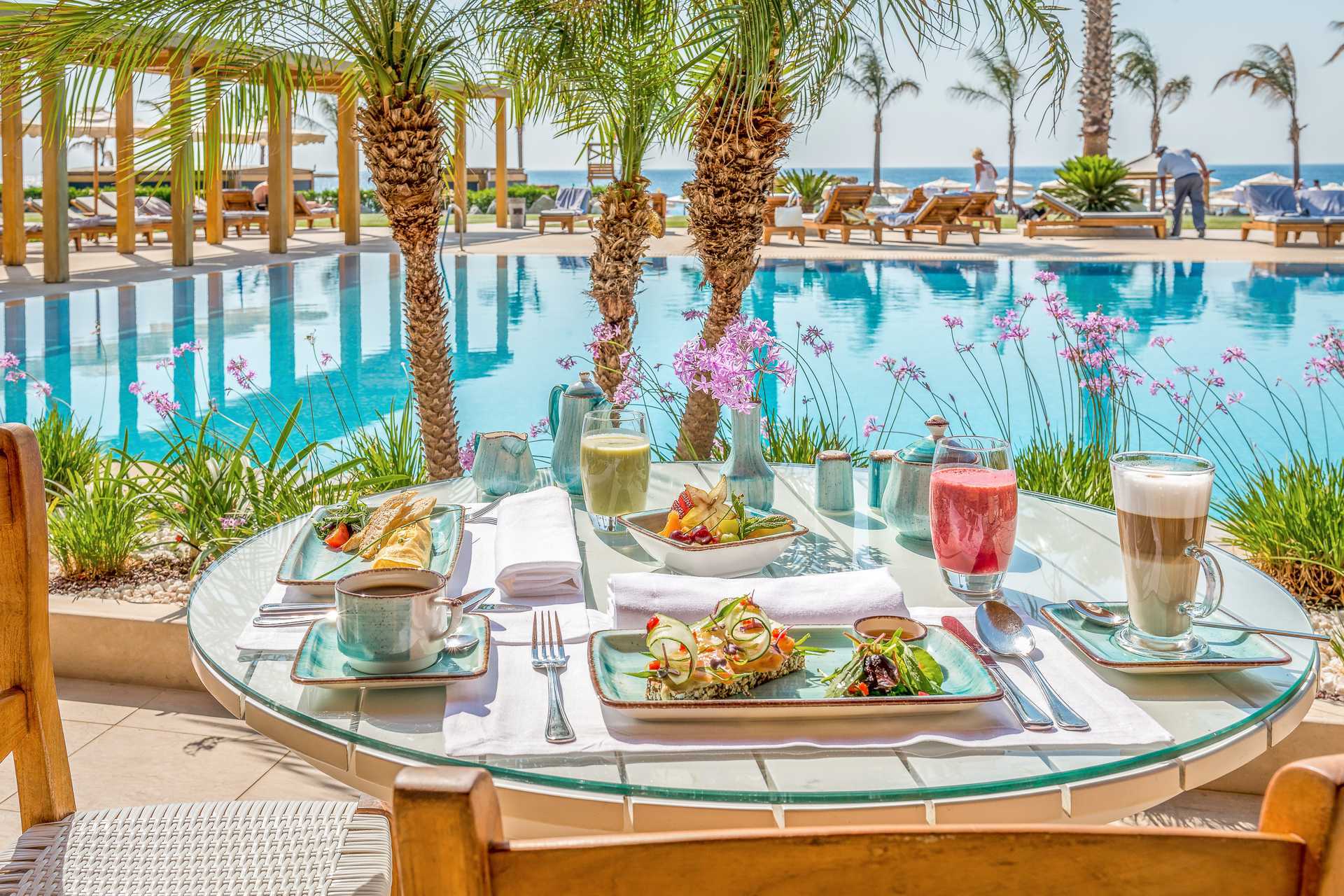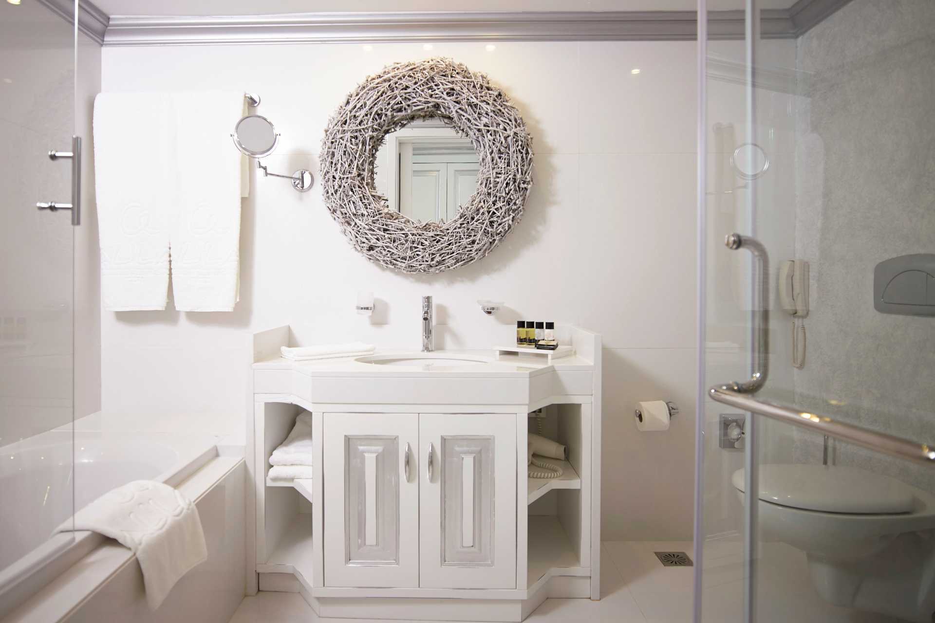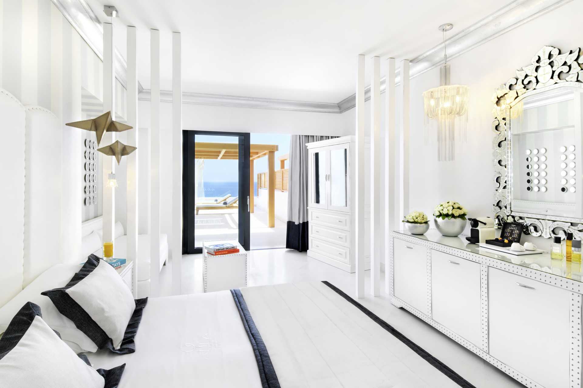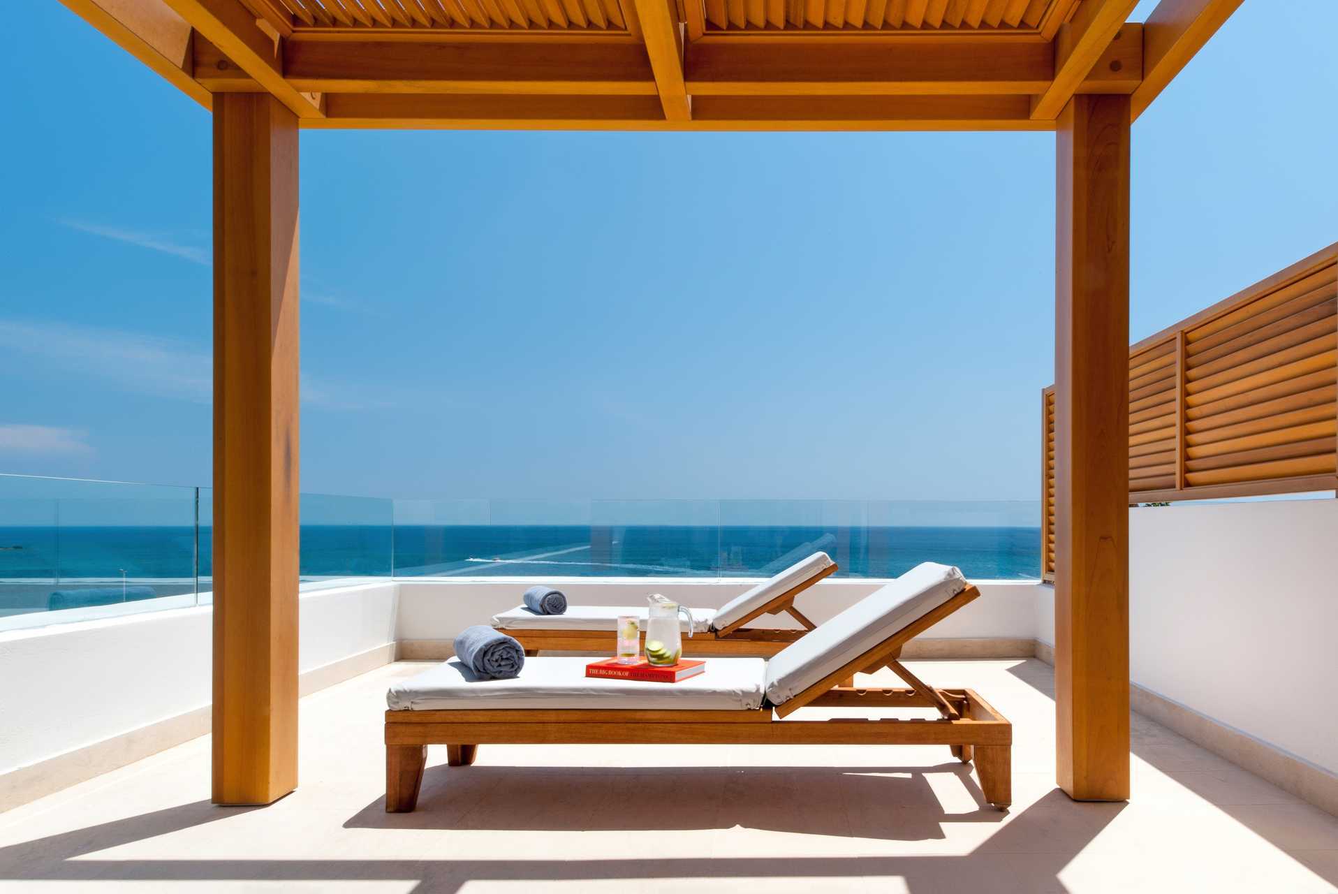 Juniorsuite med balkong og havutsikt. Juniorsuitene ligger i første etasje i hovedbygningen. På balkongen er det jacuzzi og solsenger. Juniorsuitene består av soverom og stue i åpen planløsning. En dobbeltseng eller to enkeltsenger. Wifi, luftkondisjonering og safe inkludert. Minibar inkludert, etterfylles daglig. Vannkoker samt kaffe og te. Nespresso kaffemaskin, kapsler inkludert og etterfylles hver dag. TV. Badekåper og tøfler Hårføner. Badekar og wc. Rengjøring 7 ggr/uke. Barn under 2 år regnes inn i maksantallet i rommet.