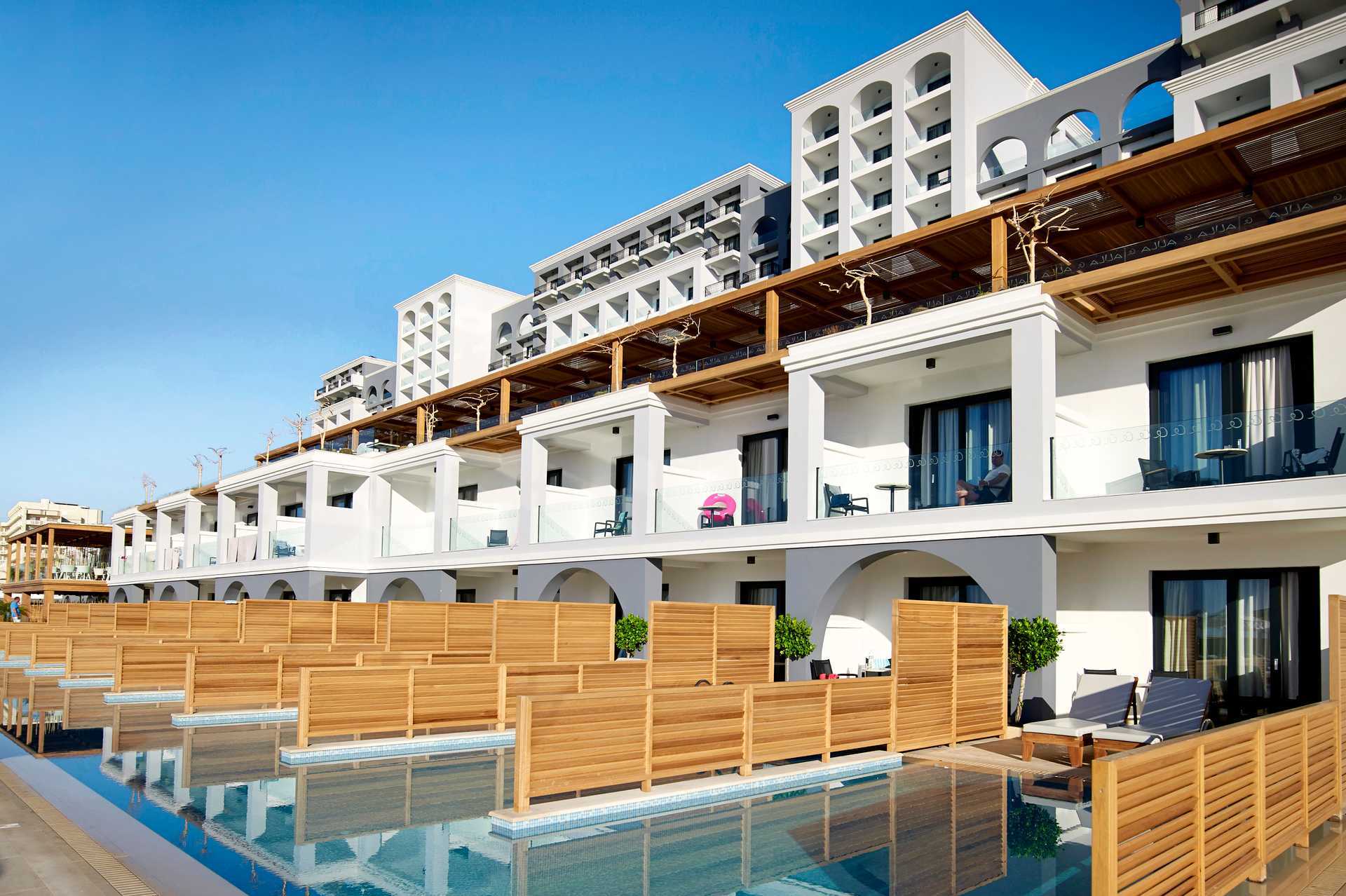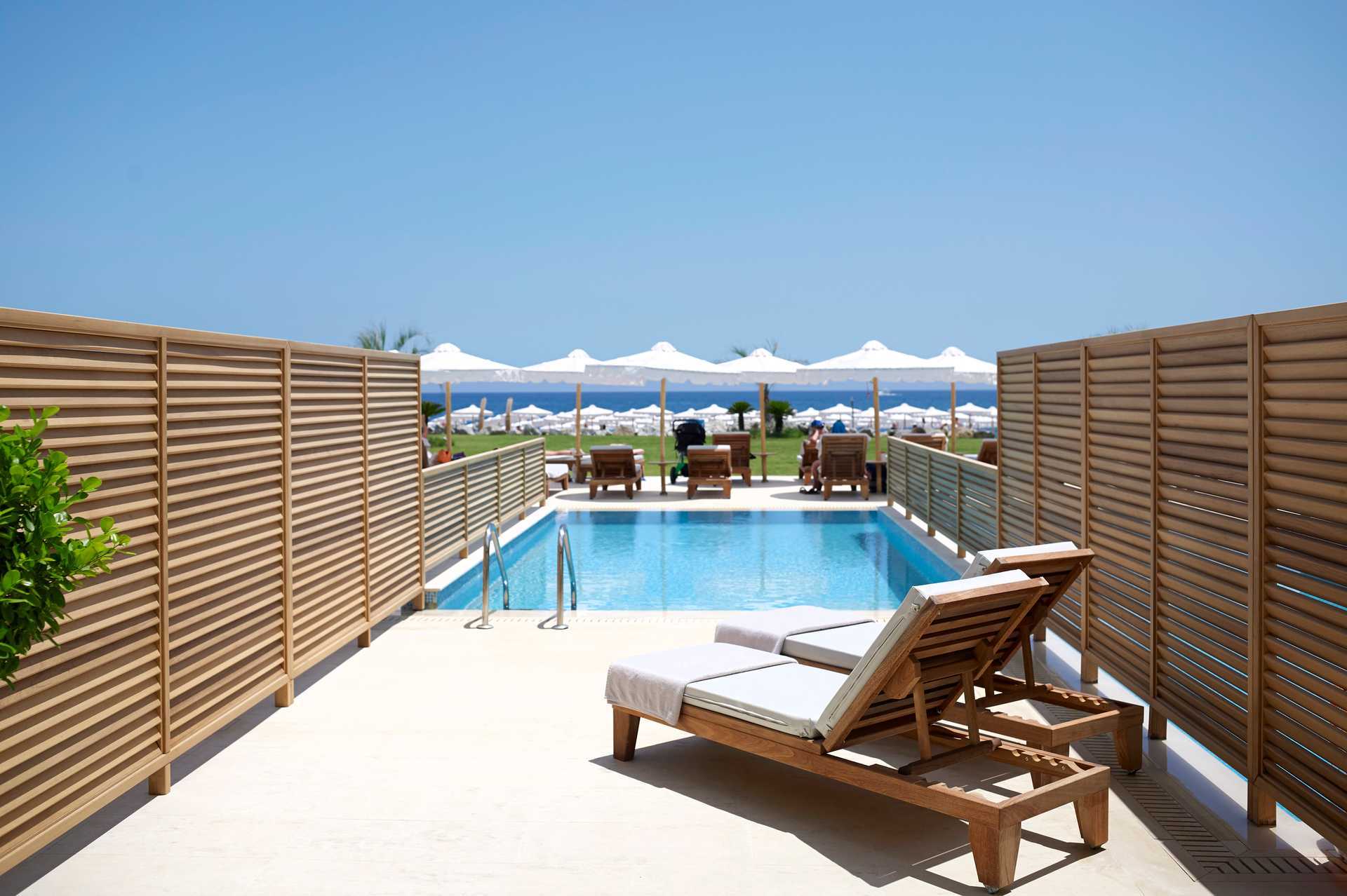 Familierom med uteplass med eget basseng og begrenset havutsikt. Familierommet består av et soverom med dobbeltseng eller to enkeltsenger og stue med mulighet for ekstrasenger i sovesofa. Rommene kan adskilles med frostede glassdører. Luftkondisjonering i to separate enheter som kan brukes når rommet er delt i to. Safe og wifi inkludert. Minibar inkludert, etterfylles daglig. Vannkoker samt kaffe og te. Nespresso kaffemaskin, kapsler inkludert og etterfylles hver dag. TV. Badekåper og tøfler Hårføner. Badekar eller dusj samt wc. Rengjøring 7 ggr/uke. Barn under 2 år regnes inn i maksantallet i rommet.