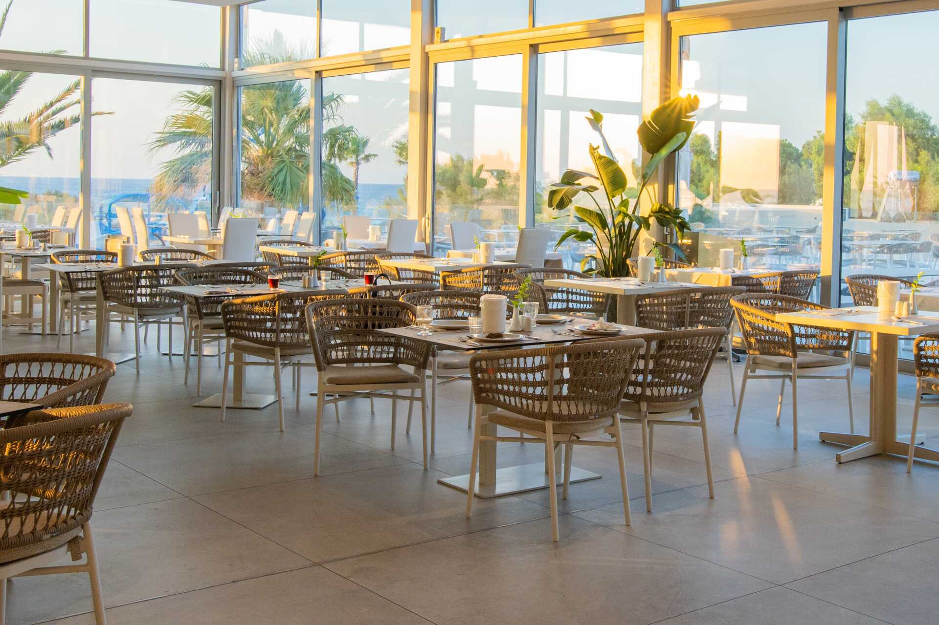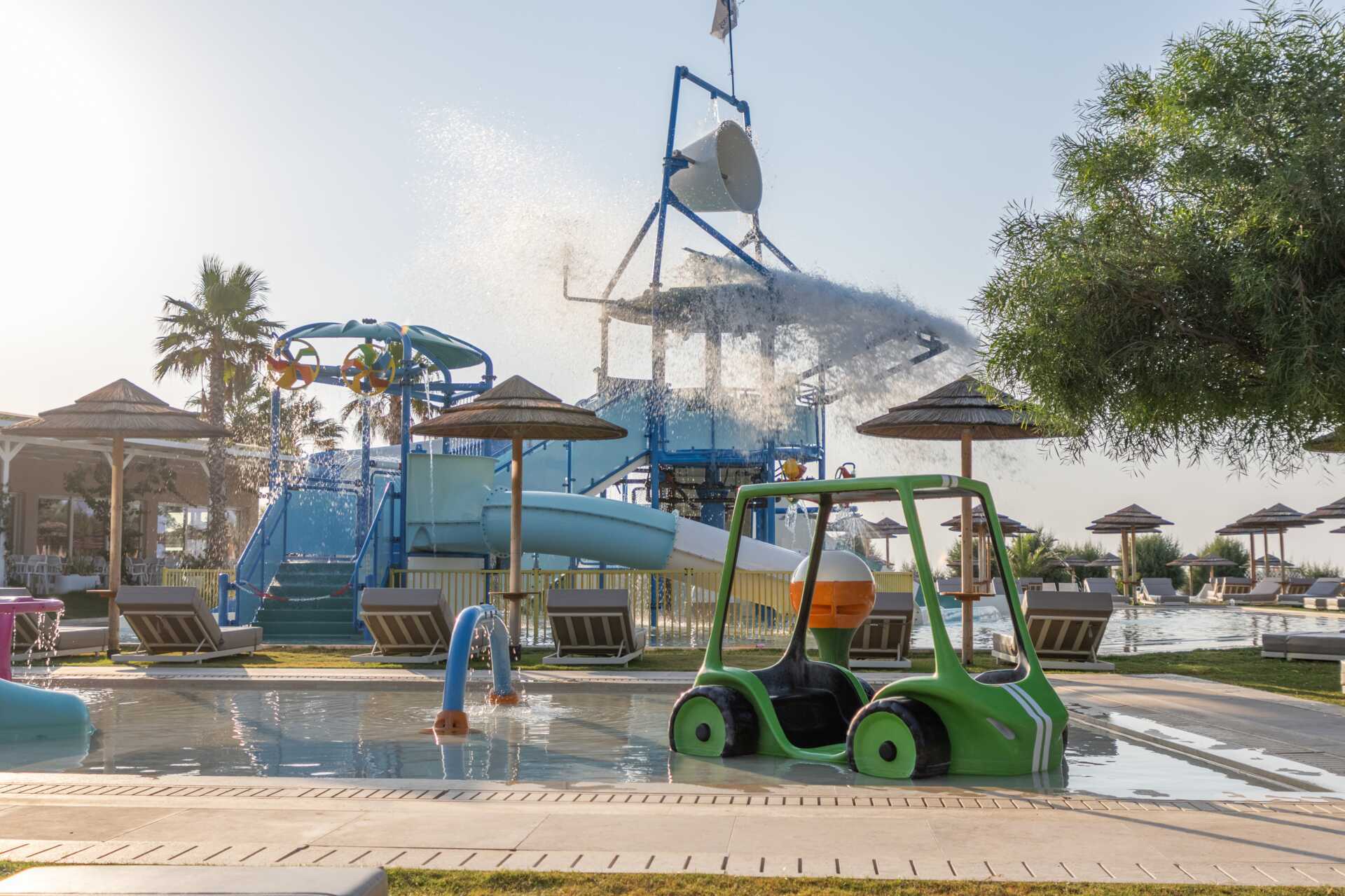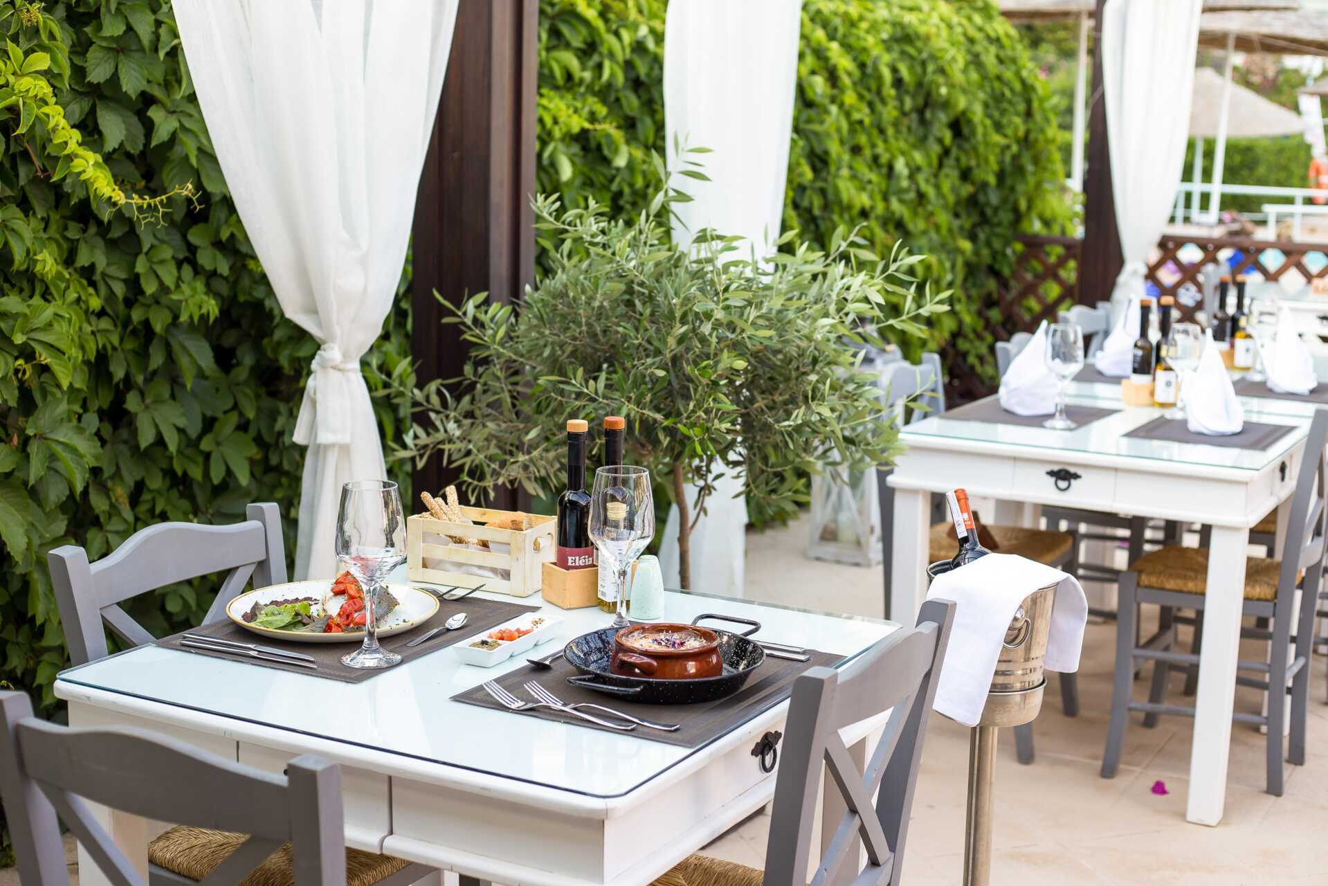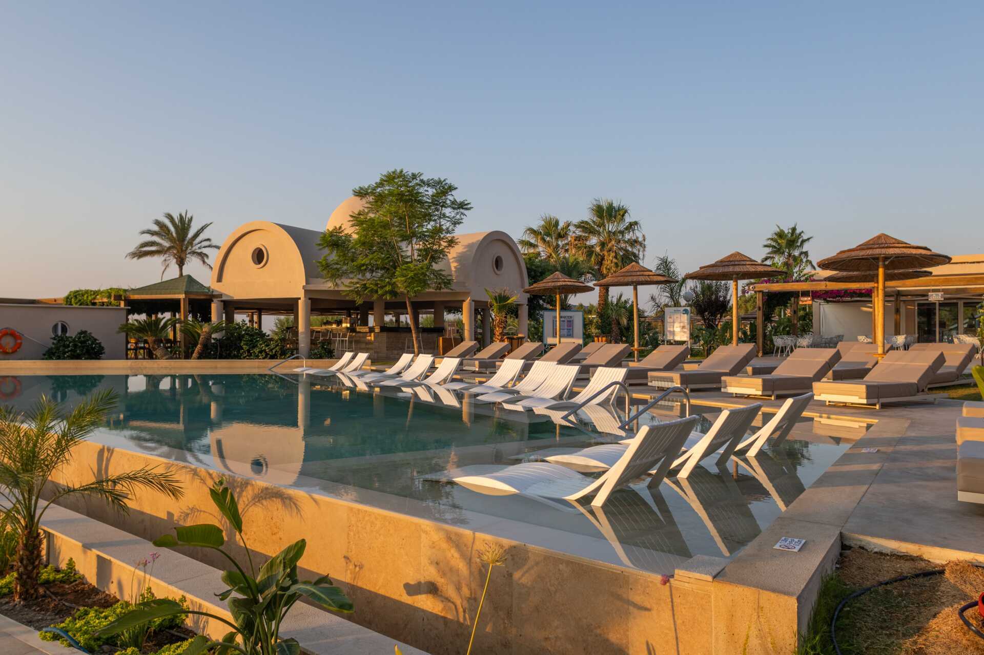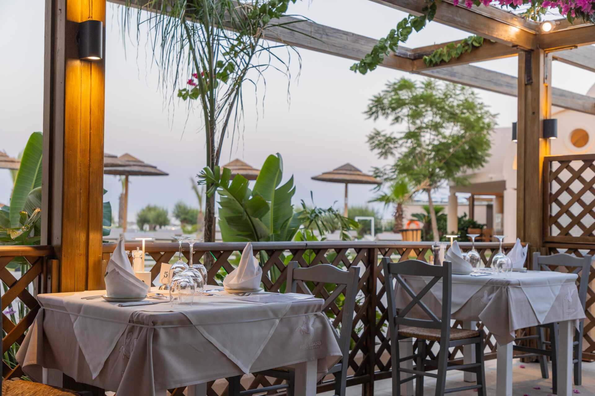 Bassengområde med to basseng, et separat barnebasseng og en morsom vannlekepark for de yngste. Solsenger og parasoller kan lånes ved bassenget og på stranden rett nedenfor hotellet. Poolbar. Bufférestauranten Ambrosia serverer frokost, lunsj og middag. À la carte-restauranten Elia serverer middag med greske smaker. I tillegg til disse finnes det også Formaio Pizzaria, Meet the Greek gyros grill og Choco Crêperie som serverer sine spesialiteter fra lunsj og utover ettermiddagen. Pent antrekk til middagen, lange bukser og overdeler med ermer for menn. Ingen flip-flops eller badetøy.