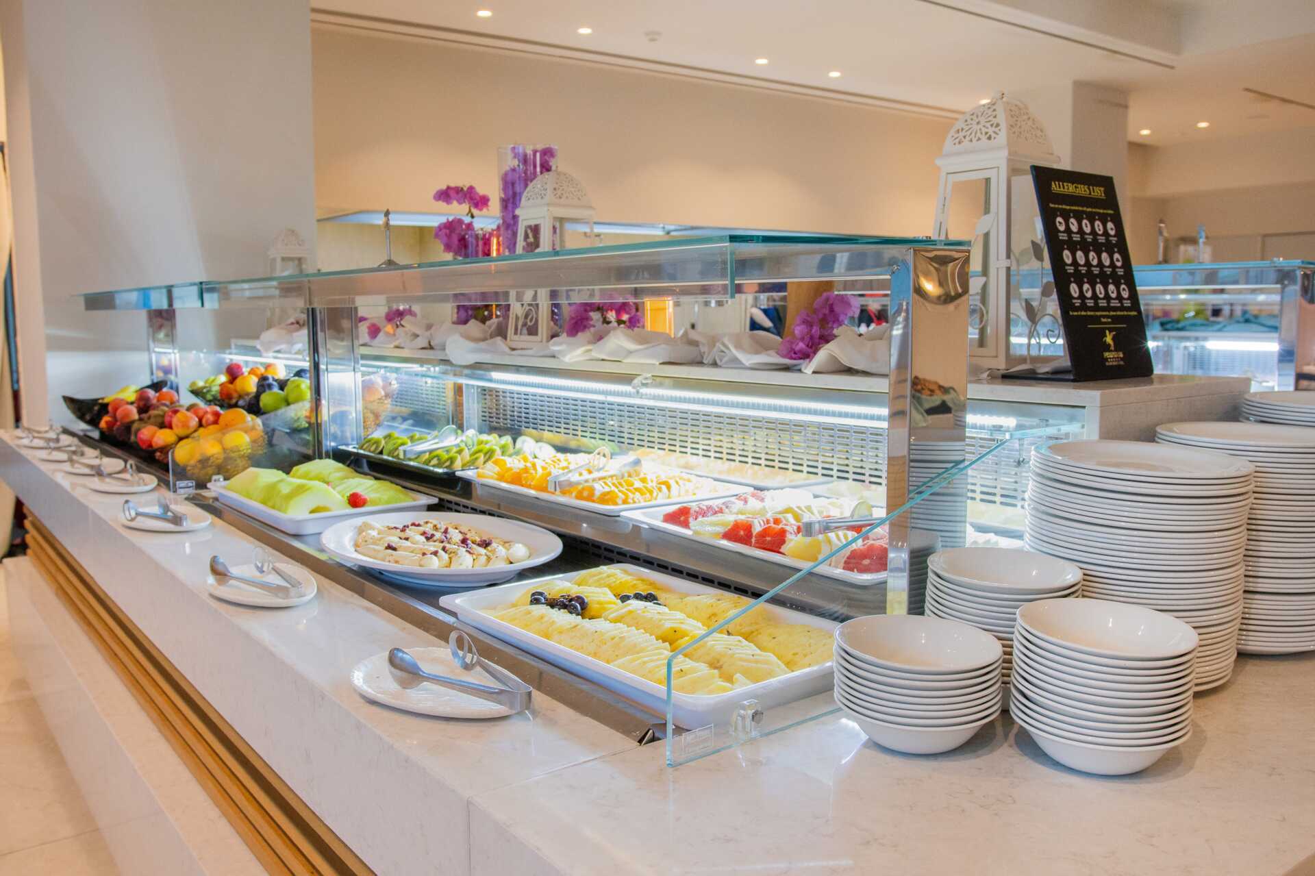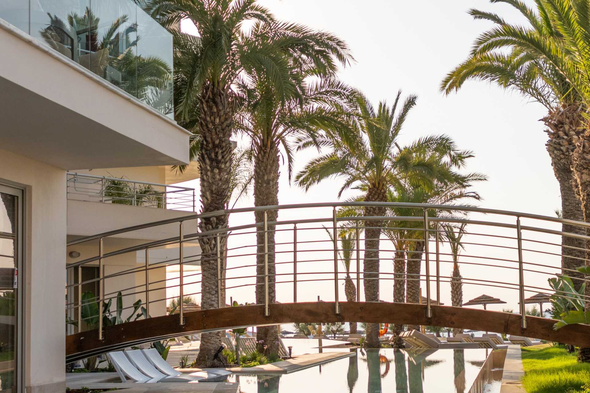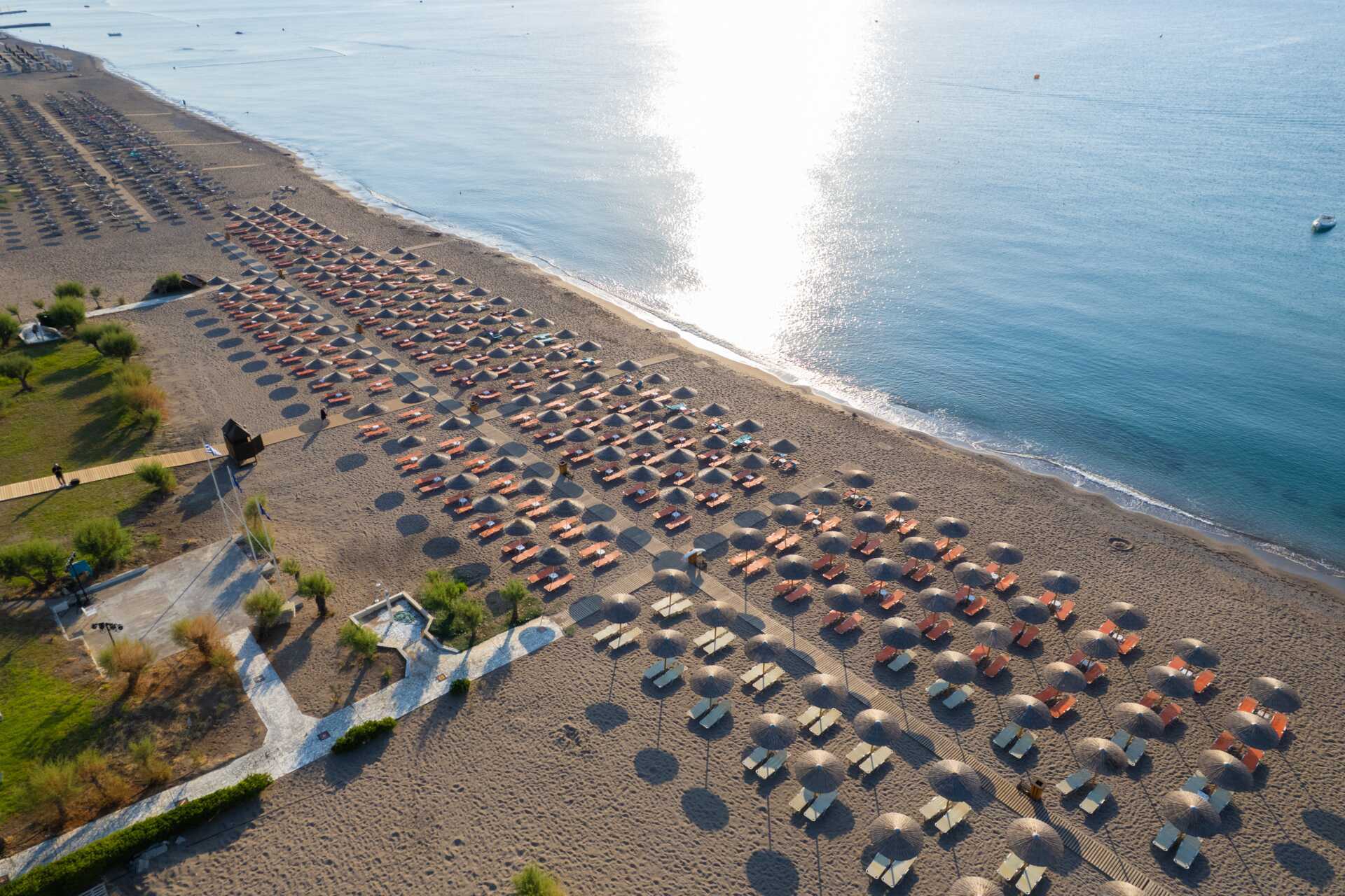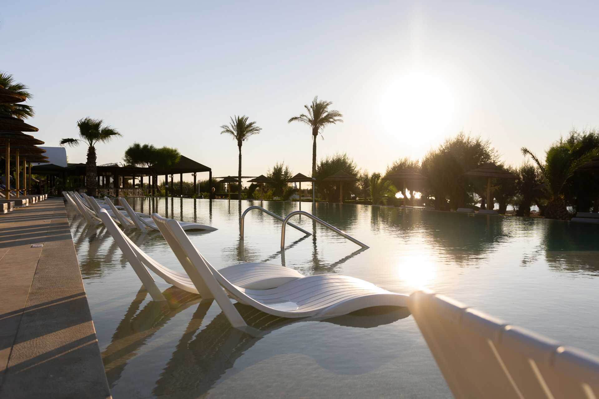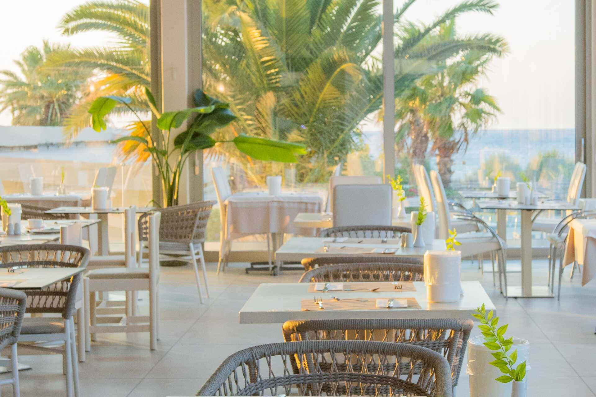 Bassengområde med to basseng, et separat barnebasseng og en morsom vannlekepark for de yngste. Solsenger og parasoller kan lånes ved bassenget og på stranden rett nedenfor hotellet. Poolbar. Bufférestauranten Ambrosia serverer frokost, lunsj og middag. À la carte-restauranten Elia serverer middag med greske smaker. I tillegg til disse finnes det også Formaio Pizzaria, Meet the Greek gyros grill og Choco Crêperie som serverer sine spesialiteter fra lunsj og utover ettermiddagen. Pent antrekk til middagen, lange bukser og overdeler med ermer for menn. Ingen flip-flops eller badetøy.