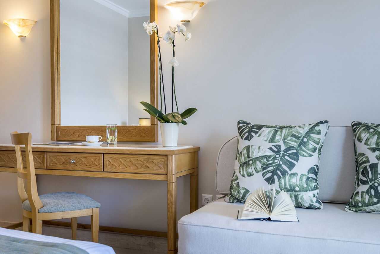 Dobbeltrom med balkong eller terrasse, noen med havutsikt. En dobbeltseng eller to enkeltsenger. Mulig med en ekstraseng i sovesofa. Wifi, luftkondisjonering og safe inkludert. Minibar med vann, brus og øl inkludert, etterfylles annenhver dag. Vannkoker samt kaffe og te. TV. Badekåper og tøfler Hårføner. Badekar eller dusj samt wc. Rengjøring 7 ggr/uke.