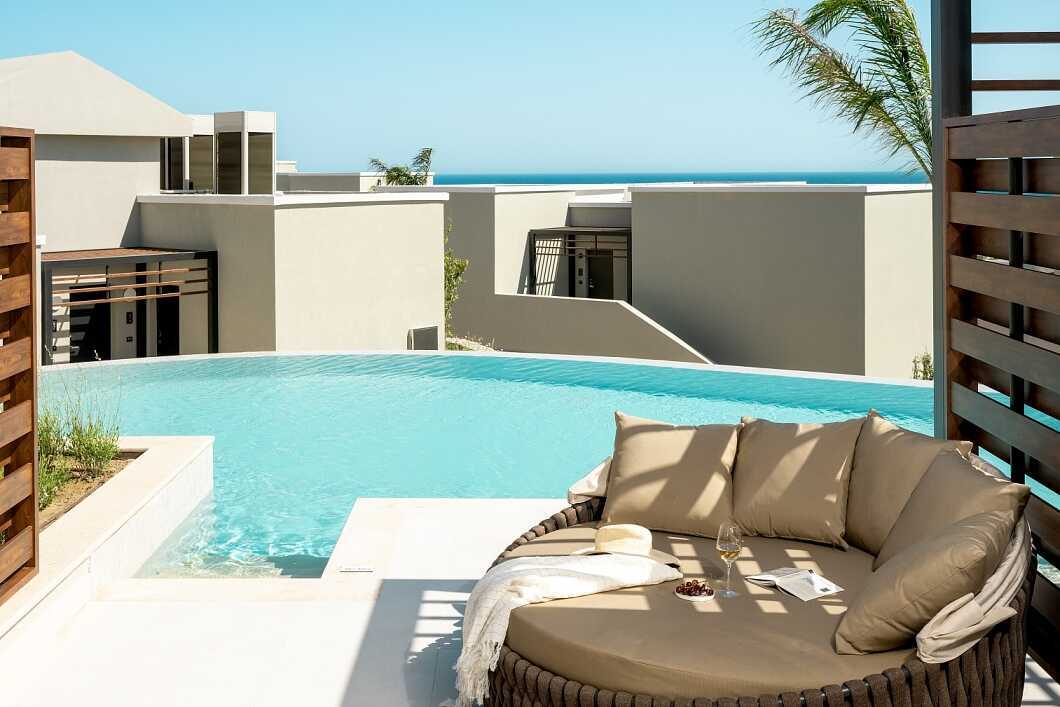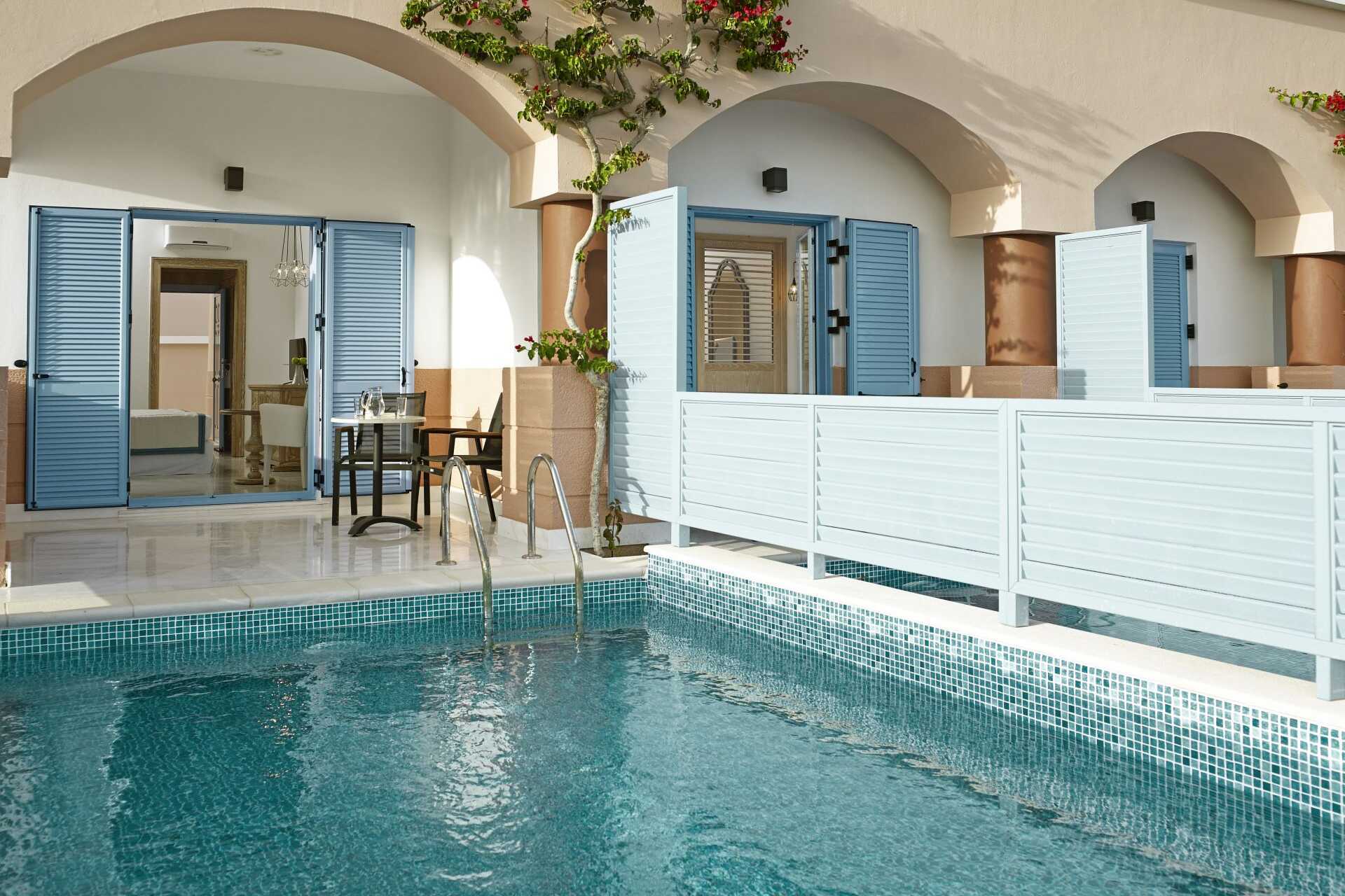 Superiorrom med uteplass og eget basseng. En dobbeltseng eller to enkeltsenger. Mulig med ekstraseng i enkeltseng eller i sovesofa. Wifi, luftkondisjonering og safe inkludert. Minibar med vann, brus og øl inkludert, etterfylles annenhver dag. Vannkoker samt kaffe og te. Nespresso kaffemaskin – kapsler inkludert og etterfylles daglig. TV. Badekåper og tøfler Hårføner. Dusj og wc. Rengjøring 7 ggr/uke. Barn under 2 år regnes inn i maksantallet i rommet.