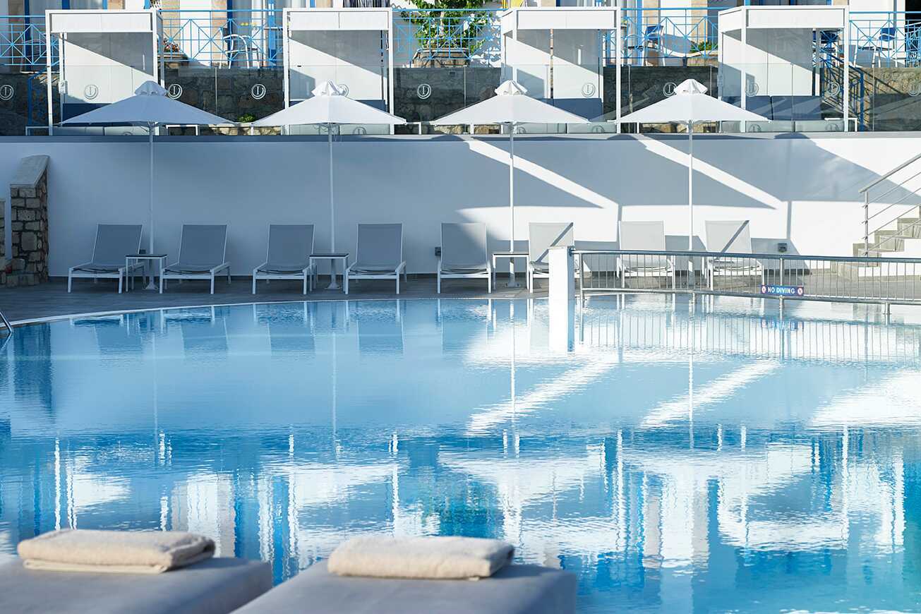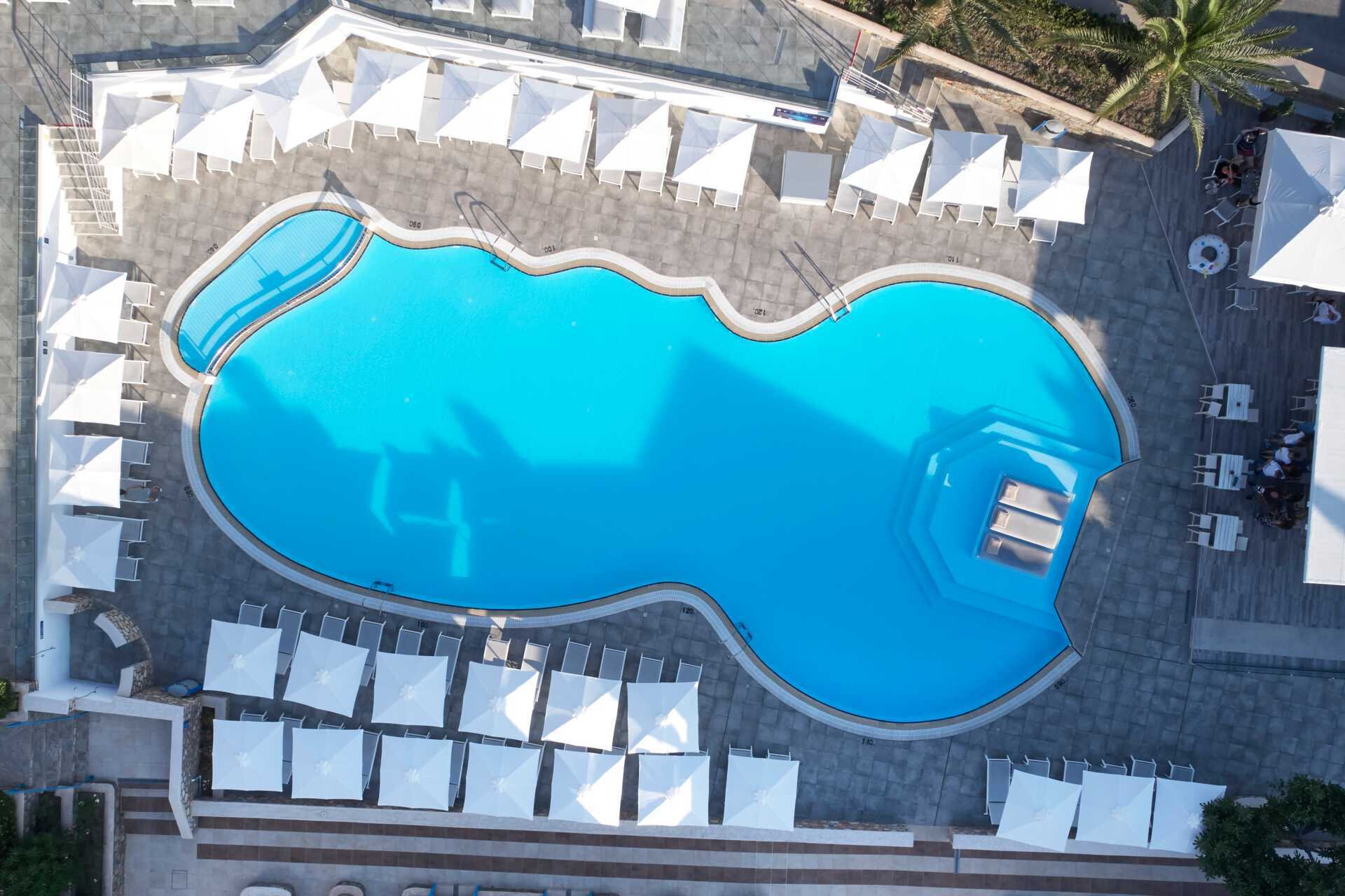 To bassengområder med basseng og separat barnebasseng. Det finnes også en poolbar ved hvert bassengområde som serverer drikke og lette måltider. Bassenget er omgitt av solsenger og parasoller. Det er cirka 200 meter til den familievennlige sandstranden med solsenger til leie. Hotellet, som består av 10 bygninger på 2–3 etasjer, har en god beliggenhet nær stranden og hovedgaten i Pefkos. Et større utvalg av restauranter og shoppingmuligheter finner du i Lindos, omtrent 4,5 kilometer. Ønsker du et enda større utvalg kan du ta turen inn til Rhodos by, men dit er det litt over 50 kilometer. Leiebil, lokalbuss eller taxi tar deg enkelt dit.