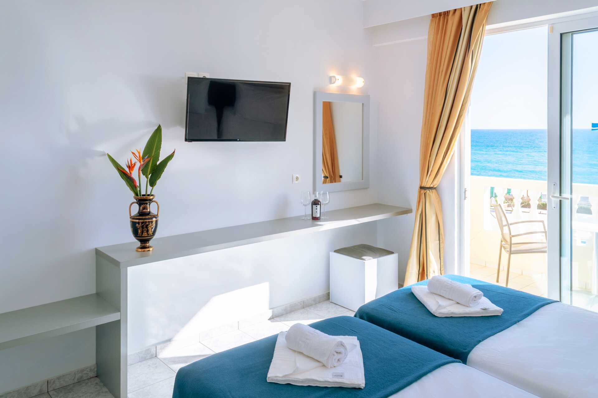 Ettromsleilighet med balkong eller markterrasse. Noen balkonger har havutsikt eller begrenset havutsikt. Minikjøkken. To enkeltsenger. Mulig med en ekstraseng i sovesofa. Minikjøkken med kokeplater, kjøleskap, vannkoker og enkelt kjøkkenutstyr. Wifi, safe og luftkondisjonering inkludert. TV med lokale kanaler. Hårføner. Dusj og wc. Rengjøring 6 ggr/uke.