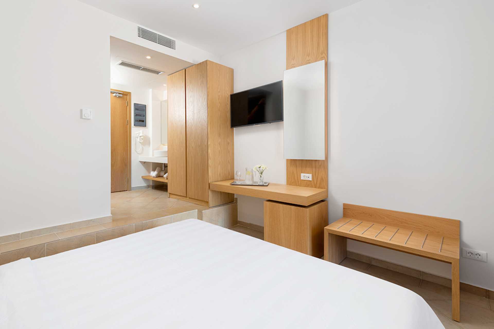 Superiorrom med balkong eller terrasse og begrenset havutsikt. En dobbeltseng eller to enkeltsenger. Mulig med ekstraseng i enkeltseng eller i feltseng. Wifi og luftkondisjonering inkludert. Kjøleskap. TV. Hårføner. Baderom med dusj og wc. Rengjøring 7 ggr/uke.