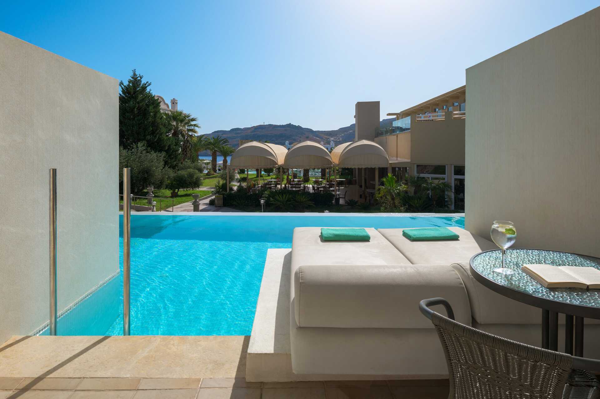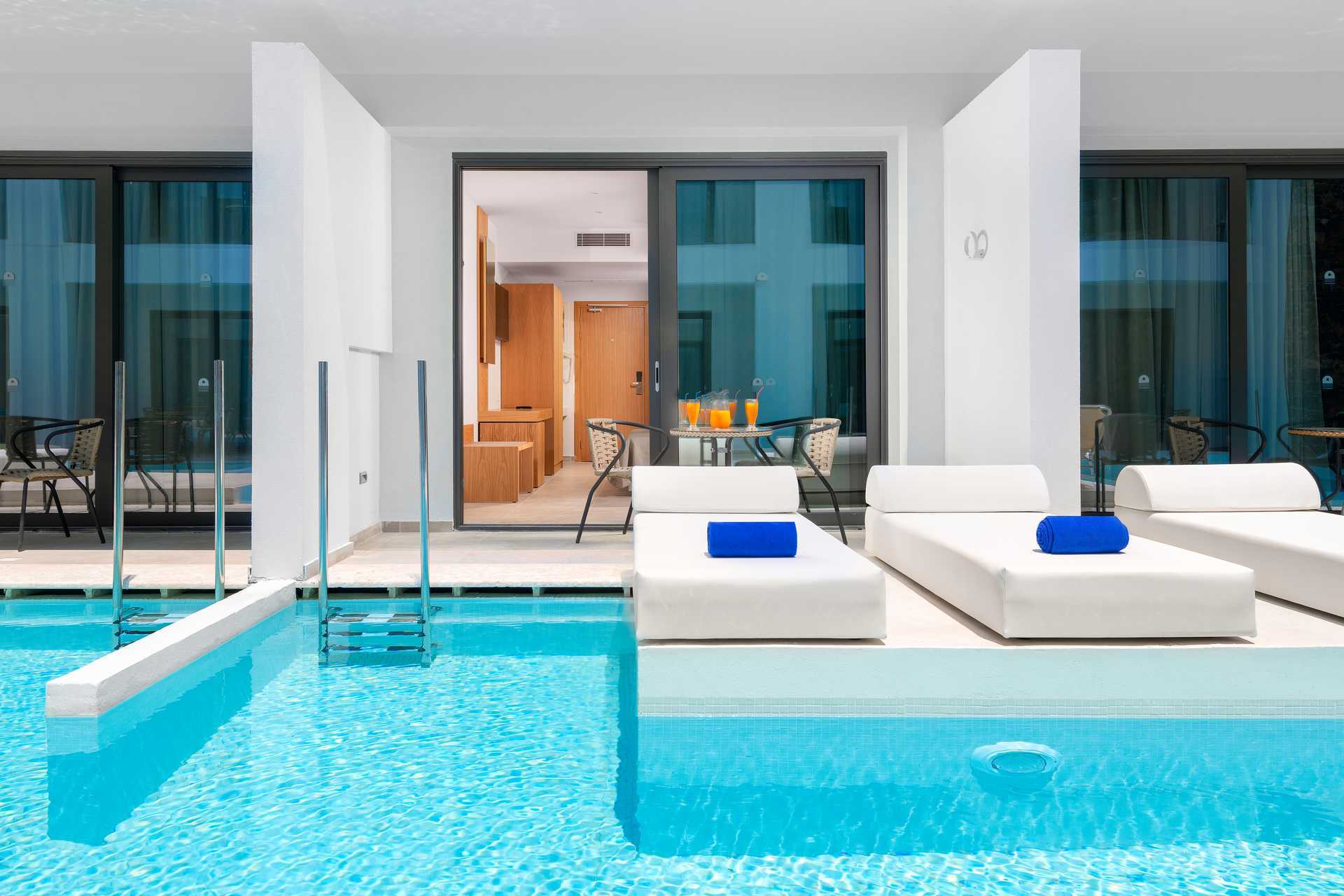 Deluxerom med uteplass og delt basseng. På uteplassen er det to stoler og et bord samt to behagelige solsenger. En dobbeltseng eller to enkeltsenger. Wifi og luftkondisjonering inkludert. Kjøleskap. TV. Hårføner. Baderom med dusj og wc. Rengjøring 7 ggr/uke.