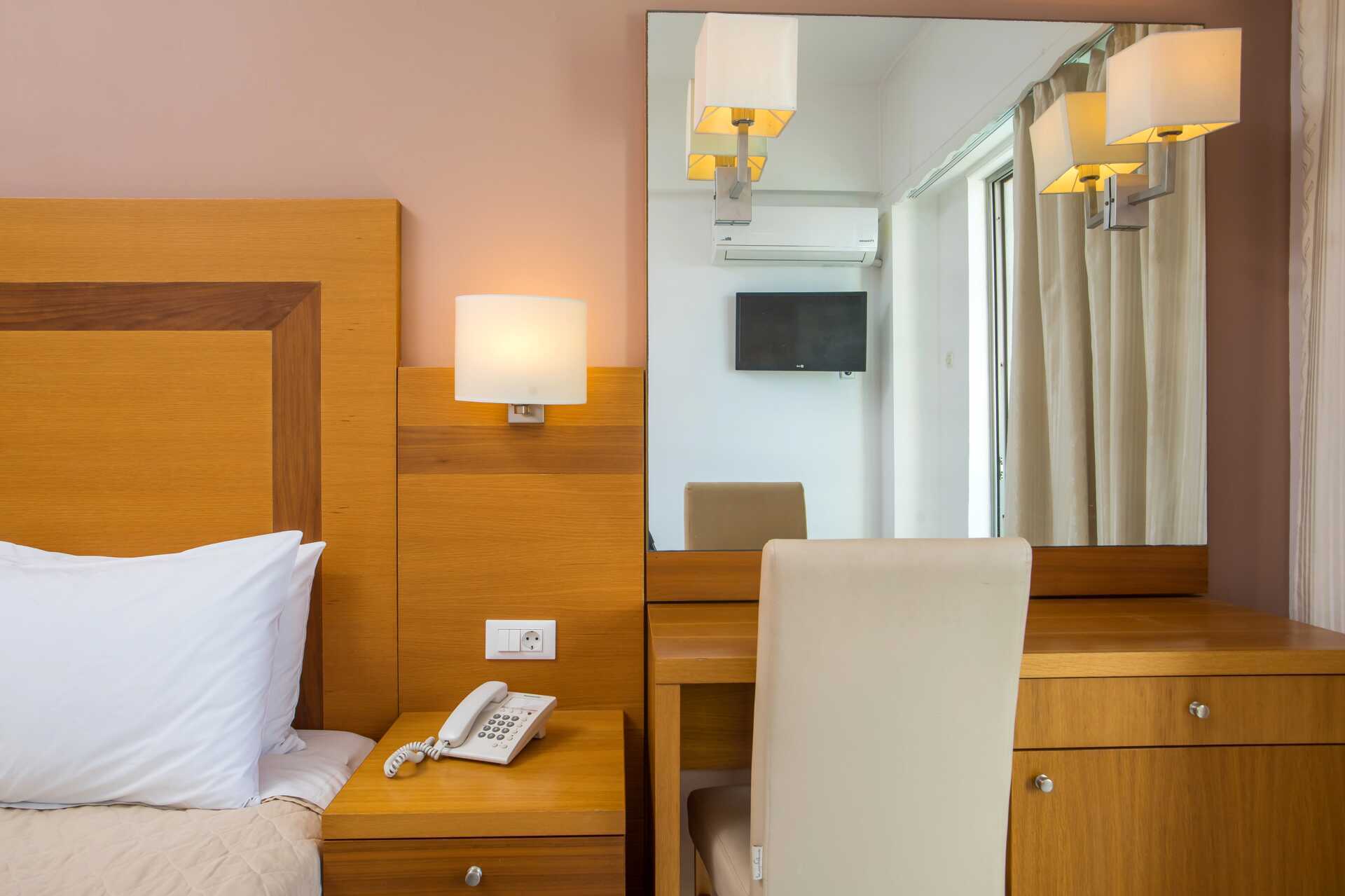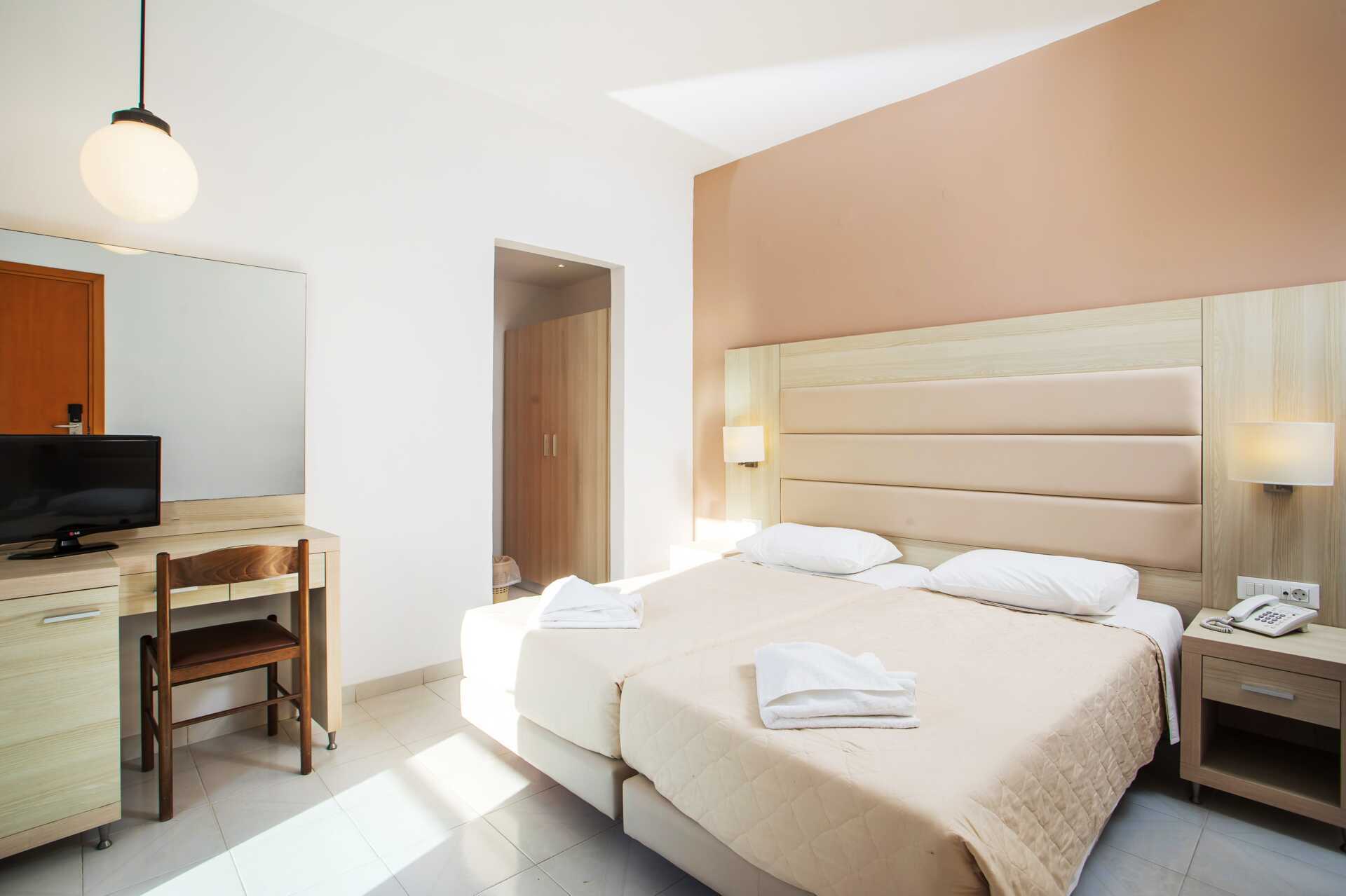 Dobbeltrom med balkong, noen med begrenset havutsikt. En dobbeltseng eller to enkeltsenger. Mulig med ekstraseng i feltseng. Luftkondisjonering er inkludert i perioden 2. juli–26. august 2025, ellers mot avgift. Wifi og safe inkludert. Kjøleskap. TV. Hårføner. Badekar eller dusj samt wc. Rengjøring 6 ggr/uke.