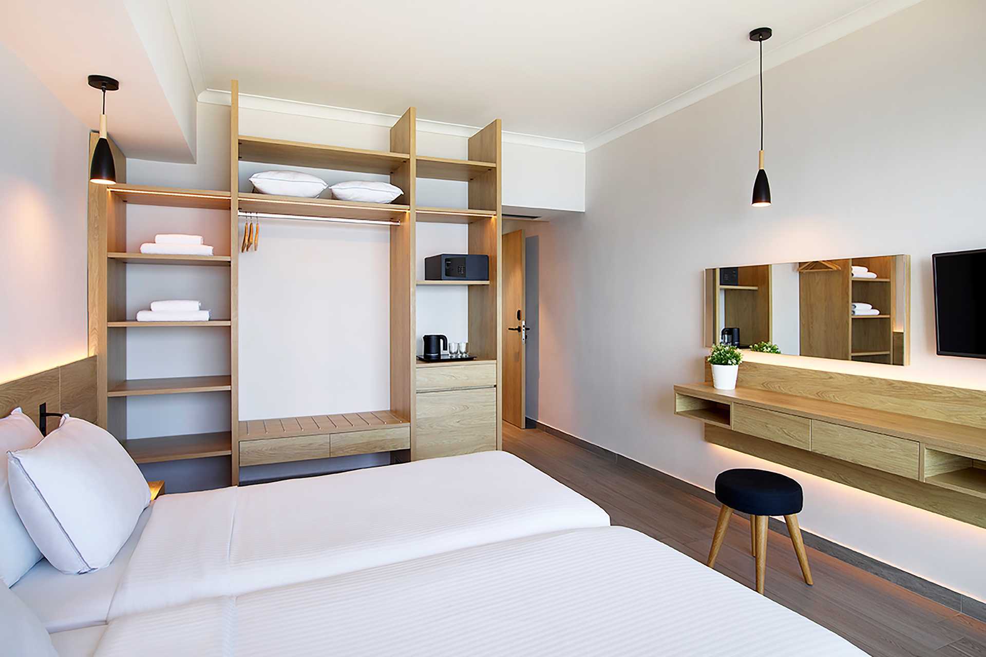 Dobbeltrom med balkong, noen med havutsikt eller begrenset havutsikt. Rommene ligger i etasjene 1 til 3. To enkeltsenger. Wifi og luftkondisjonering 20.5 til 15.10 inkludert. Safe mot avgift. Kjøleskap og vannkoker. TV. Hårføner. Baderom med dusj og wc. Rengjøring 7 ggr/uke.
