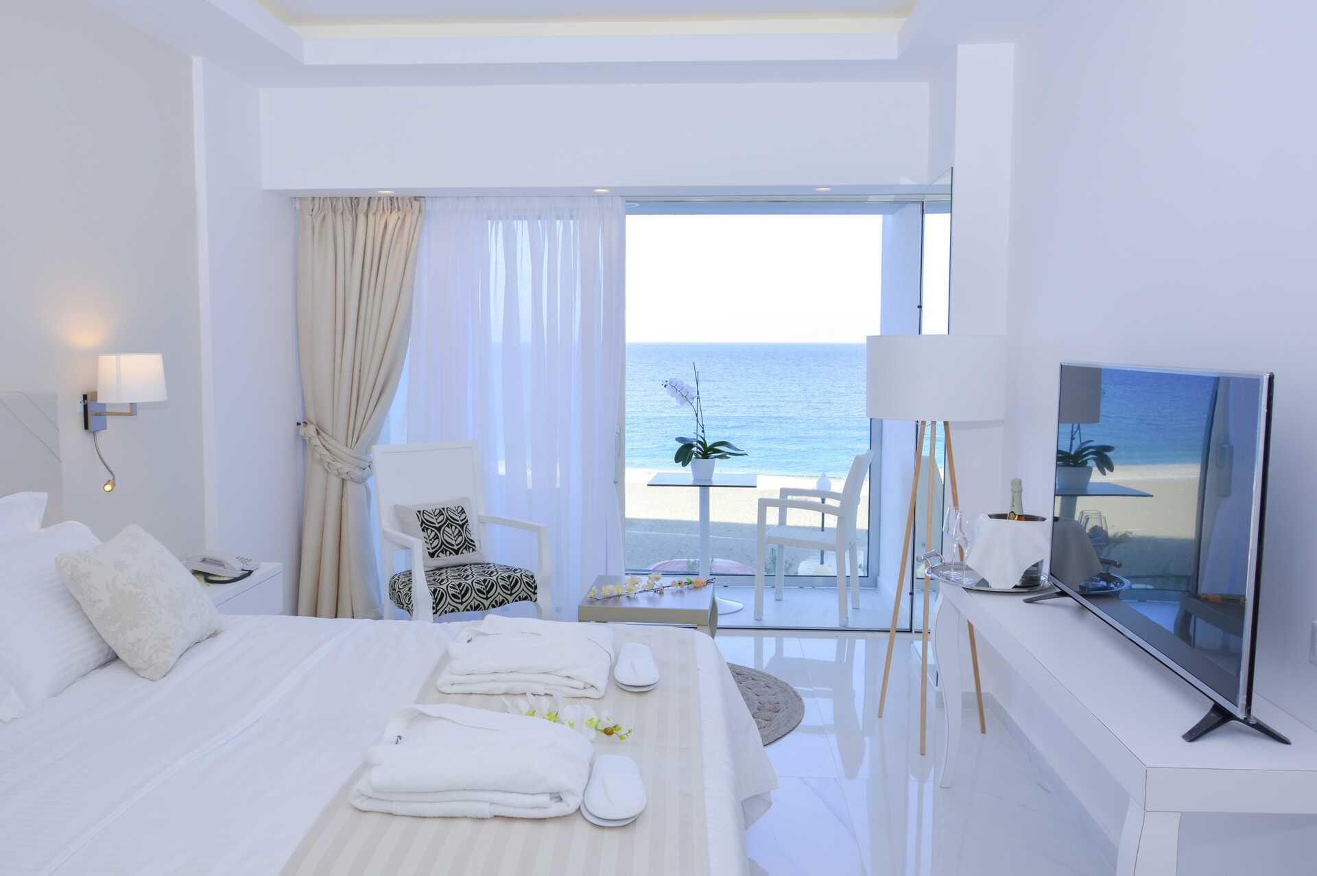 Juniorsuite med balkong og havutsikt. En dobbeltseng. Mulig med ekstrasenger i sovesofa. Wifi, sentralstyrt luftkondisjonering og safe inkludert. Kjøleskap. Vannkoker samt kaffe og te. TV. Hårføner. Baderom med dusj og wc. Rengjøring 7 ggr/uke.