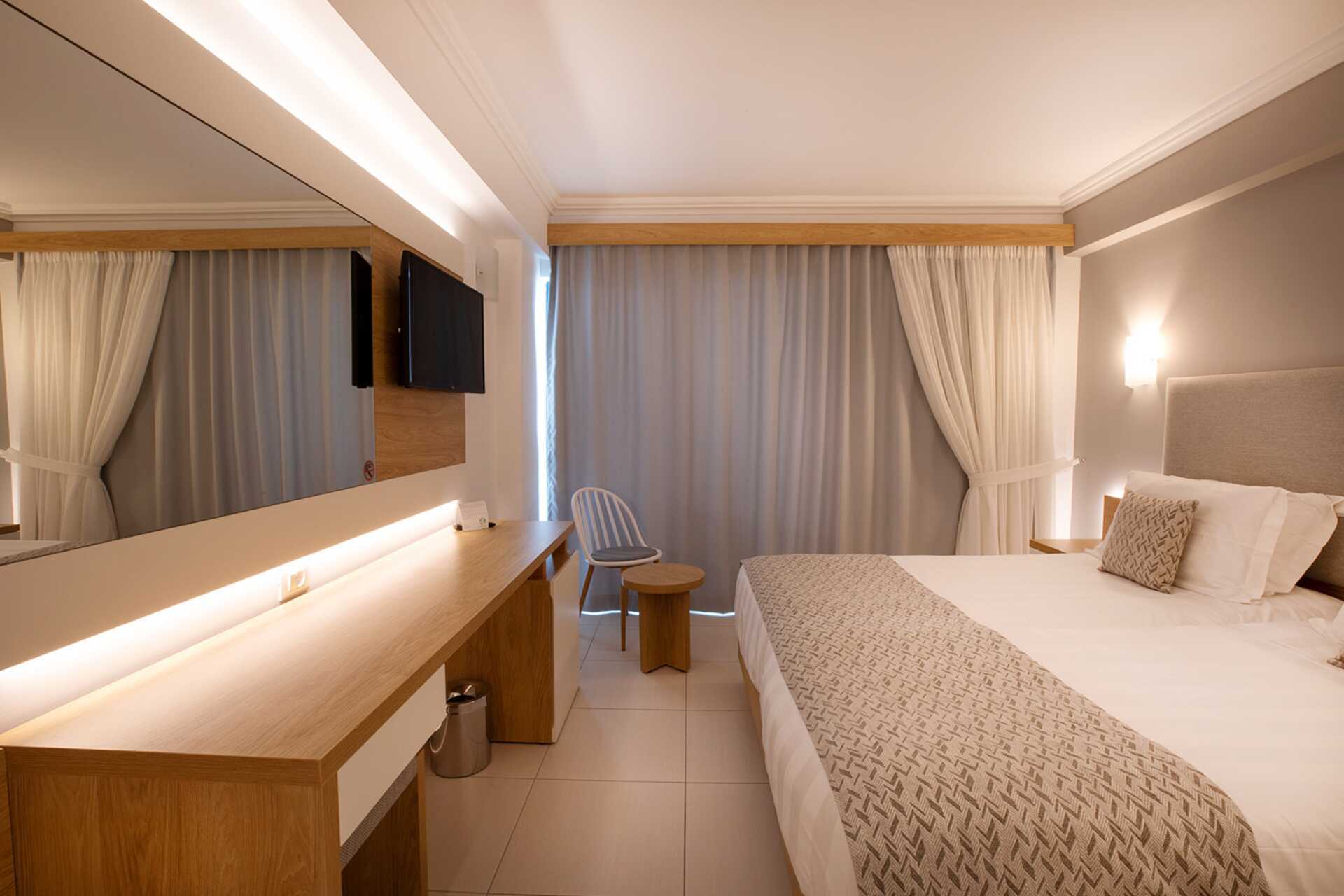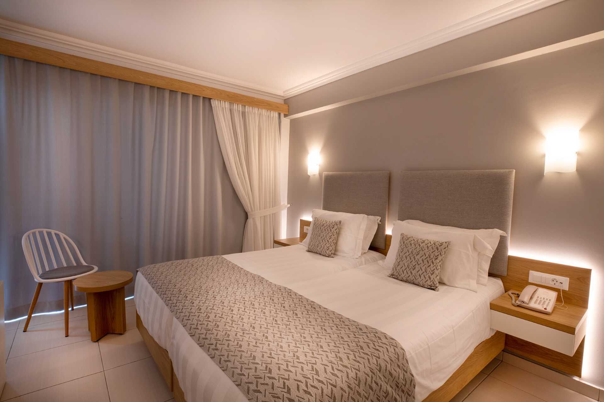 Dobbeltrom med balkong, noen med havutsikt eller begrenset havutsikt. En dobbeltseng eller to enkeltsenger. Wifi, luftkondisjonering og safe inkludert. Minibaren fylles opp ved ankomst, men fylles ikke på etter det. TV. Hårføner. Bad med dusj og wc. Rengjøring 6 ggr/uke.
