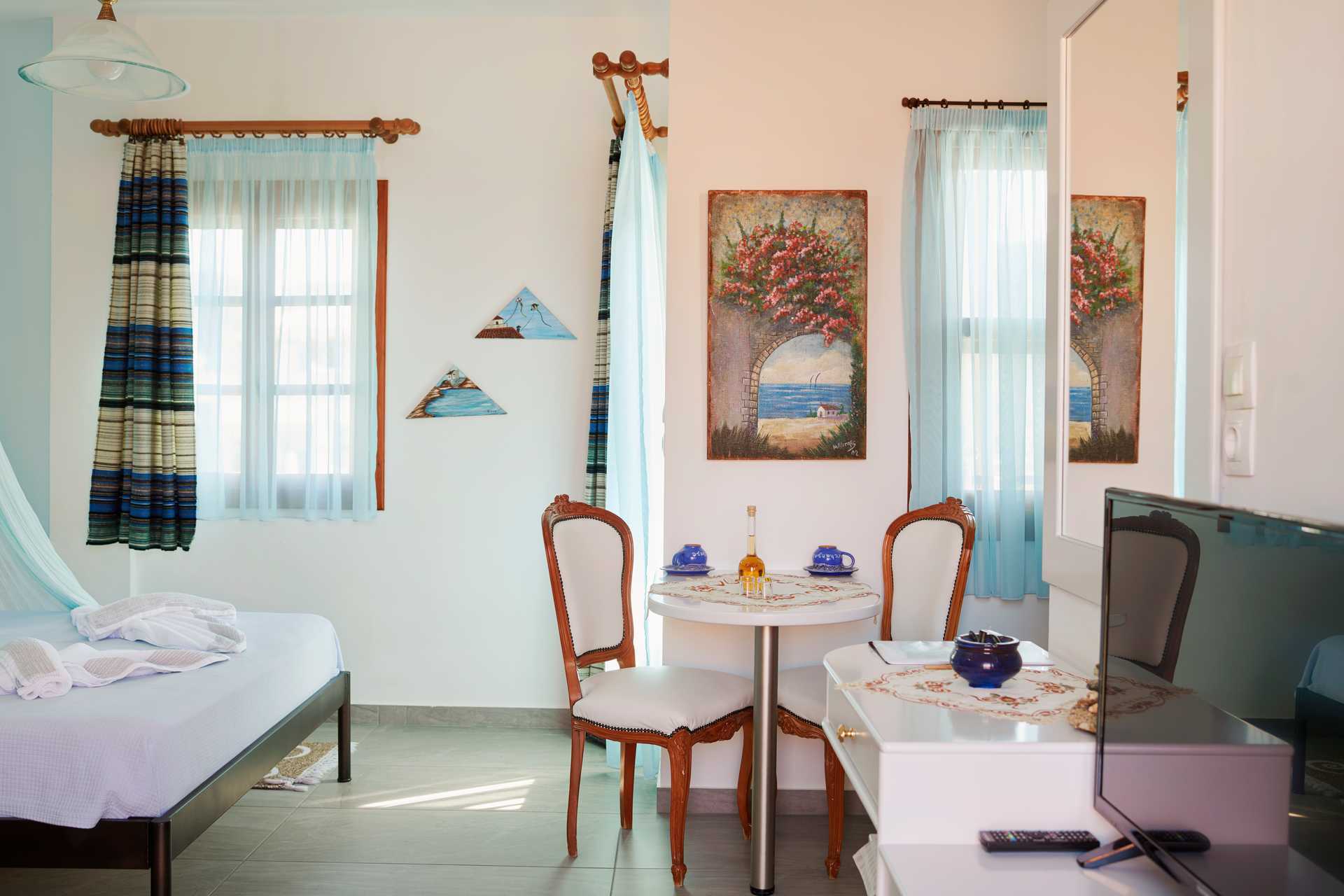Ettromsleilighet med balkong eller terrasse. Kombinert soverom og minikjøkken. En dobbeltseng eller to enkeltsenger. Minikjøkken med kokeplater, kjøleskap, vannkoker, juicepresse og enkel kjøkkenutstyr. Wifi, luftkondisjonering og safe inkludert. TV. Hårføner. Badekar eller dusj samt wc. Rengjøring 6 ggr/uke.