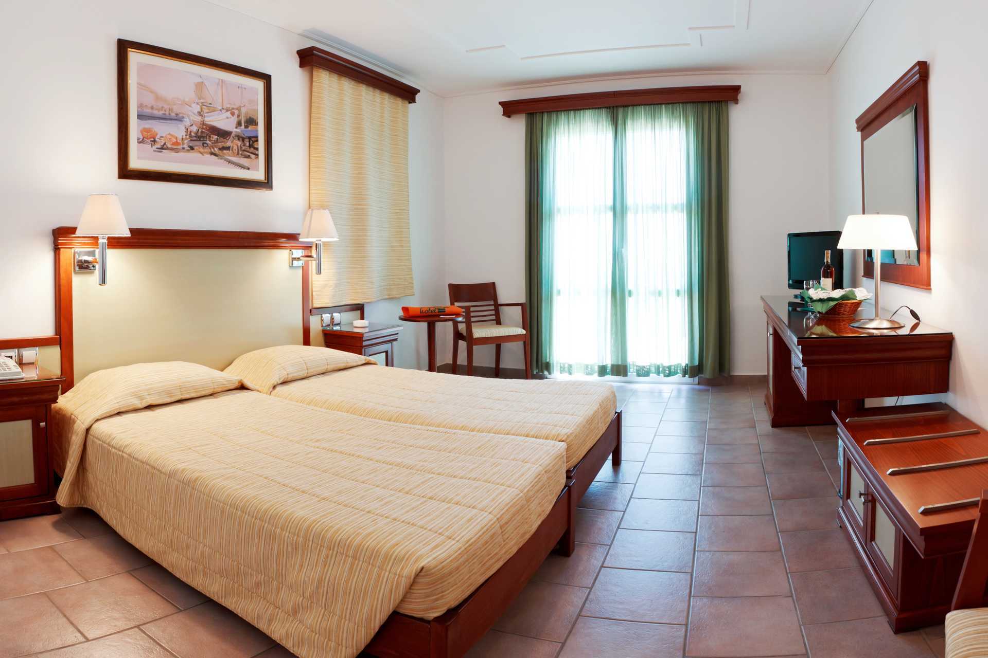 Dobbeltrom med balkong eller terrasse. To enkeltsenger. Wifi og luftkondisjonering inkludert. Safe mot avgift. Kjøleskap. TV. Badekar eller dusj samt wc. Rengjøring 7 ggr/uke.