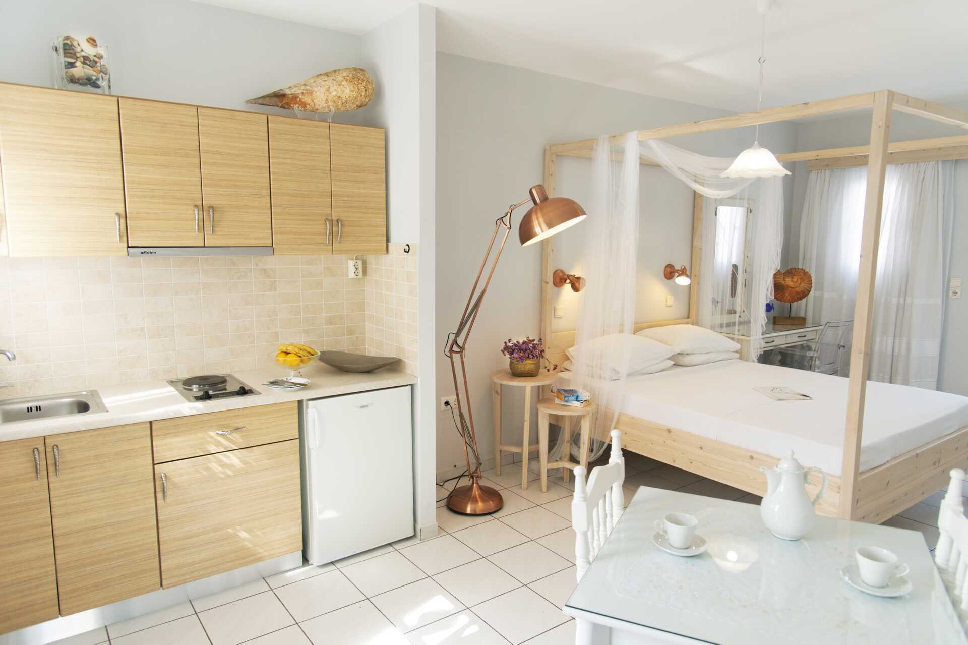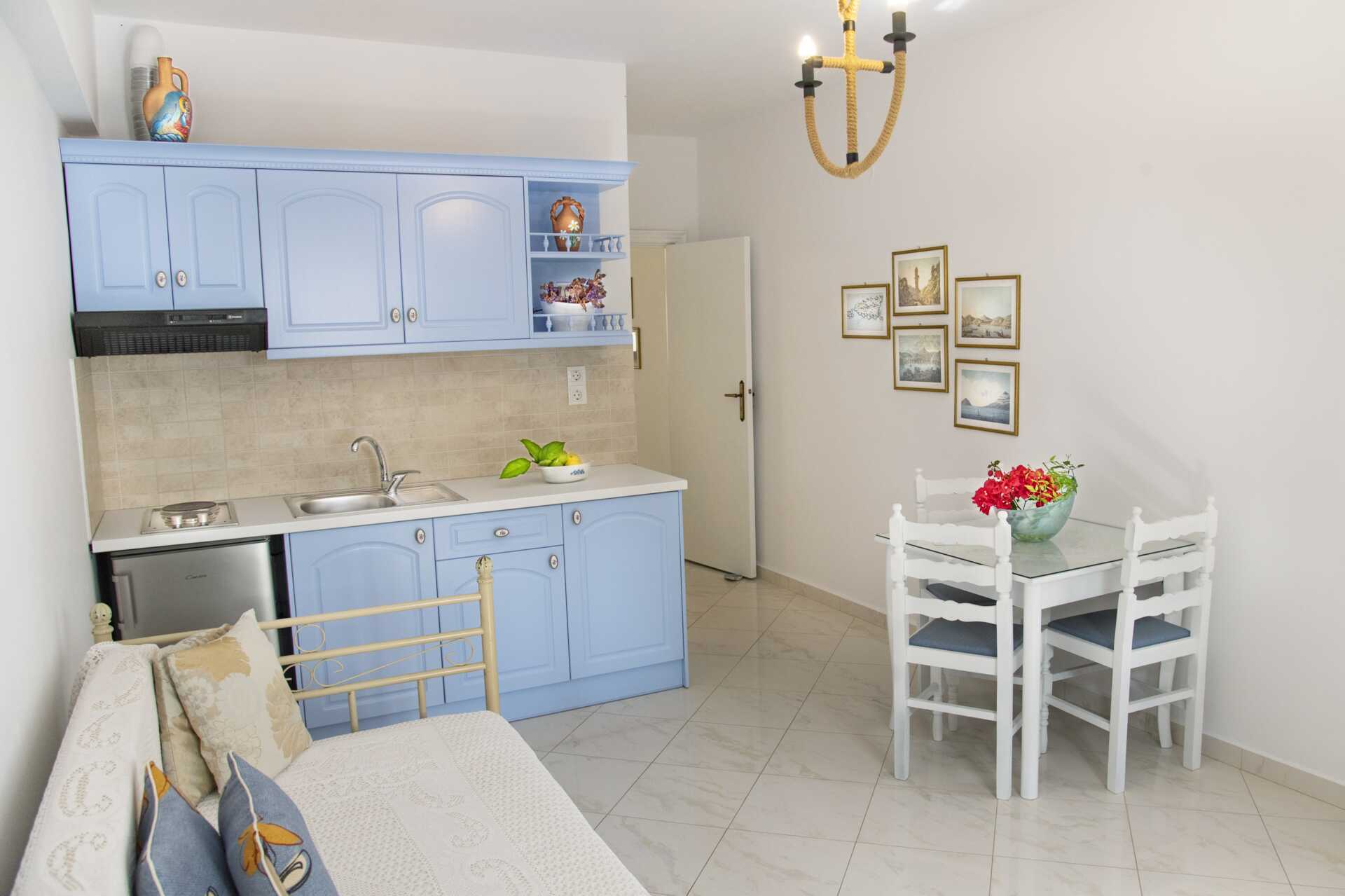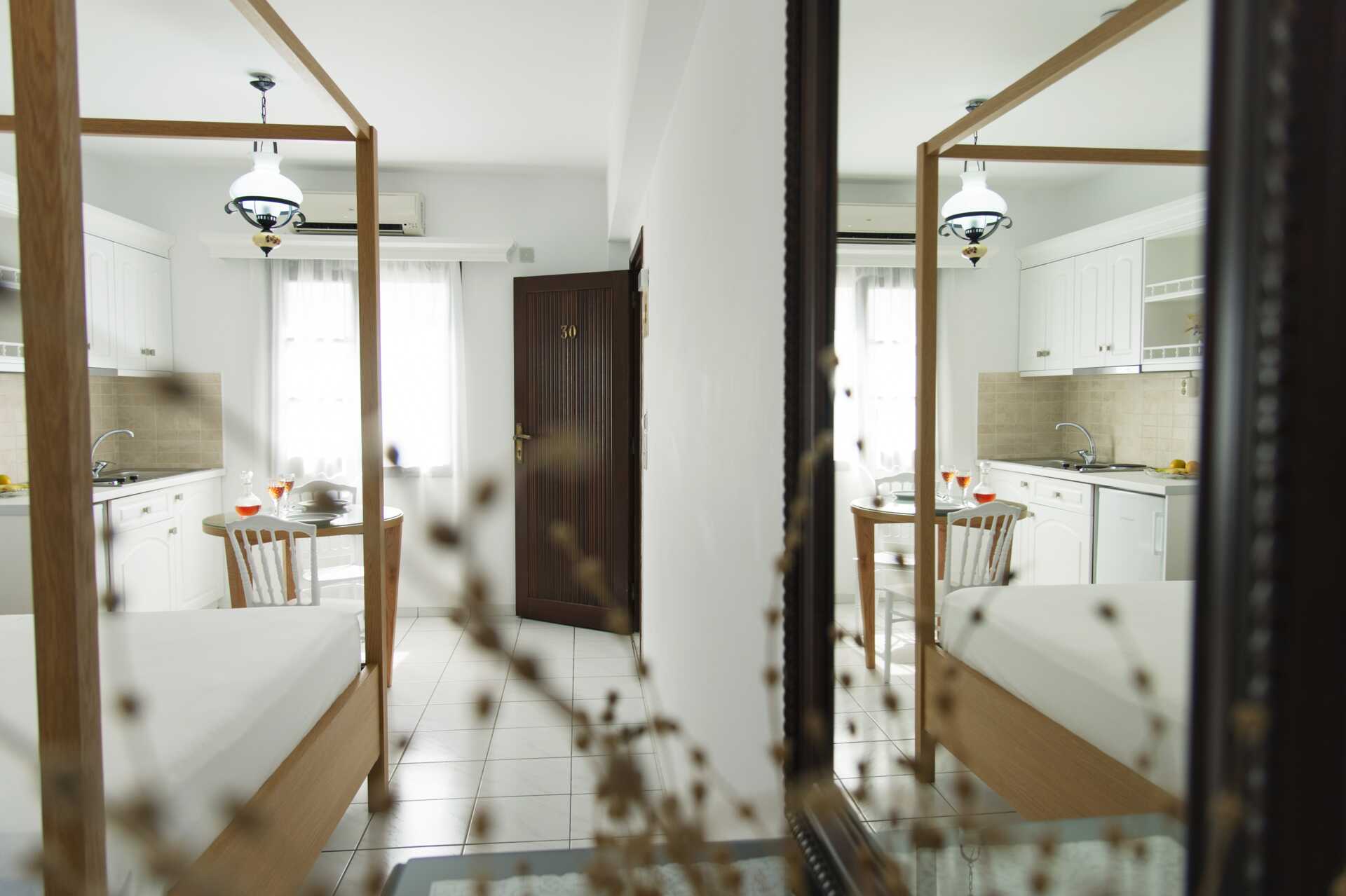 Ettromsleilighet med balkong eller terrasse av varierende størrelse med utsikt over hagen. Minikjøkken. En dobbeltseng eller to enkeltsenger. Minikjøkken med kokeplater, kjøleskap, kaffetrakter, vannkoker og enkelt kjøkkenutstyr. Wifi, luftkondisjonering og safe inkludert. Hårføner. Dusj og wc. Rengjøring 6 ggr/uke.