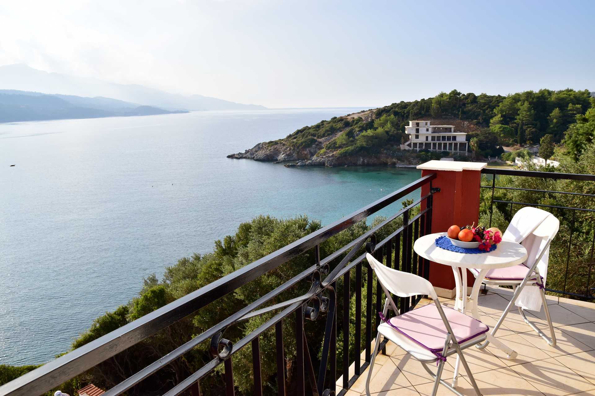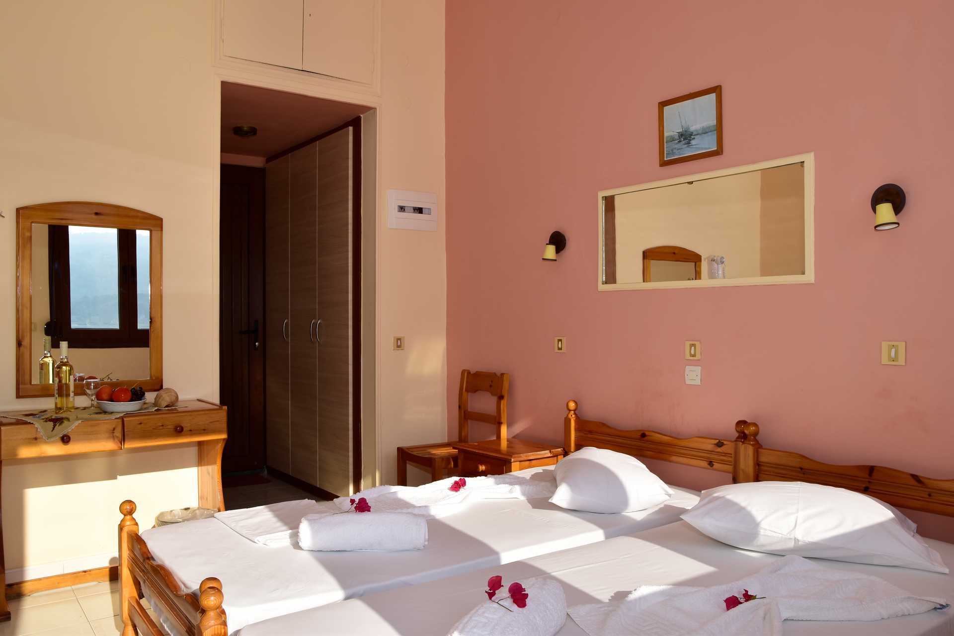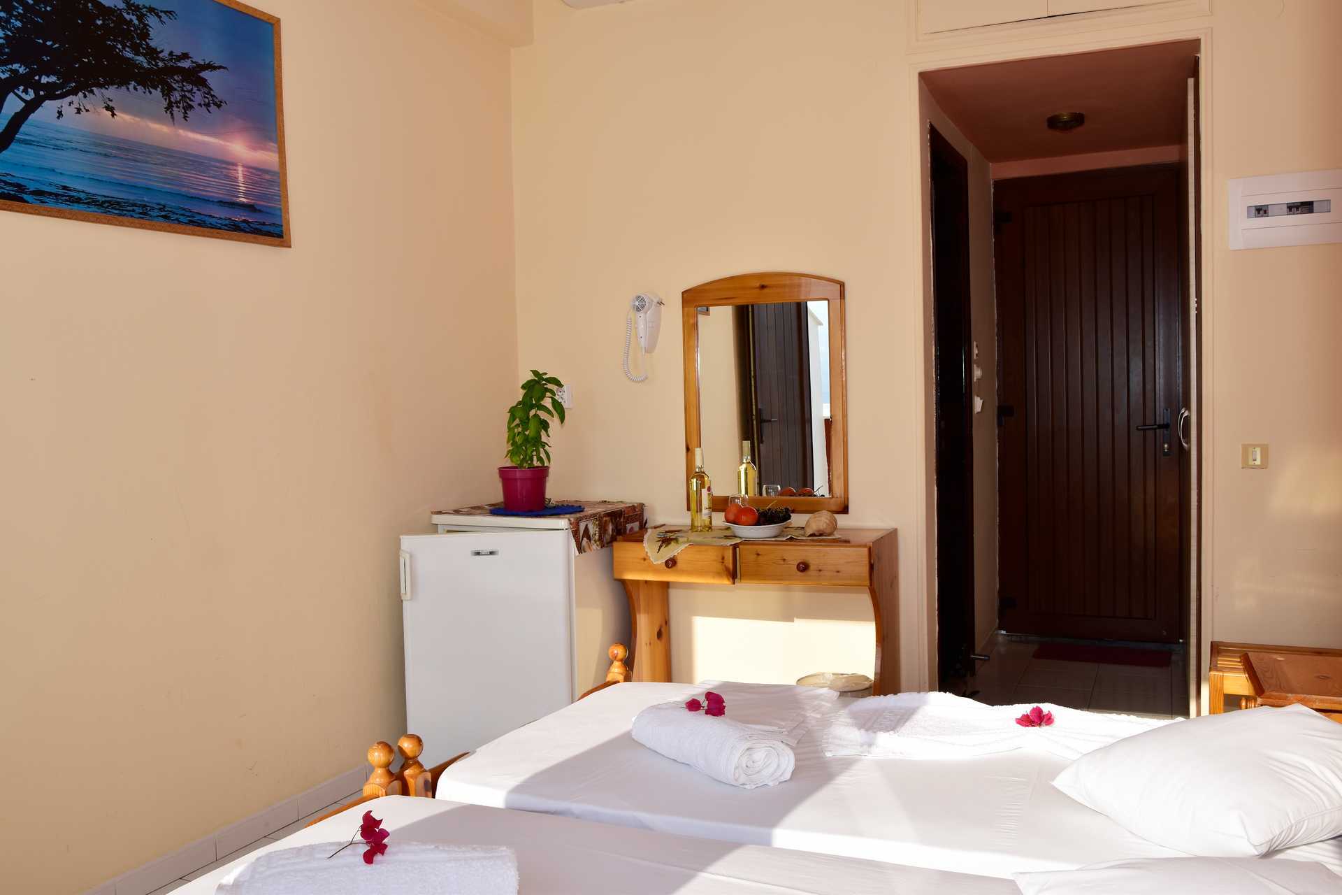 Dobbeltrom med balkong med havutsikt eller delt uteplass med begrenset havutsikt. To enkeltsenger. Takvifte. Kjøleskap kan leies. Wifi inkludert. Luftkondisjonering mot avgift. Hårføner. Baderom med dusj og wc. Rengjøring 6 ggr/uke.