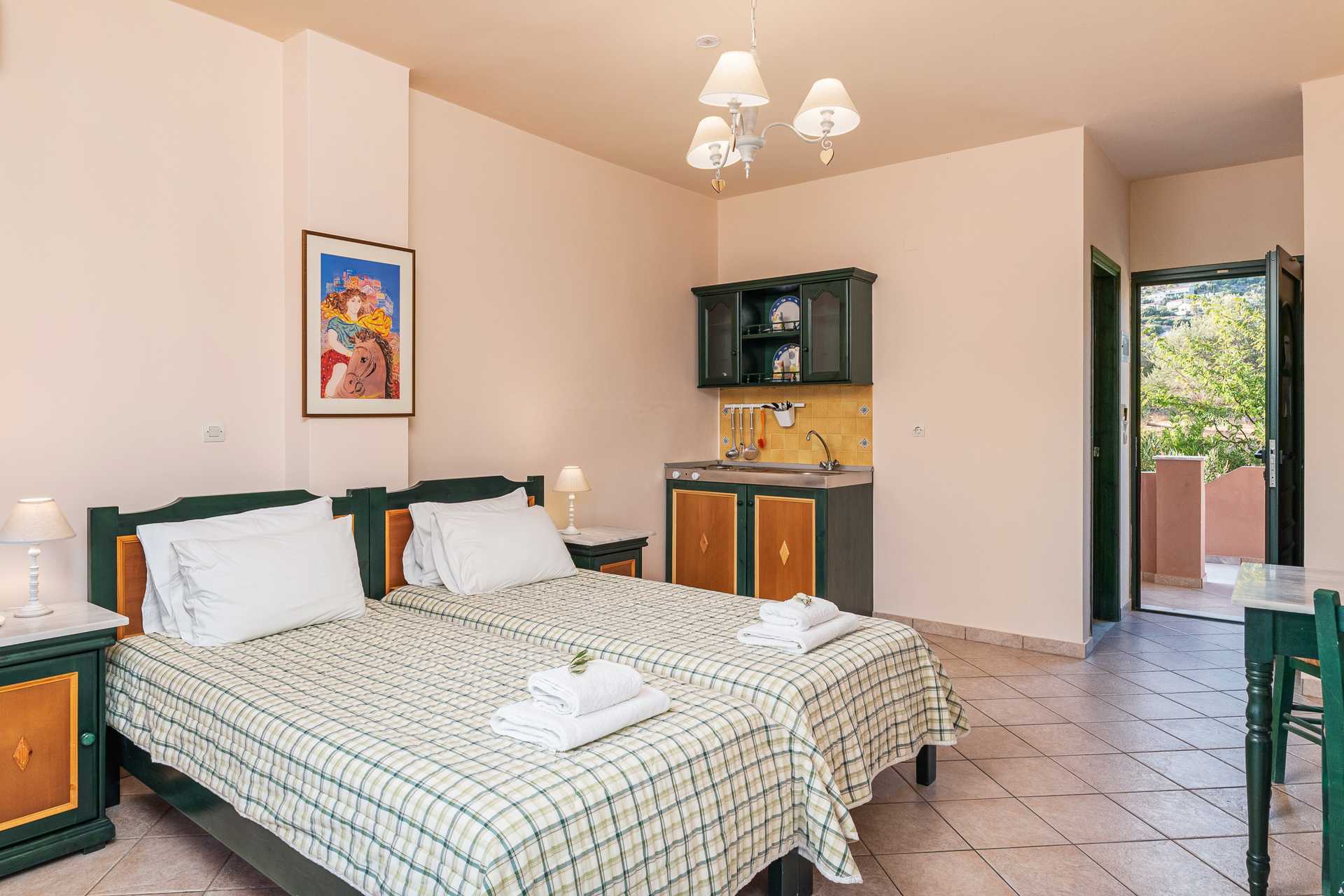 Ettromsleilighet med balkong. Minikjøkken. To enkeltsenger. Mulig med en ekstraseng i sovesofa. Minikjøkken med kokeplater, kjøleskap, vannkoker og enkelt kjøkkenutstyr. Wifi og luftkondisjonering inkludert. Safe mot avgift. TV. Hårføner. Baderom med dusj og wc. Rengjøring 6 ggr/uke.