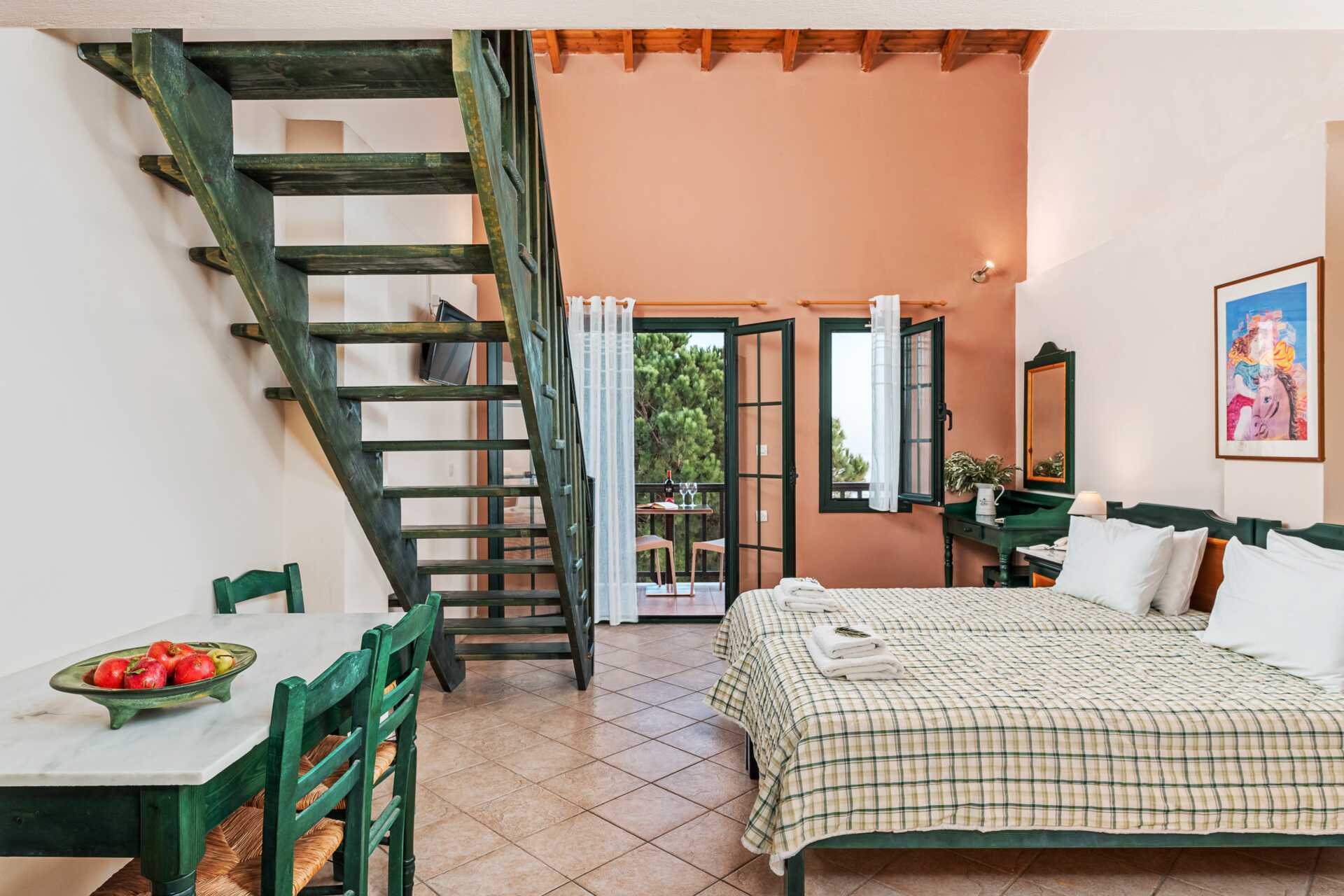 Ettromsleilighet i etasje med balkong. Nede er det et soverom med to enkeltsenger kombinert med et minikjøkken. Oppe er det en hems med to enkeltsenger. Det er åpent mellom etasjene. Minikjøkken med kokeplater, kjøleskap, vannkoker og enkelt kjøkkenutstyr. Wifi og luftkondisjonering inkludert. Safe mot avgift. TV. Hårføner. Baderom med dusj og wc. Rengjøring 6 ggr/uke.