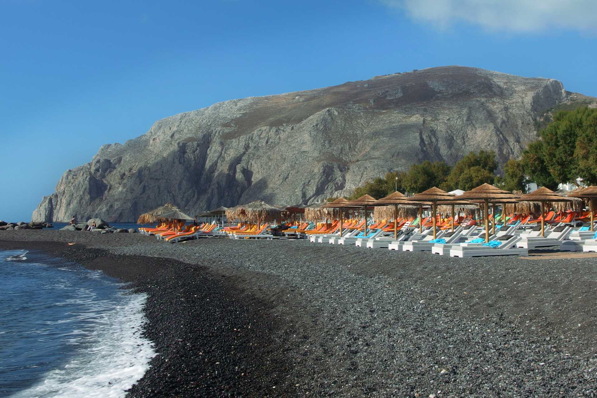 Lavastranden Kamari Beach er et fint sted å tilbringe dagen. Langs hele stranden er det solsenger og parasoller. Kjøp deg noe forfriskende å drikke og nyt flere dukkerter i sjøen. Lengter du etter et adrenalinkick, er det flere vannsporter på stranden - ta en tur på vannscooter eller prøv vannski!