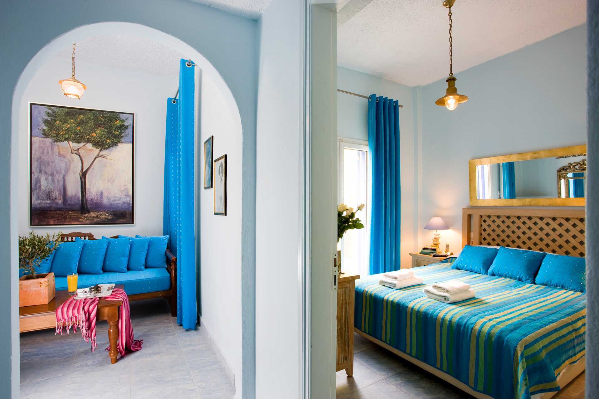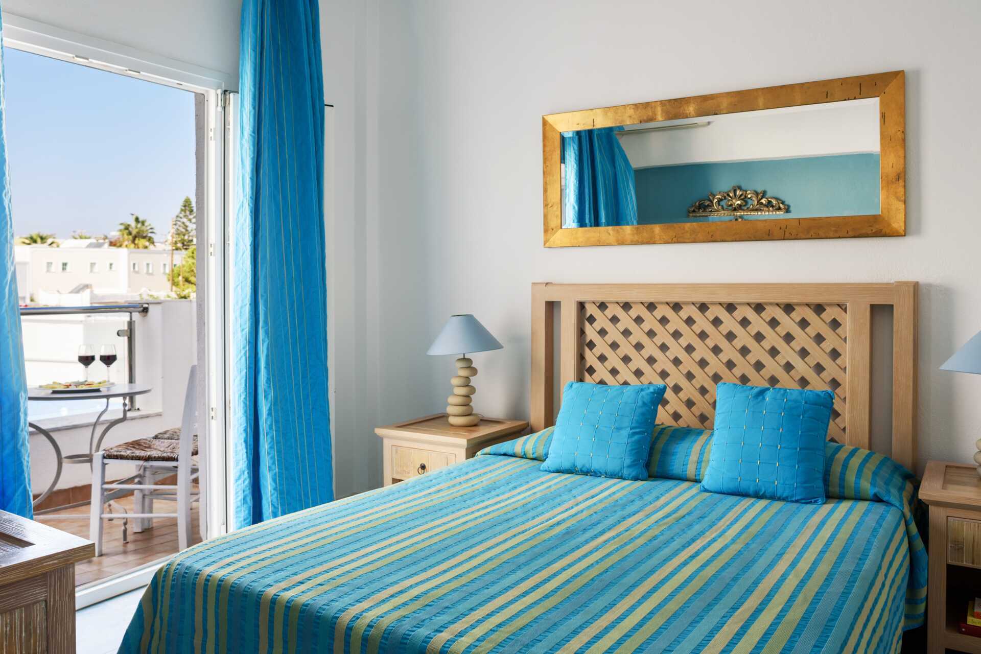 Superiorrom med balkong eller terrasse. En soveromsdel med en dobbeltseng eller to enkeltsenger. Mulig med ekstraseng i sovesofa. Wifi, luftkondisjonering og safe inkludert. Kjøleskap. TV. Dusj og wc, hårføner. Rengjøring 7 ggr/uke.