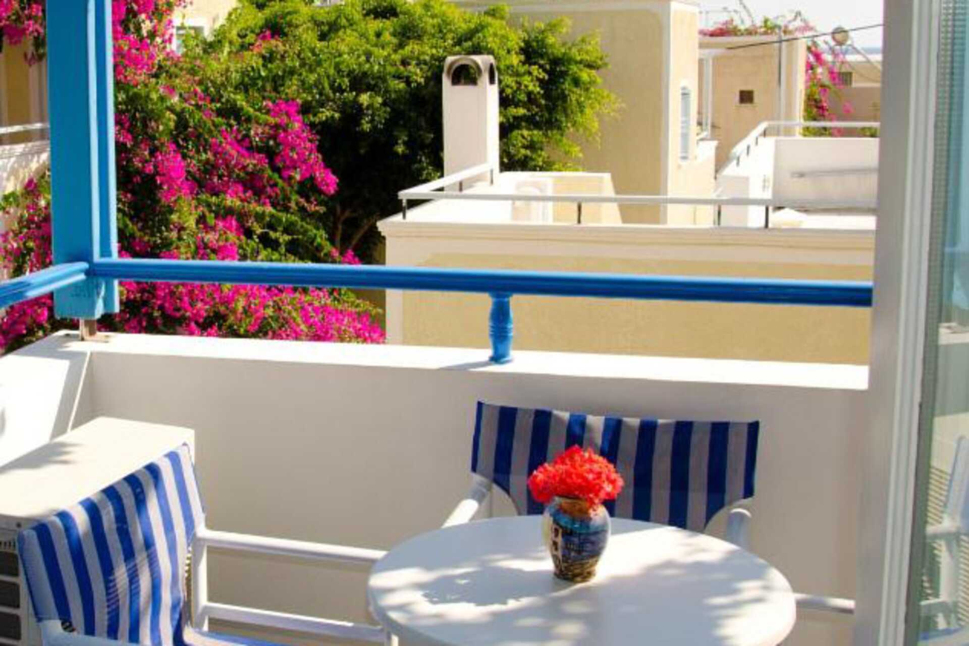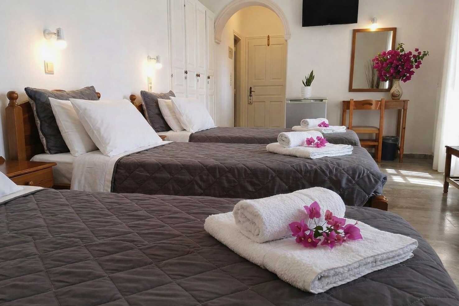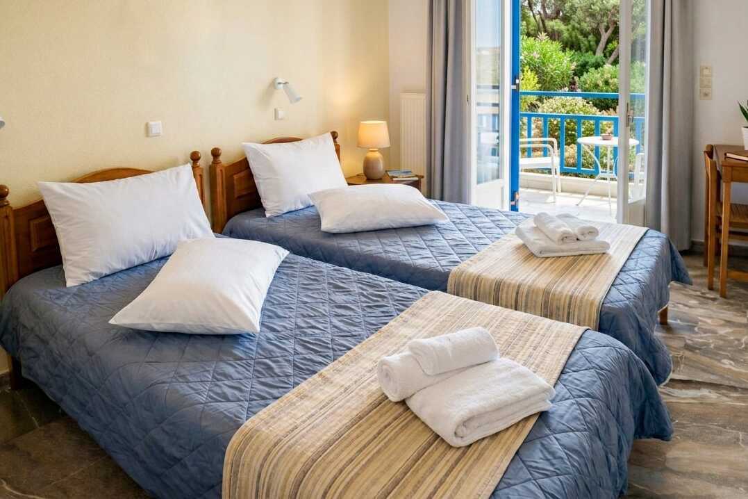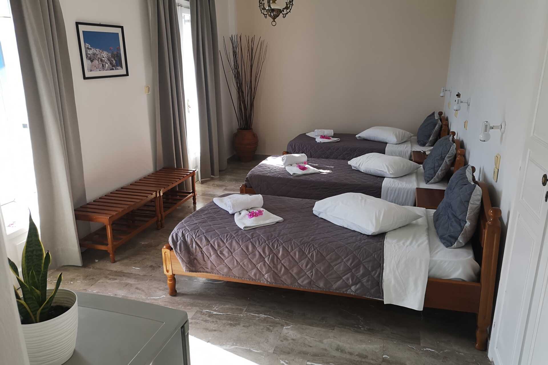 Tremannsrom med balkong. Tre enkeltsenger. Wifi, luftkondisjonering og safe inkludert. Kjøleskap. TV. Hårføner. Dusj og wc. Rengjøring 6 ggr/uke.