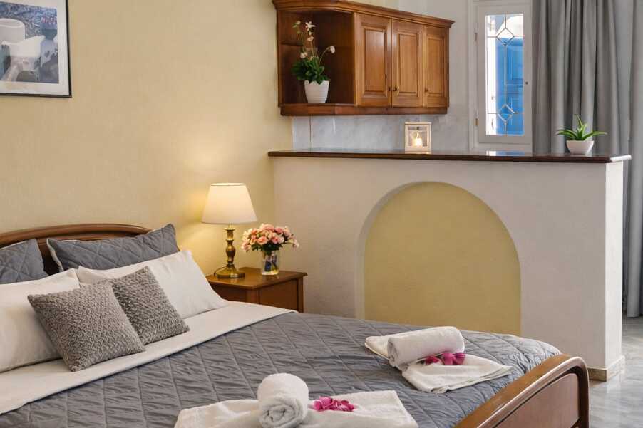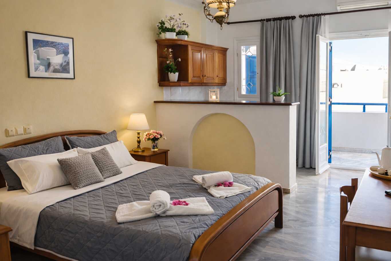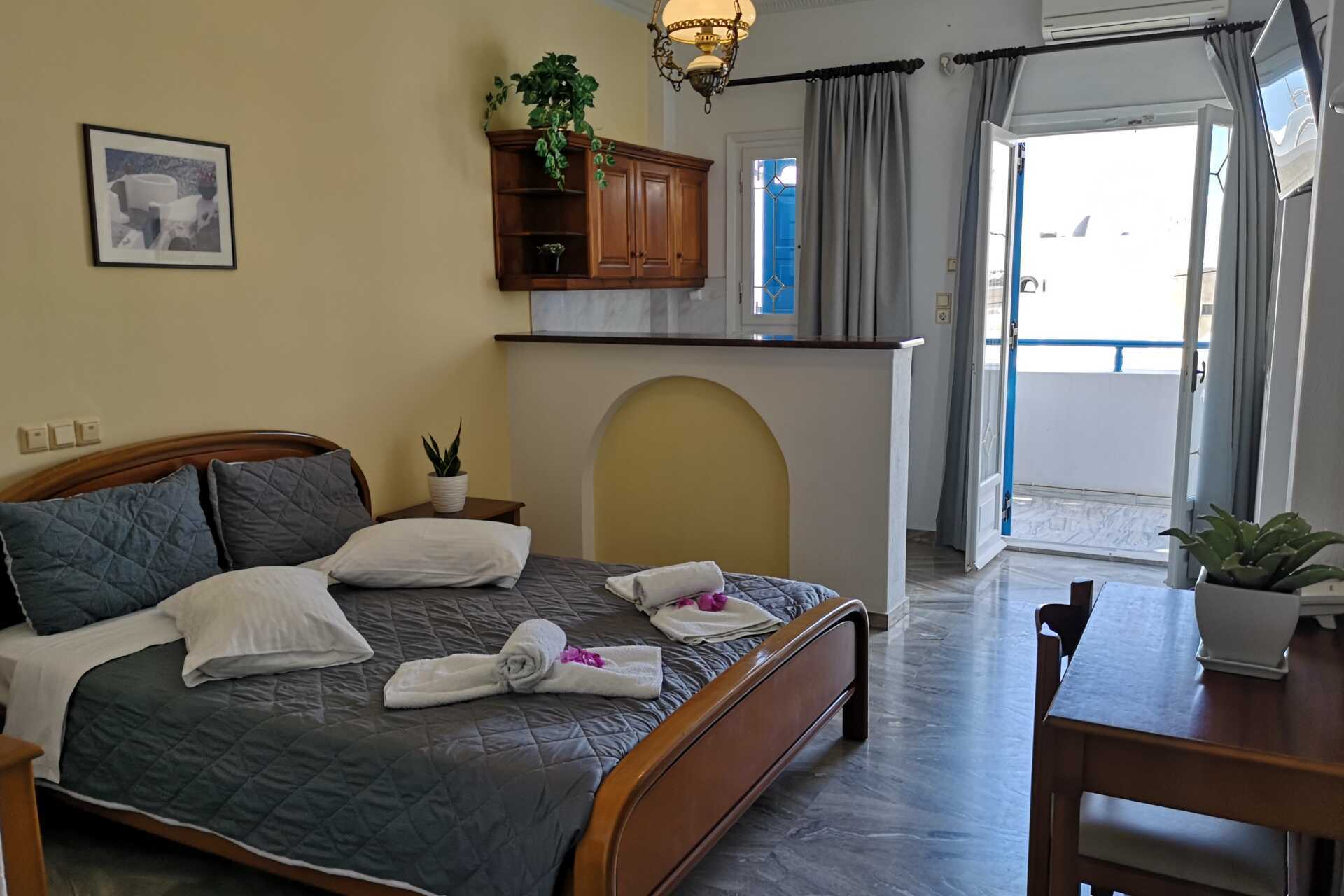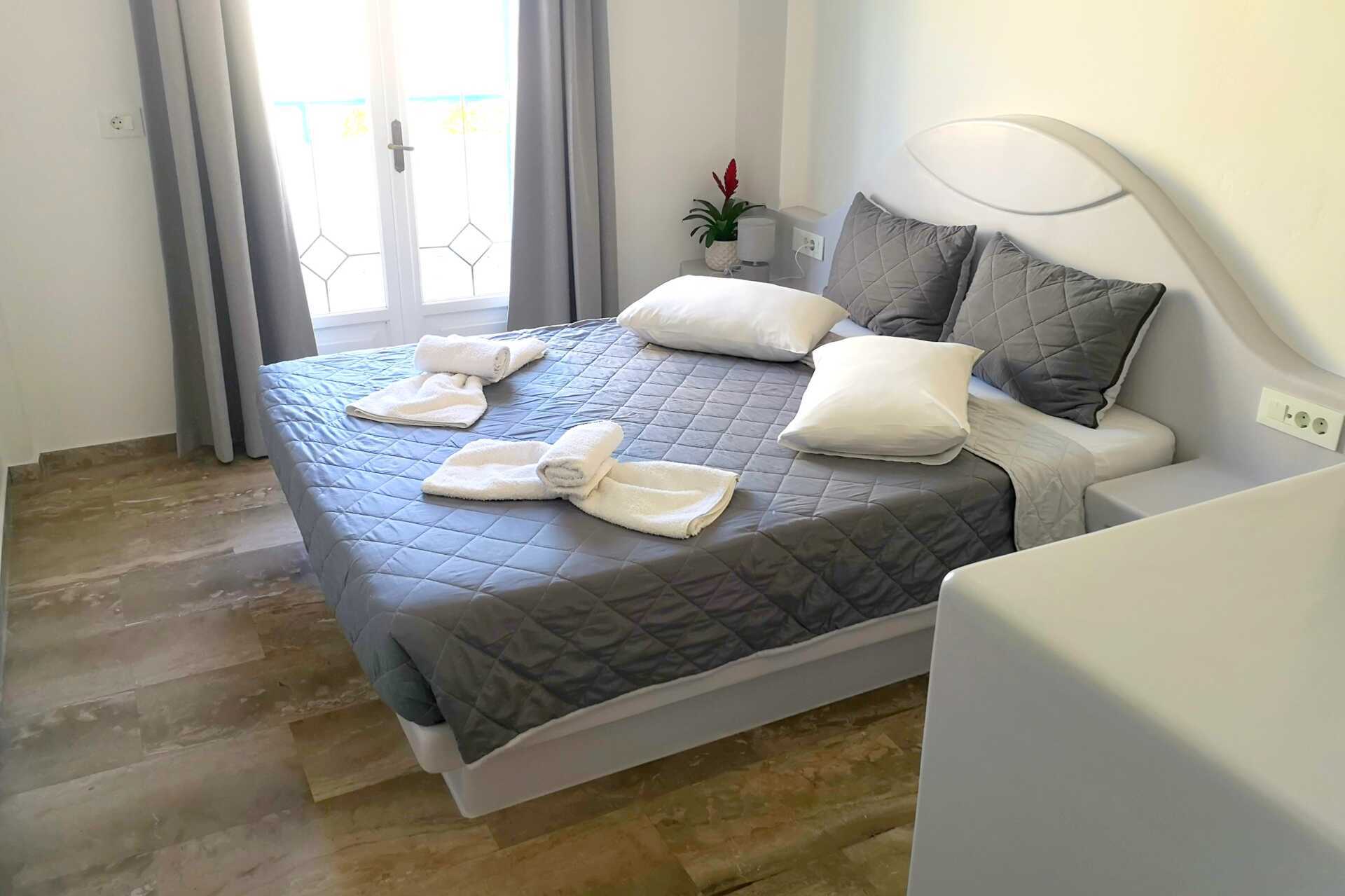 Større dobbeltrom med balkong. En dobbeltseng. Wifi, luftkondisjonering og safe inkludert. Kjøleskap. TV. Hårføner. Dusj og wc. Rengjøring 6 ggr/uke.