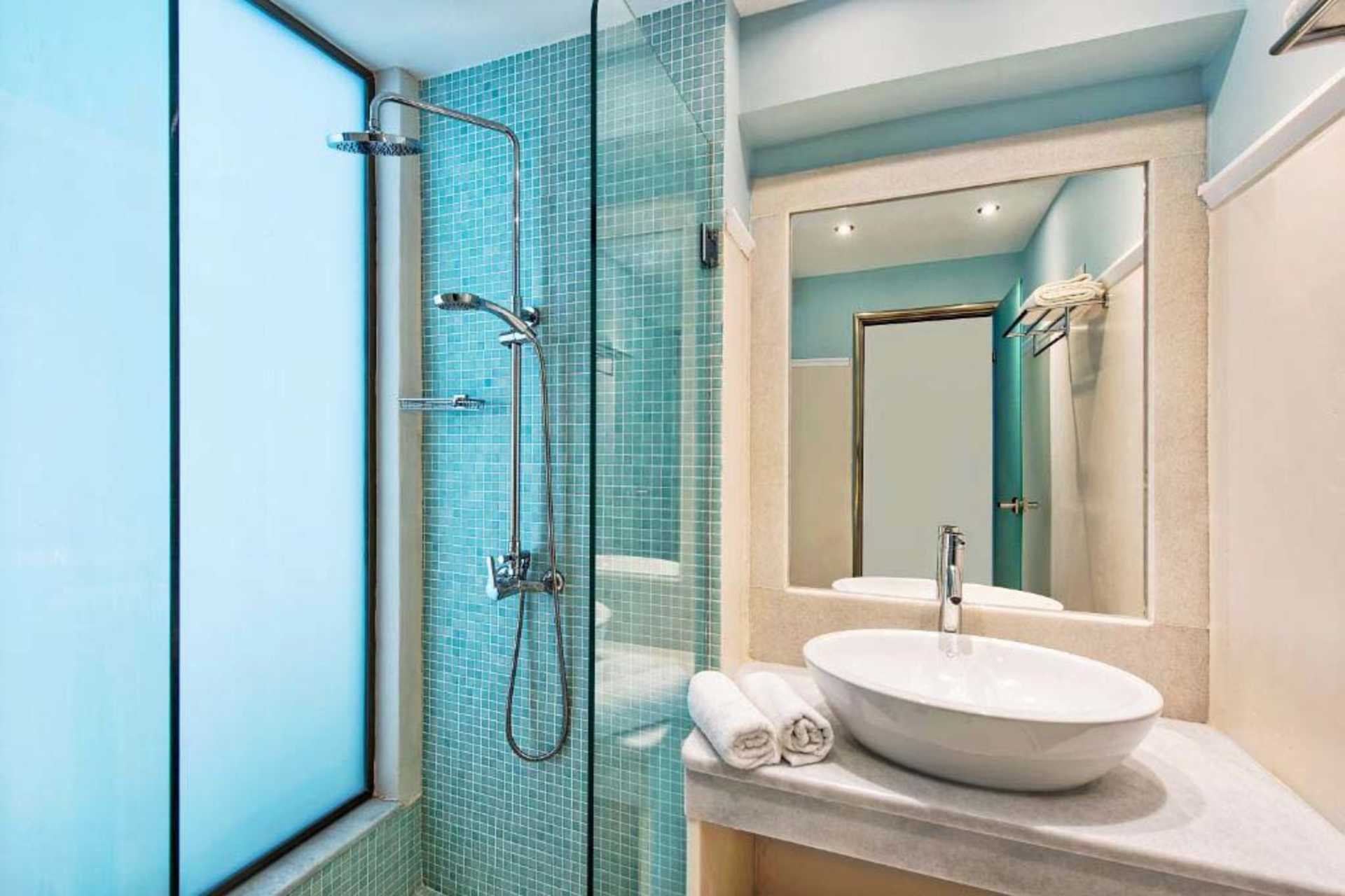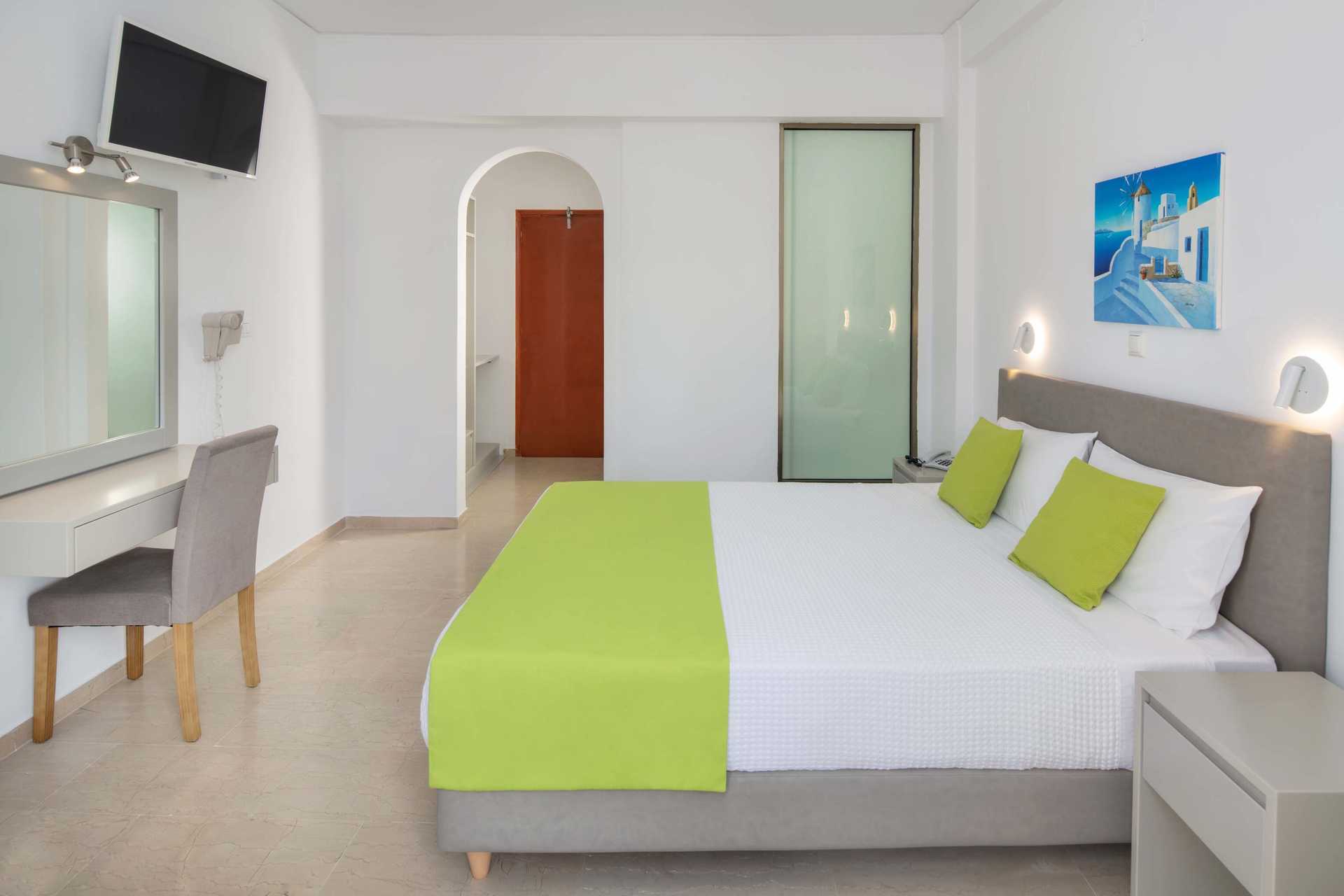 Trippelrom med balkong eller terrasse. En dobbeltseng og en enkeltseng eller tre enkeltsenger. Wifi, luftkondisjonering og safe er inkludert. Kjøleskap. TV. Hårføner. Baderom med dusj og wc. Rengjøring 6 ggr/uke.