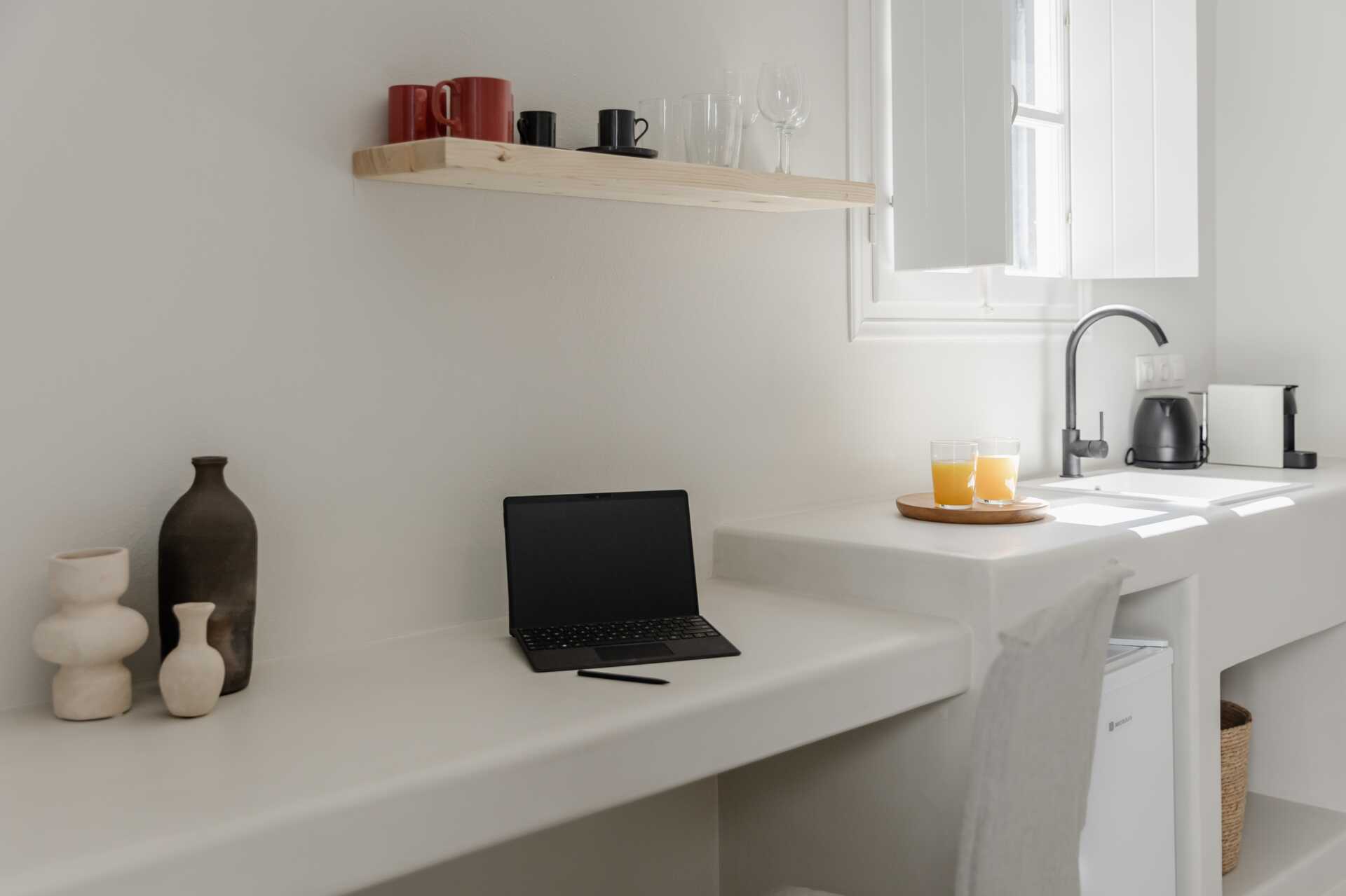 Suite med markterrasse eller med balkong i andre etasje. En dobbeltseng eller to enkeltsenger. Mulig med en ekstraseng i sovesofa. Wifi, luftkondisjonering og safe inkludert. Kjøleskap. Vannkoker. Nespresso kaffemaskin, kapsler mot avgift. TV. Hårføner. Baderom med dusj og wc. Rengjøring 7 ggr/uke.