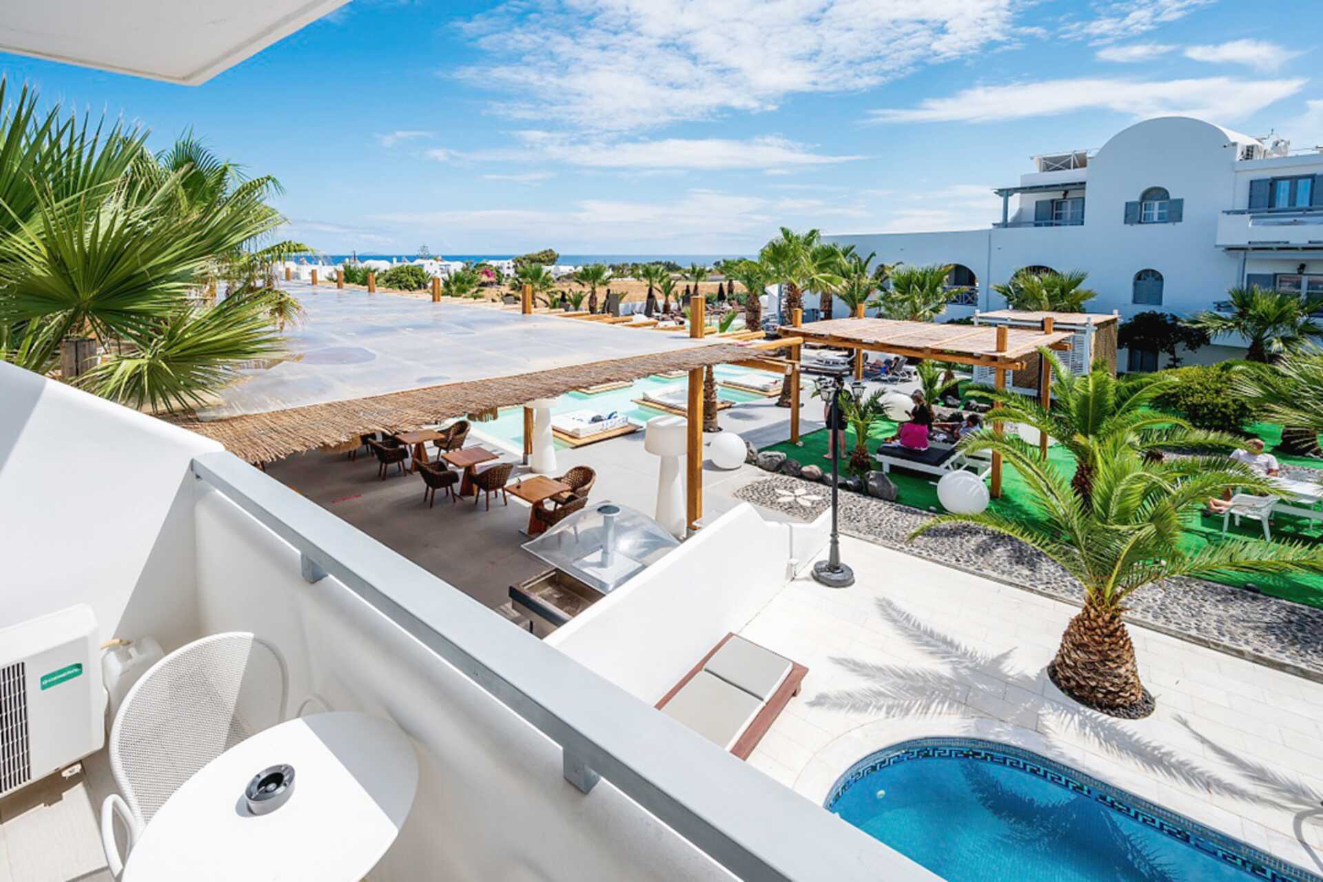 Juniorsuite med markterrasse og utgang til delt basseng. En dobbeltseng. Wifi, luftkondisjonering og safe inkludert. Vannkoker samt kaffe og te. TV. Hårføner. Badekar eller dusj samt wc. Rengjøring 7 ggr/uke.